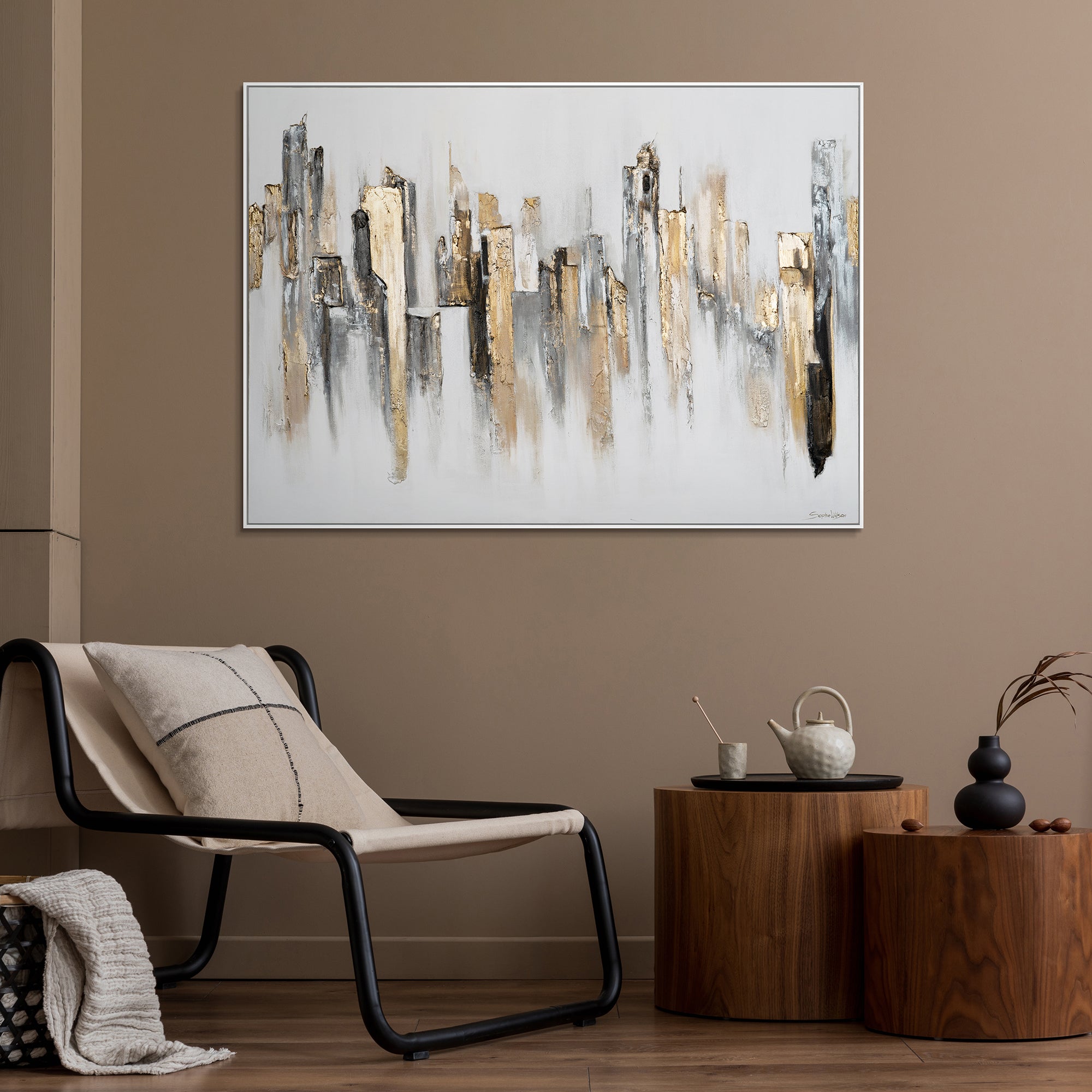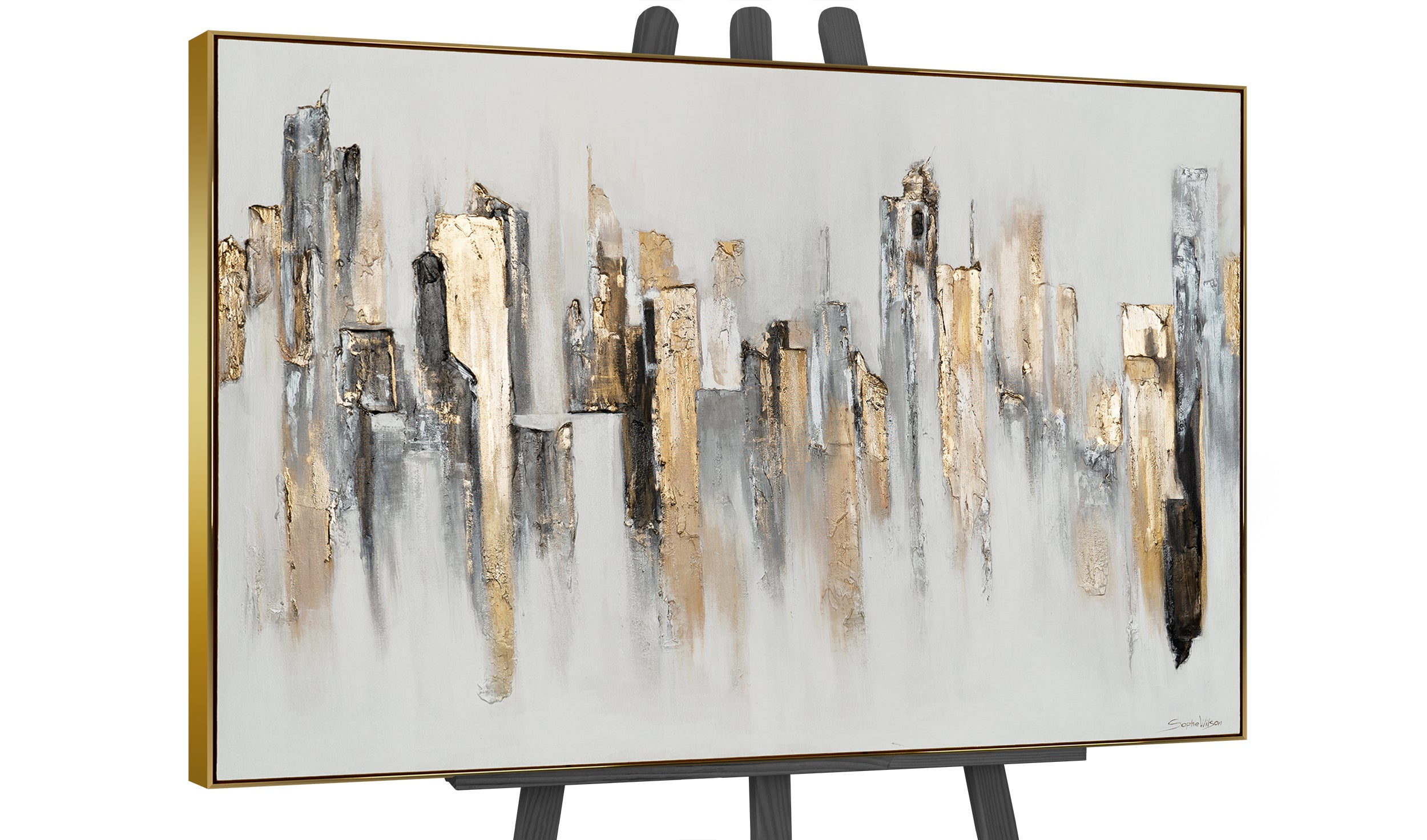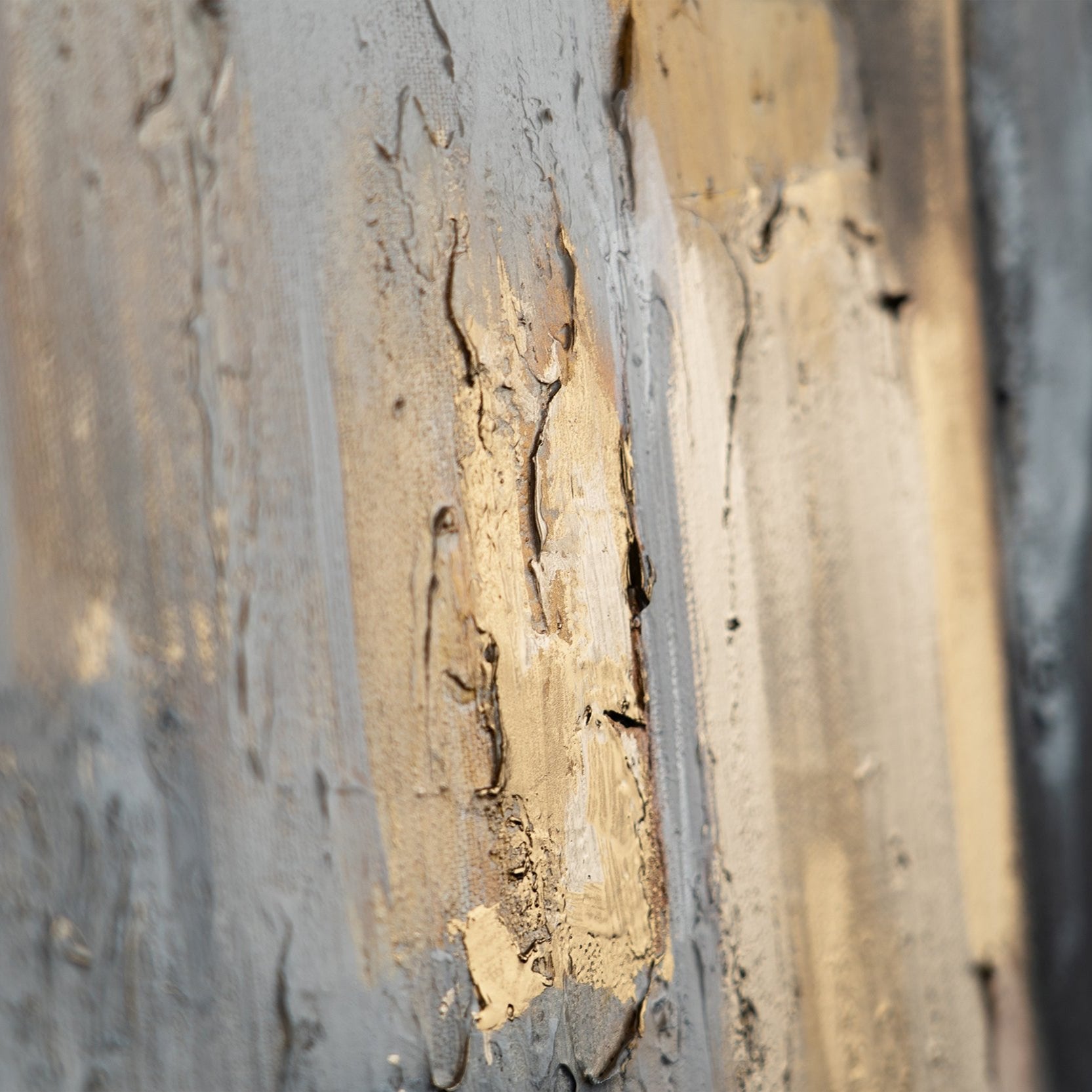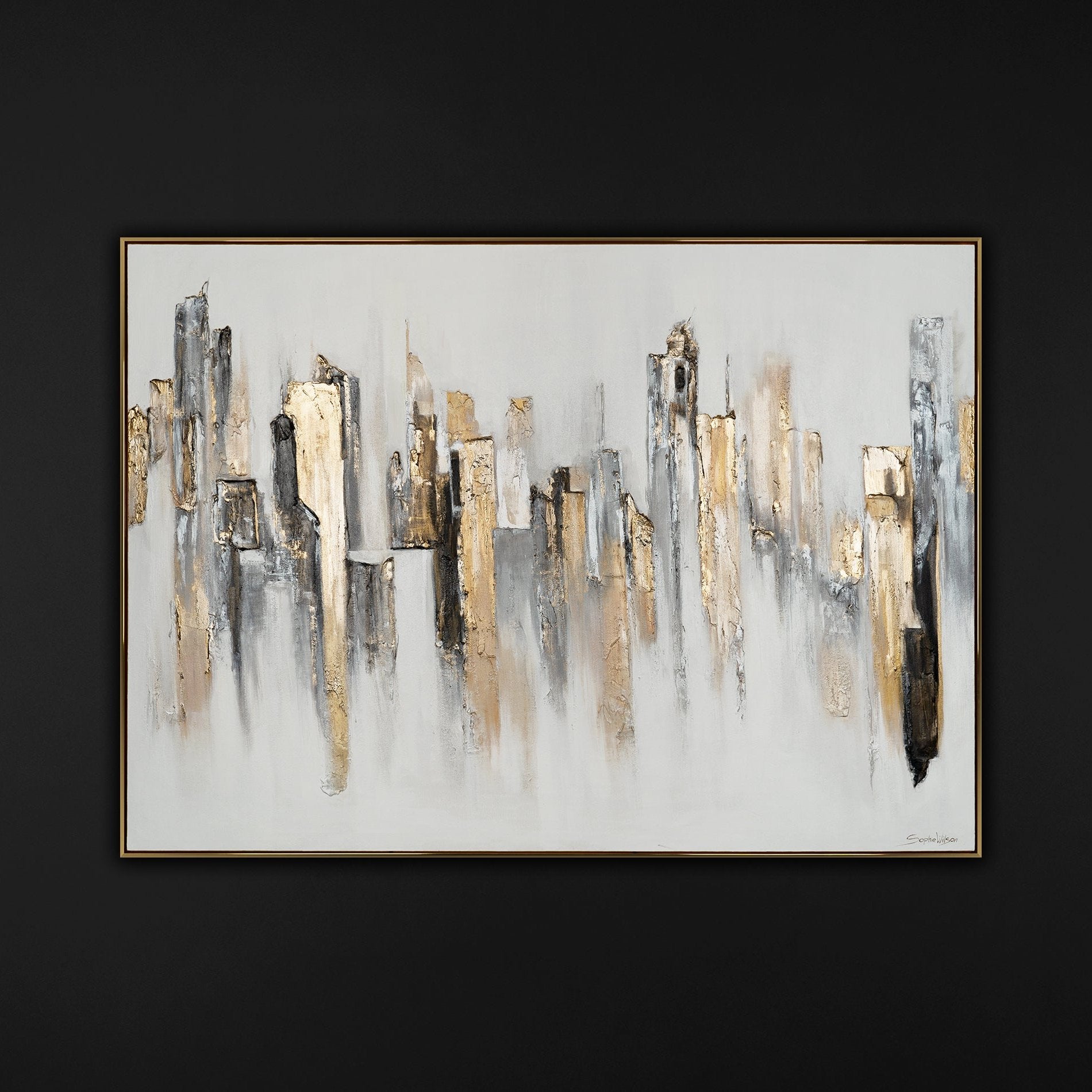 Dieses beeindruckende abstrakte Leinwandbild „Stadtrhythmen“ zieht die Blicke auf sich mit seinen sanften Grau- und Goldtönen. Die handgemalten Goldelemente verleihen dem Bild eine luxuriöse Ausstrahlung, während die abstrakte Stadtlandschaft eine moderne Atmosphäre schafft.