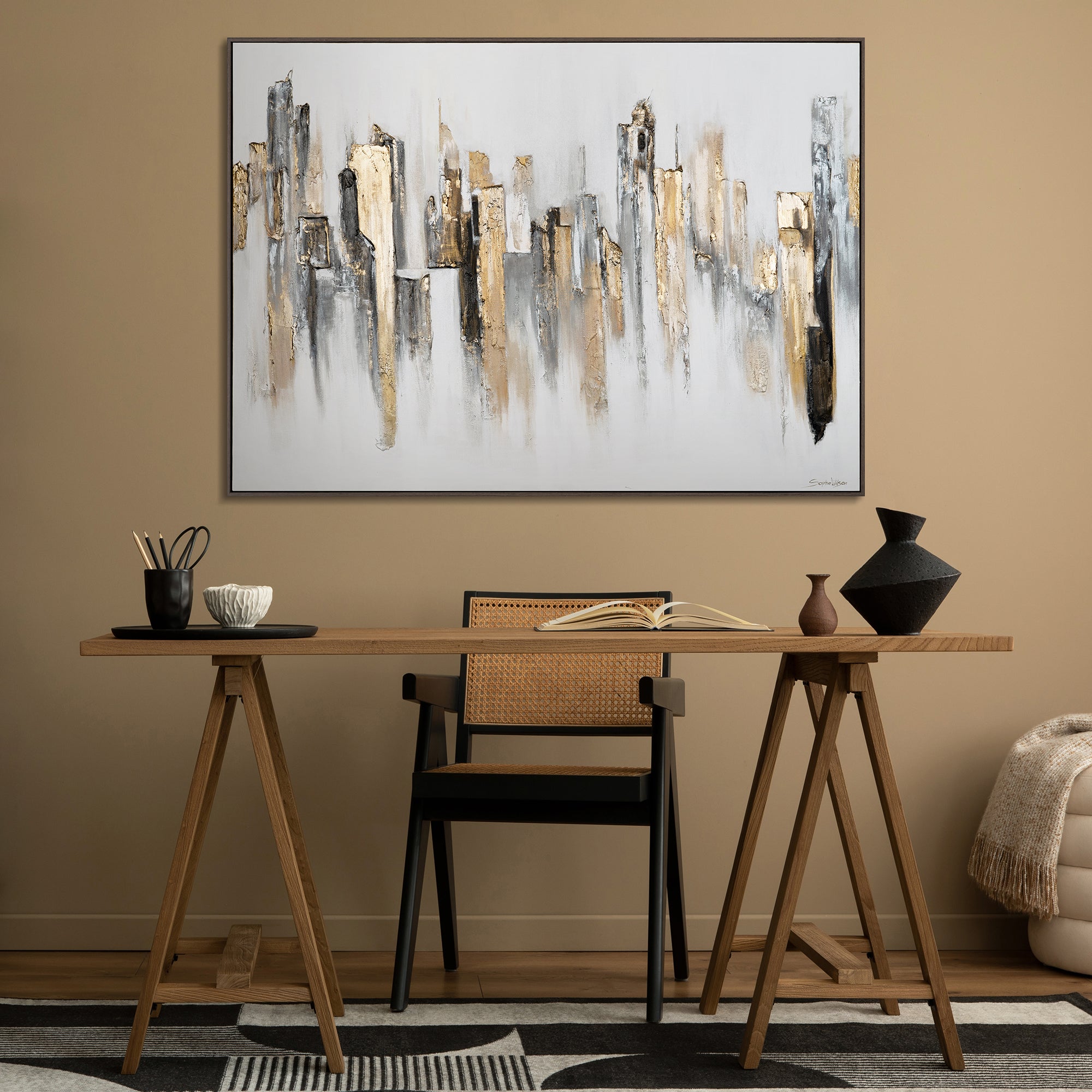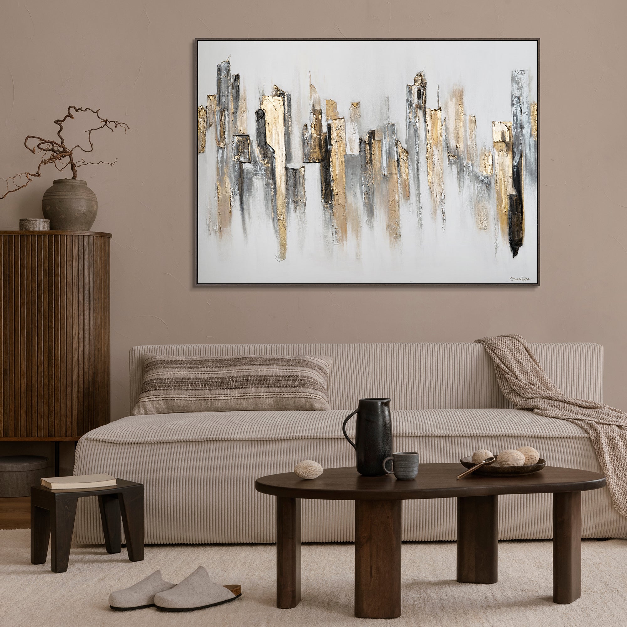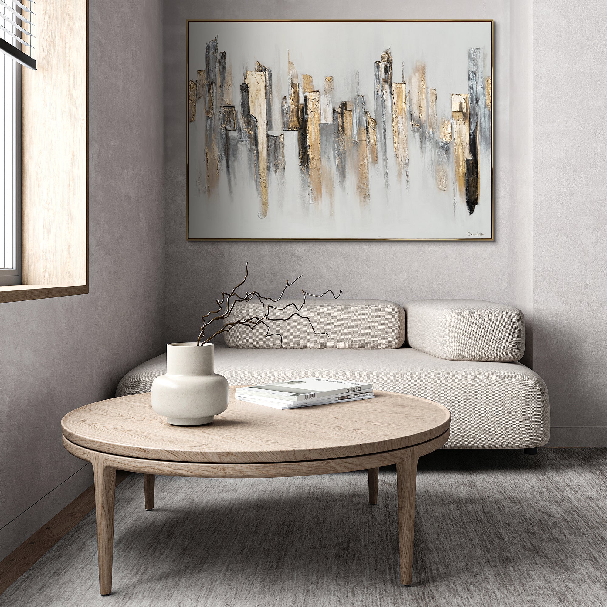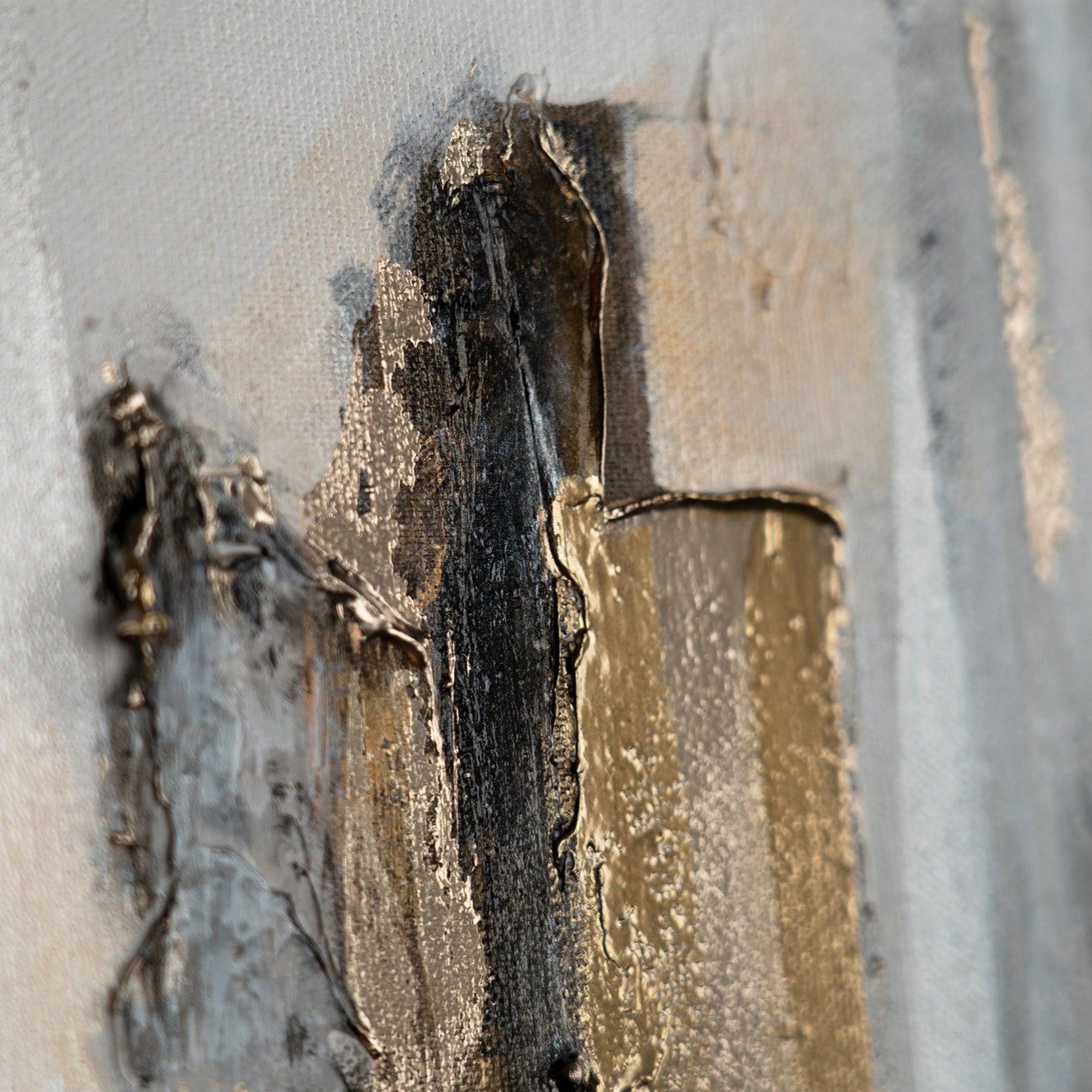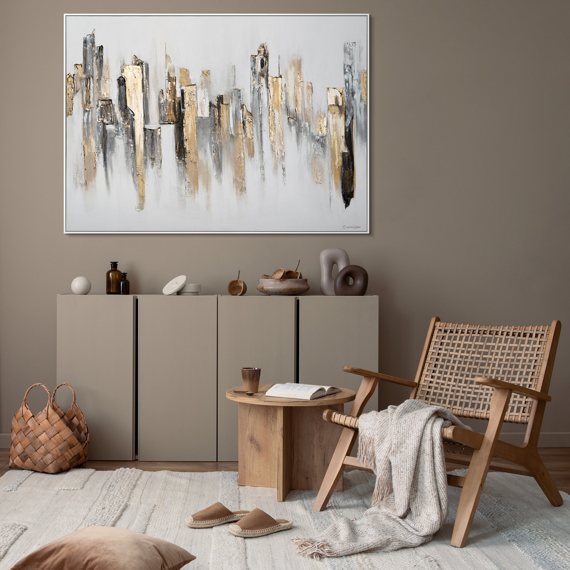 Dieses beeindruckende abstrakte Leinwandbild „Stadtrhythmen“ zieht die Blicke auf sich mit seinen sanften Grau- und Goldtönen. Die handgemalten Goldelemente verleihen dem Bild eine luxuriöse Ausstrahlung, während die abstrakte Stadtlandschaft eine moderne Atmosphäre schafft.