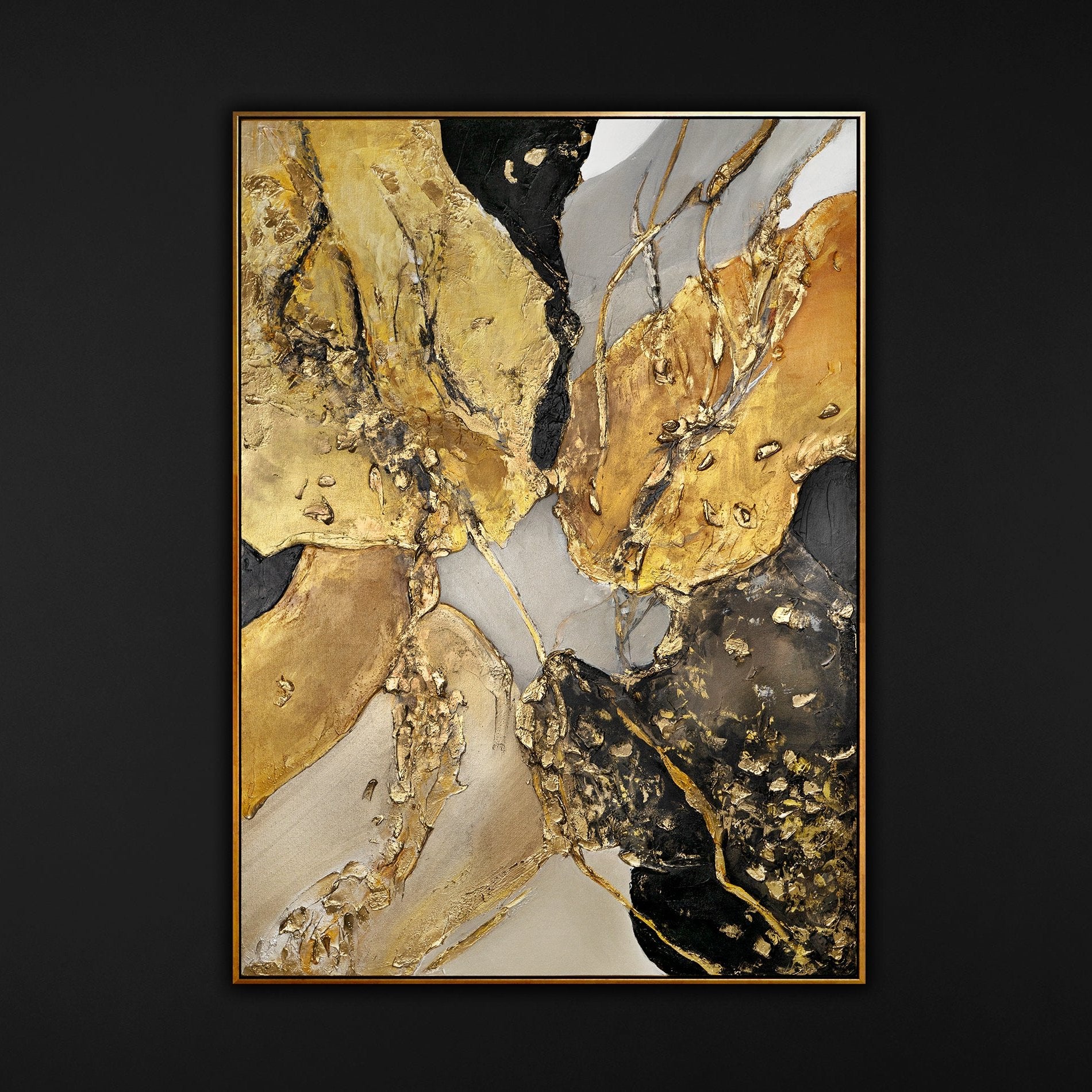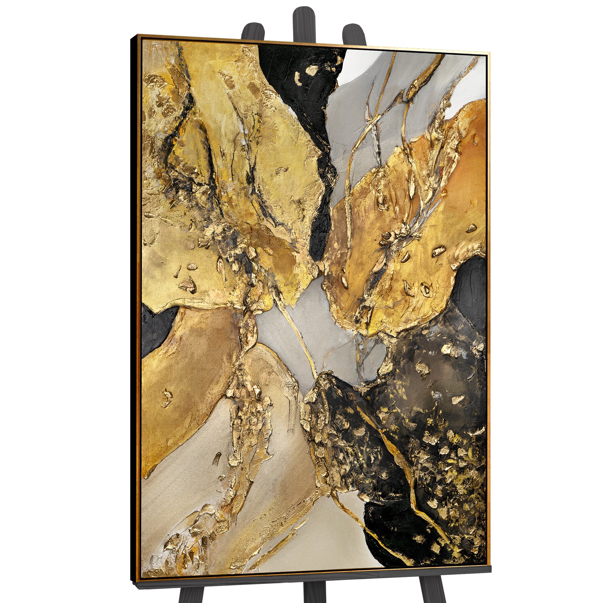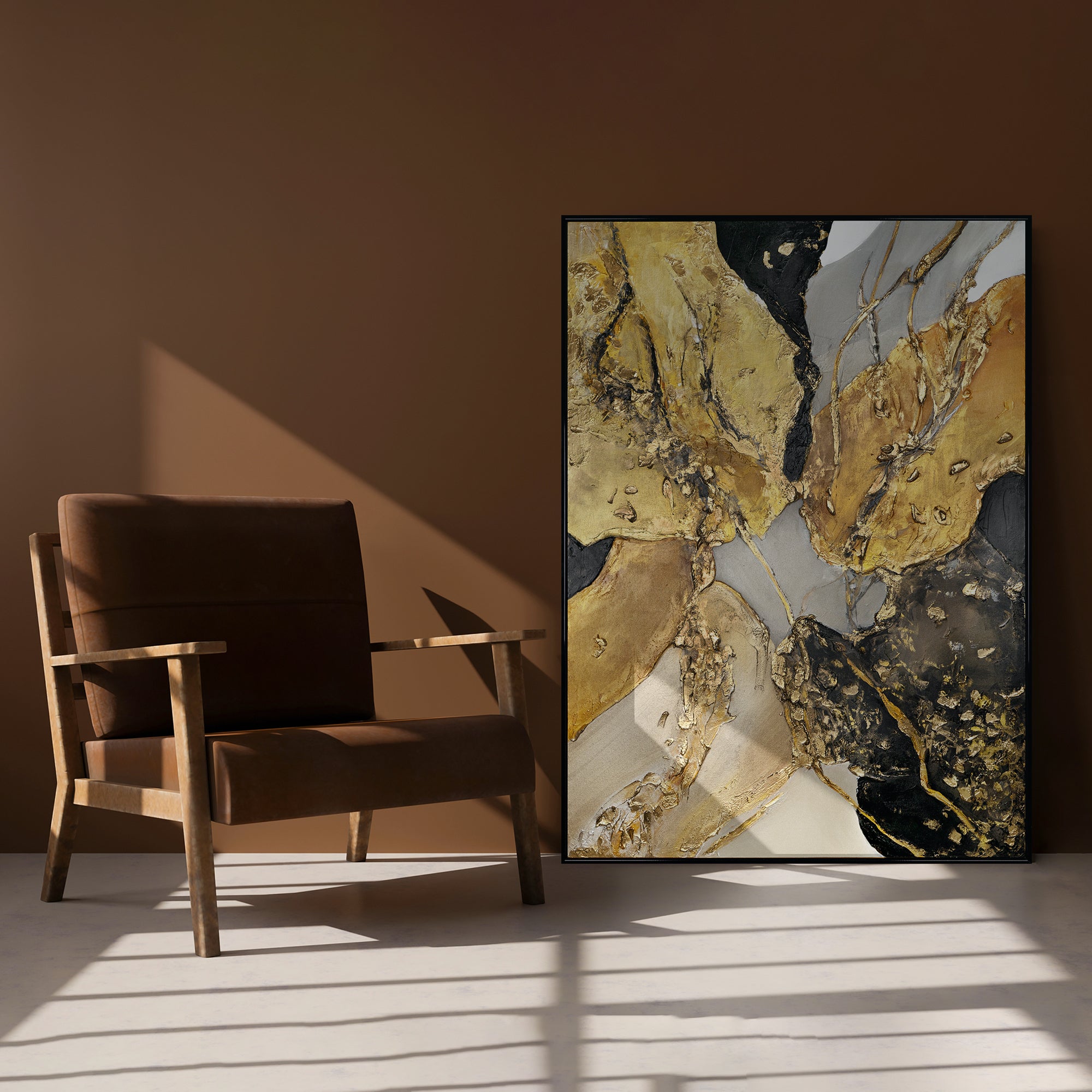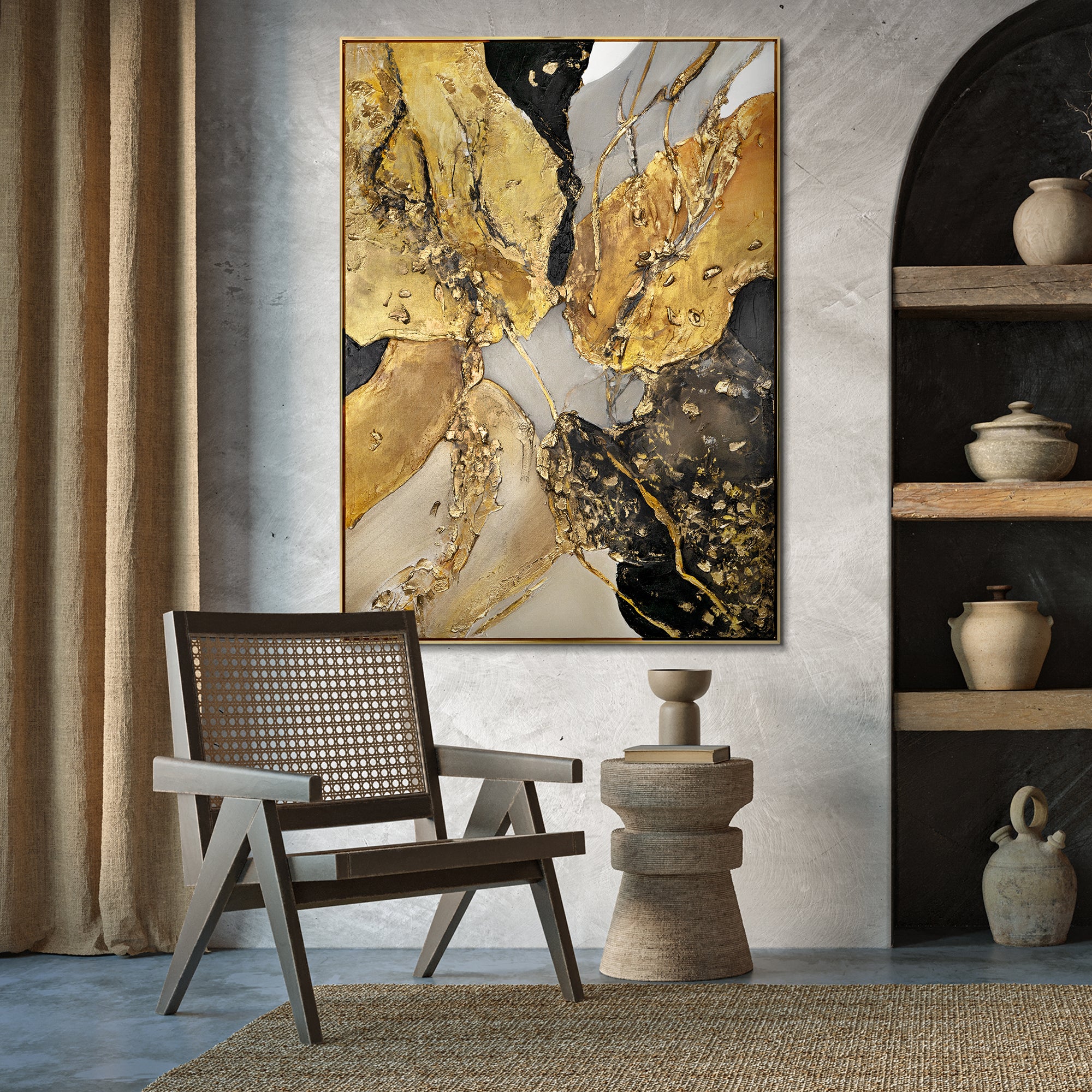 Dieses moderne Leinwandbild besticht durch seine edlen goldenen Akzente, die sich in einer abstrakten Komposition aus Schwarz, Gold und Beige vereinen. Die dynamischen Formen und das strukturierte Design verleihen dem Bild Tiefe und Dimension, während die goldenen Details Eleganz und Luxus in jeden Raum bringen.