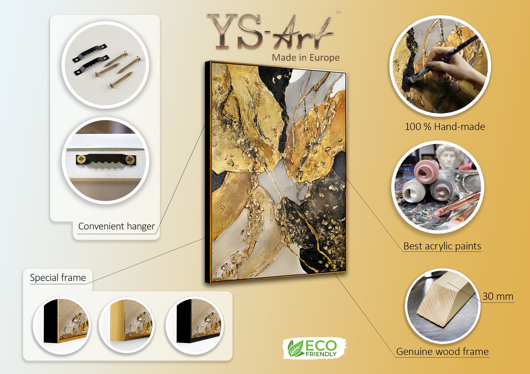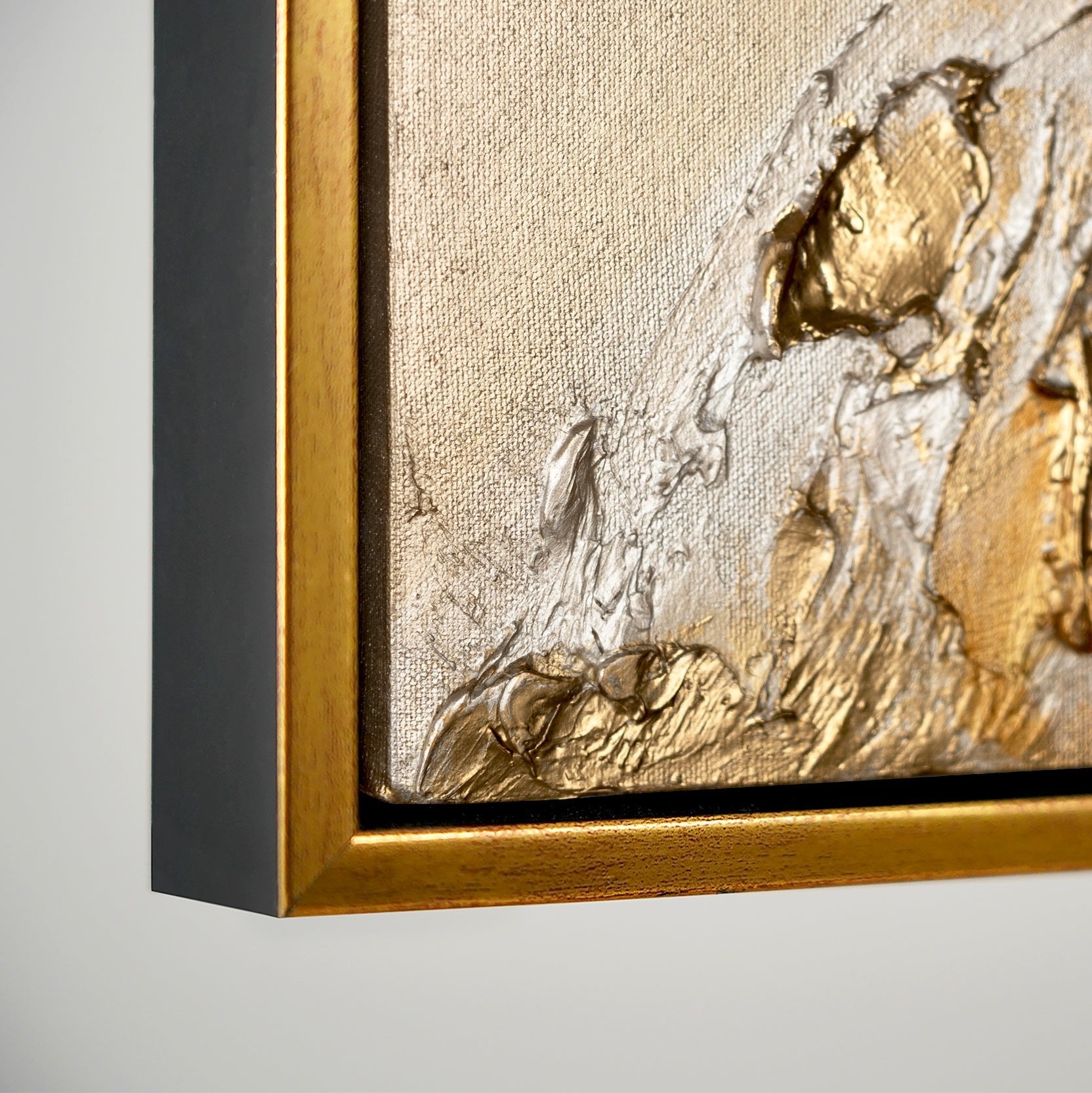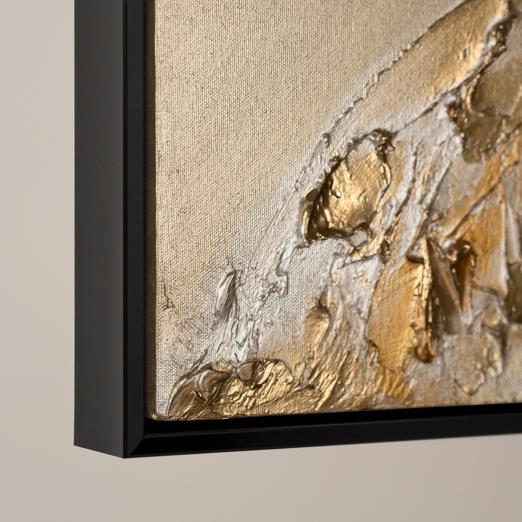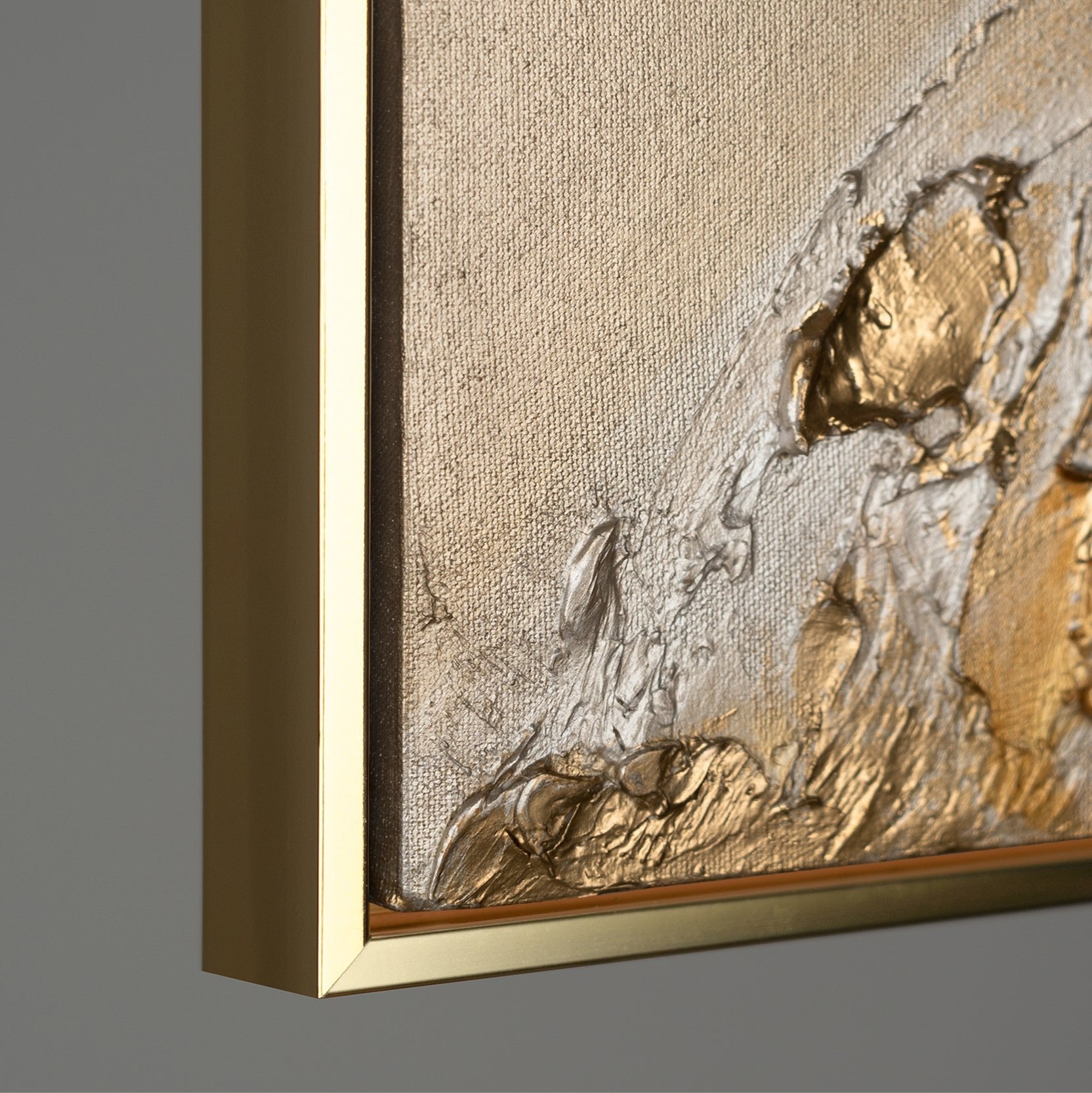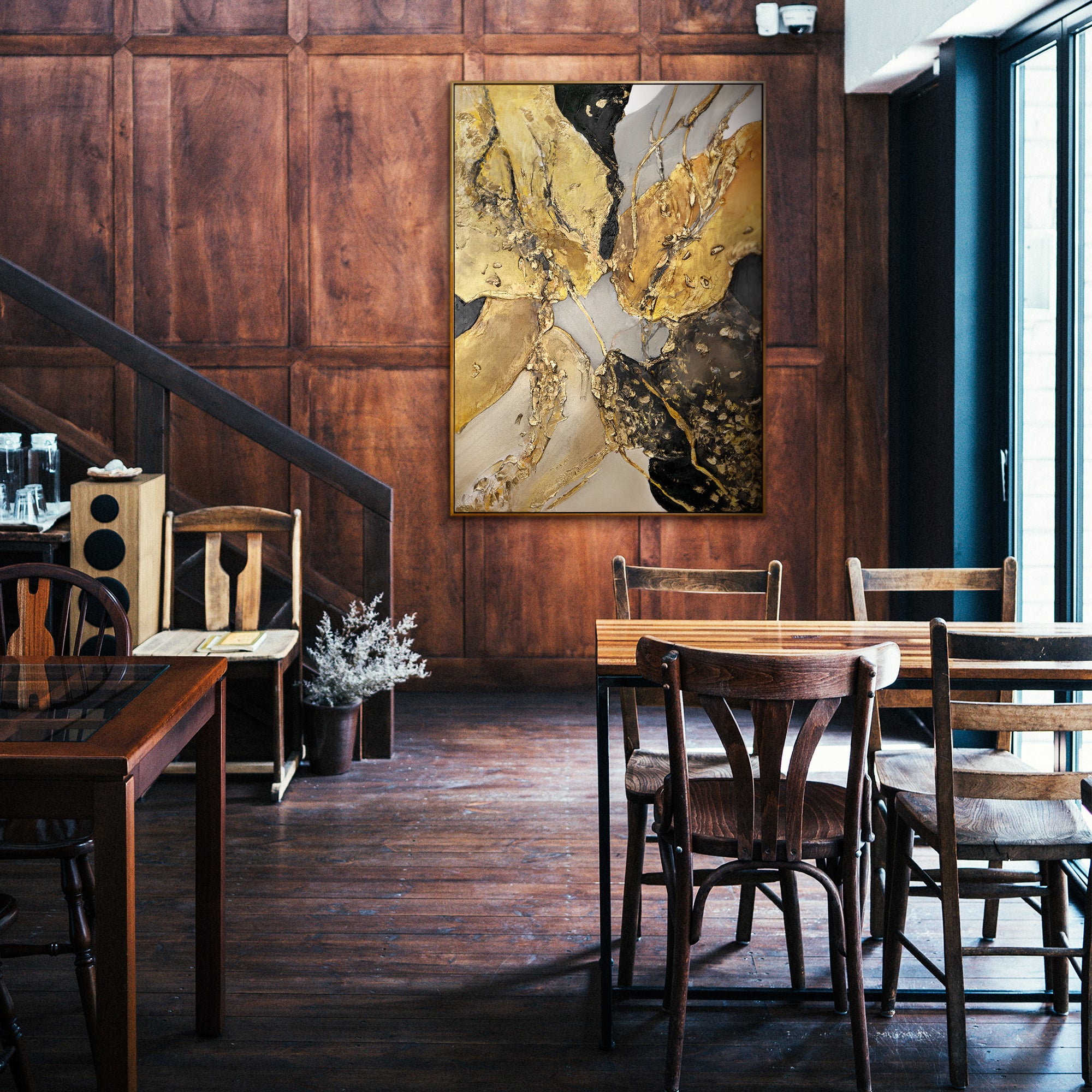 Dieses moderne Leinwandbild besticht durch seine edlen goldenen Akzente, die sich in einer abstrakten Komposition aus Schwarz, Gold und Beige vereinen. Die dynamischen Formen und das strukturierte Design verleihen dem Bild Tiefe und Dimension, während die goldenen Details Eleganz und Luxus in jeden Raum bringen.