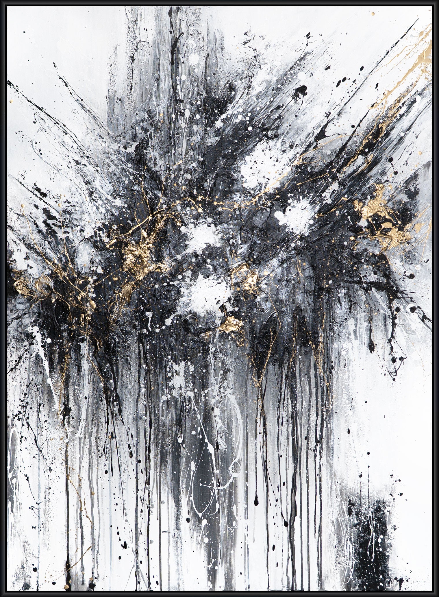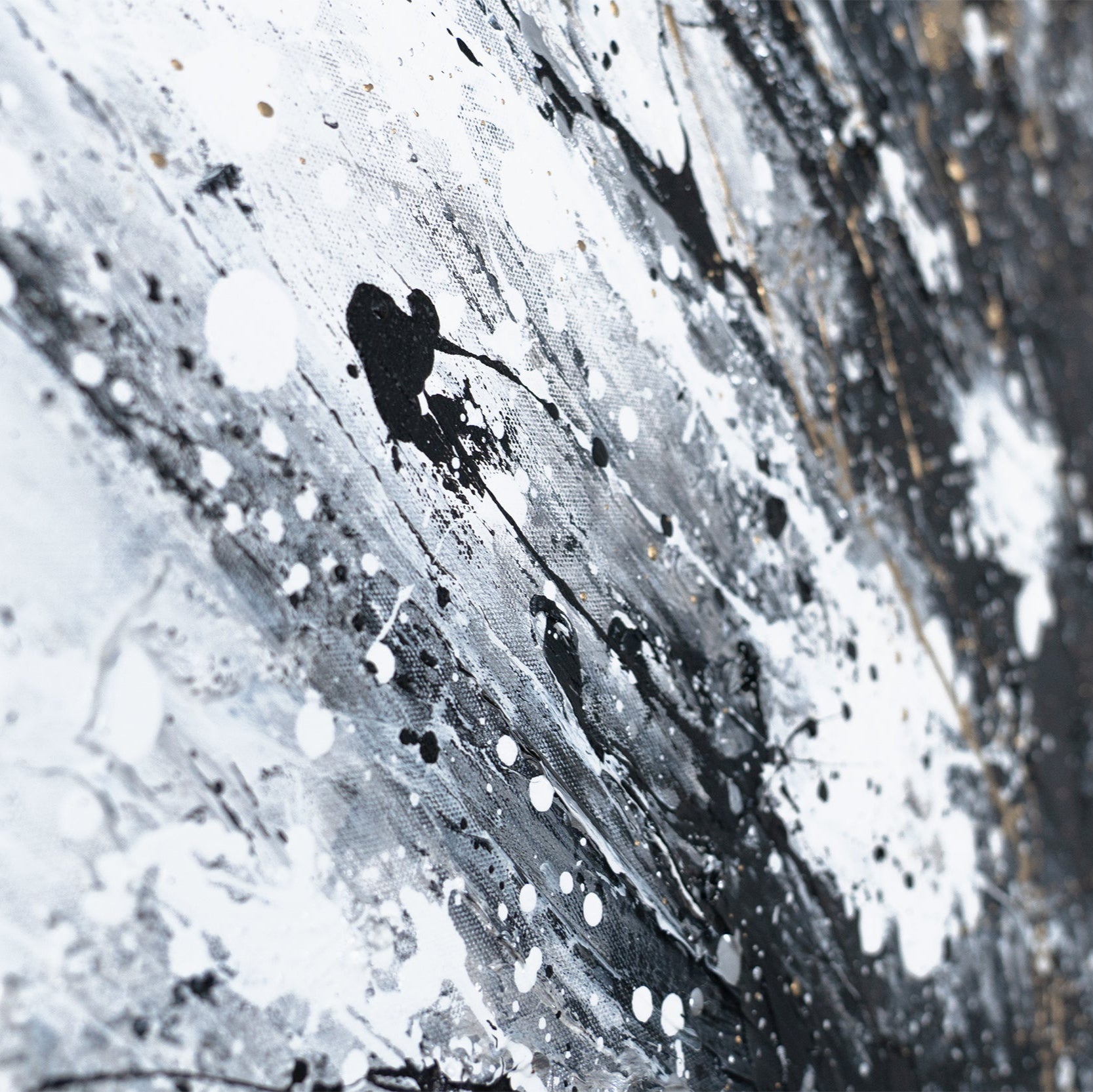 Ein dynamischer Ausbruch aus Linien, Tropfen und Farbexplosionen dominiert dieses abstrakte Kunstwerk in Schwarz, Weiß und Gold. Das Gemälde wirkt wie eine spontane Energieentladung auf der Leinwand – kraftvoll, unkontrolliert und doch harmonisch im Zusammenspiel. Die goldenen Akzente verleihen der Komposition einen Hauch von Eleganz und Tiefe, während die strukturierte Oberfläche das Licht unterschiedlich reflektiert.