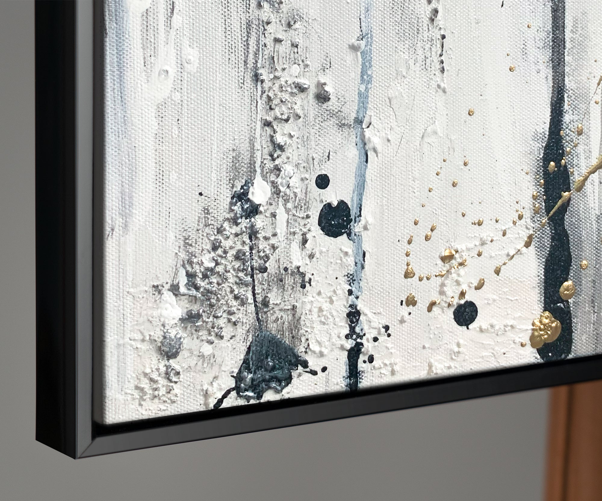 Abstraktes Leinwandbild mit Rahmen „Energie der Linien“ – monochrome Kunst mit Gold