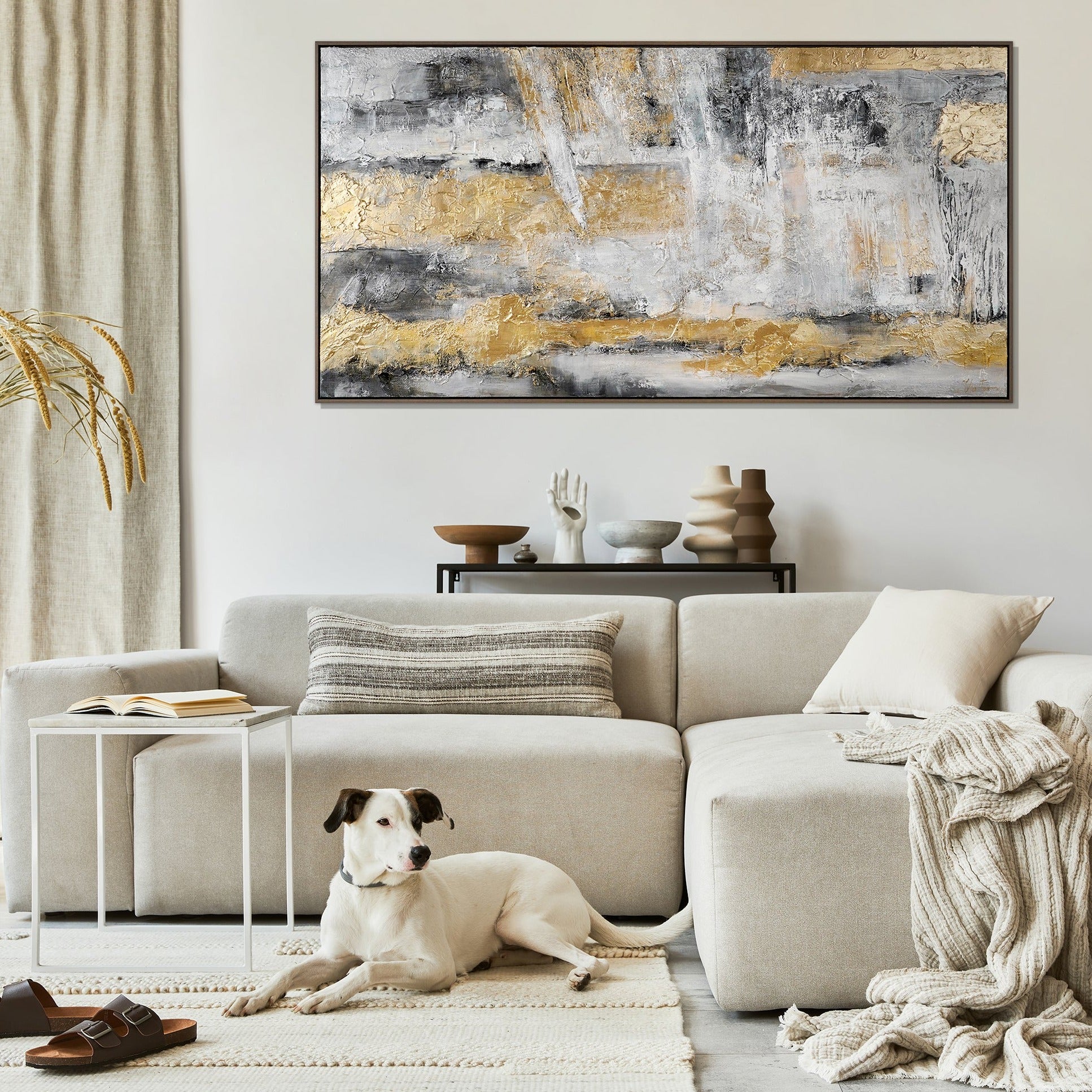 In diesem abstrakten Gemälde treffen goldene Strukturflächen auf weiche graue und weiße Töne. Die horizontal verlaufende Komposition erzeugt eine harmonische Balance zwischen Bewegung und Ruhe. Das Bild wirkt wie ein lichtdurchfluteter Horizont inmitten einer abstrakten Landschaft und verleiht jedem Raum eine noble Ausstrahlung.