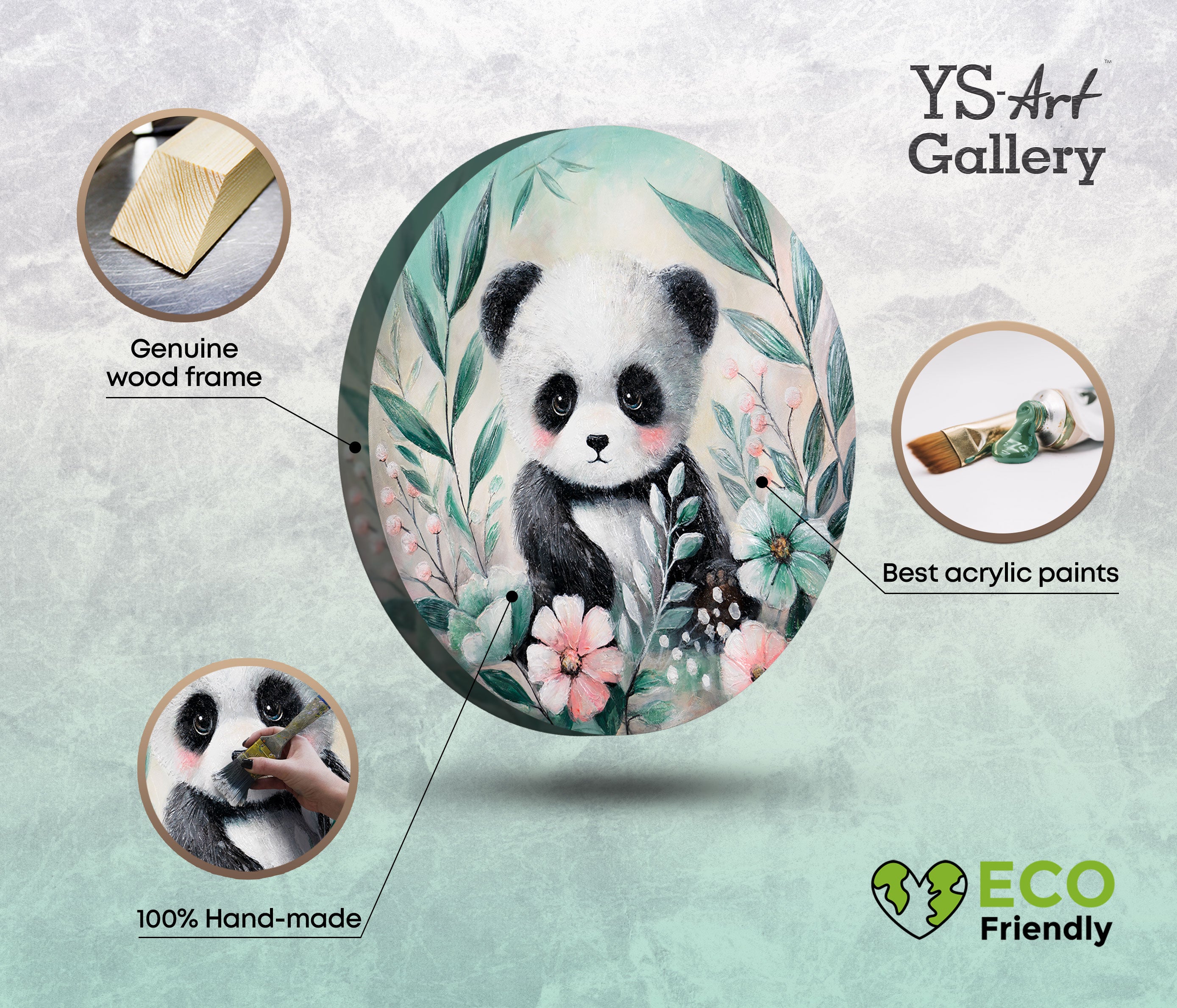 „Waldpanda“ ist ein rundes, handgemaltes Acrylbild, das einen niedlichen Pandabären inmitten zarter Blumen und grüner Blätter zeigt. Die weichen Farben und liebevollen Details verleihen dem Motiv einen traumhaften, kindgerechten Charakter. Der Panda mit seinen großen Augen strahlt Ruhe, Sanftheit und Geborgenheit aus.