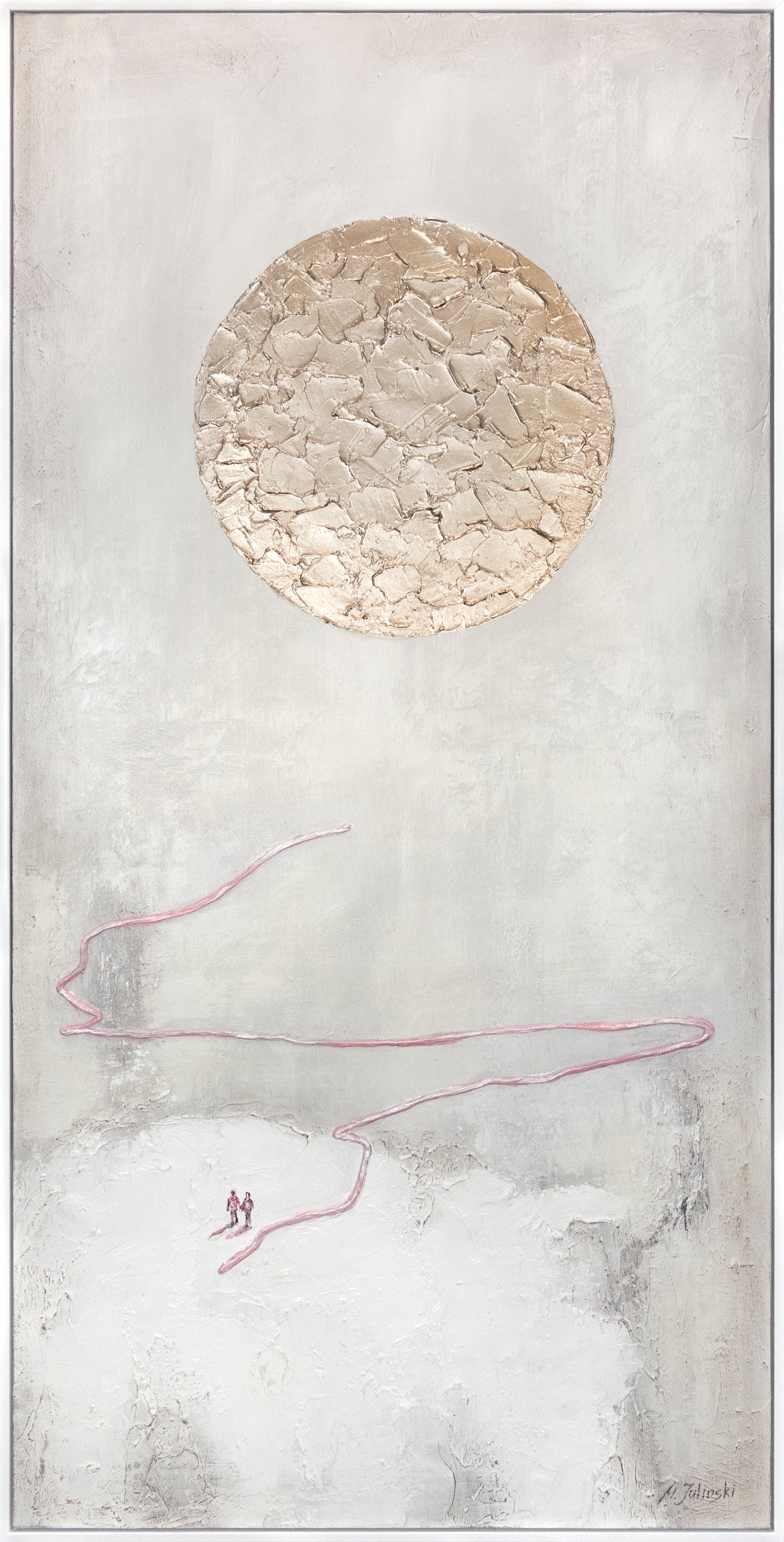 „Weg zur Sonne“ ist ein elegantes, modernes Acrylgemälde mit goldenen Akzenten auf weiß-grauer Struktur. Die angedeuteten Bergformationen verleihen dem Bild Tiefe und symbolisieren den Aufstieg zur Erleuchtung und Harmonie. Goldene Highlights auf matter Oberfläche sorgen für edlen Kontrast und strahlen Ruhe aus.