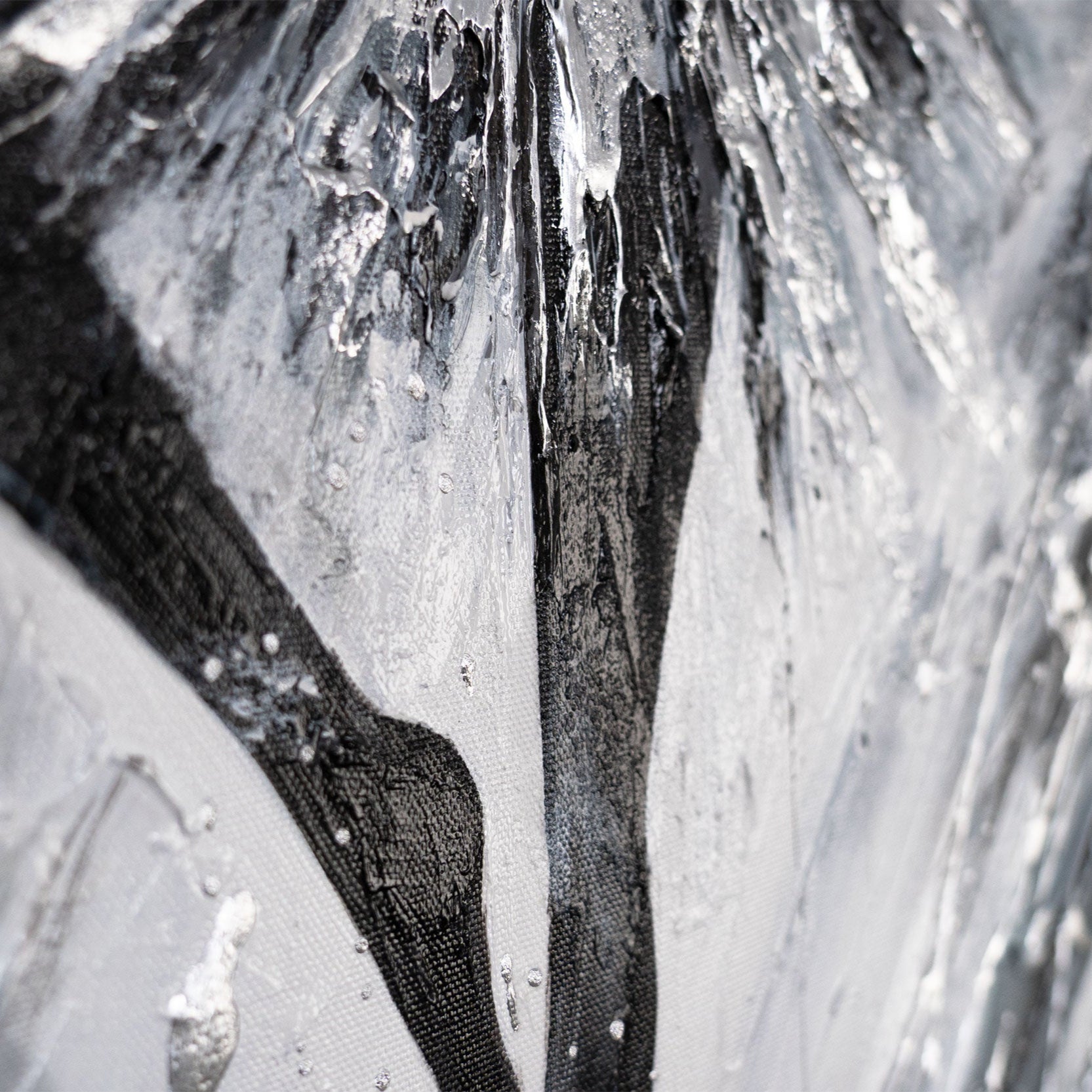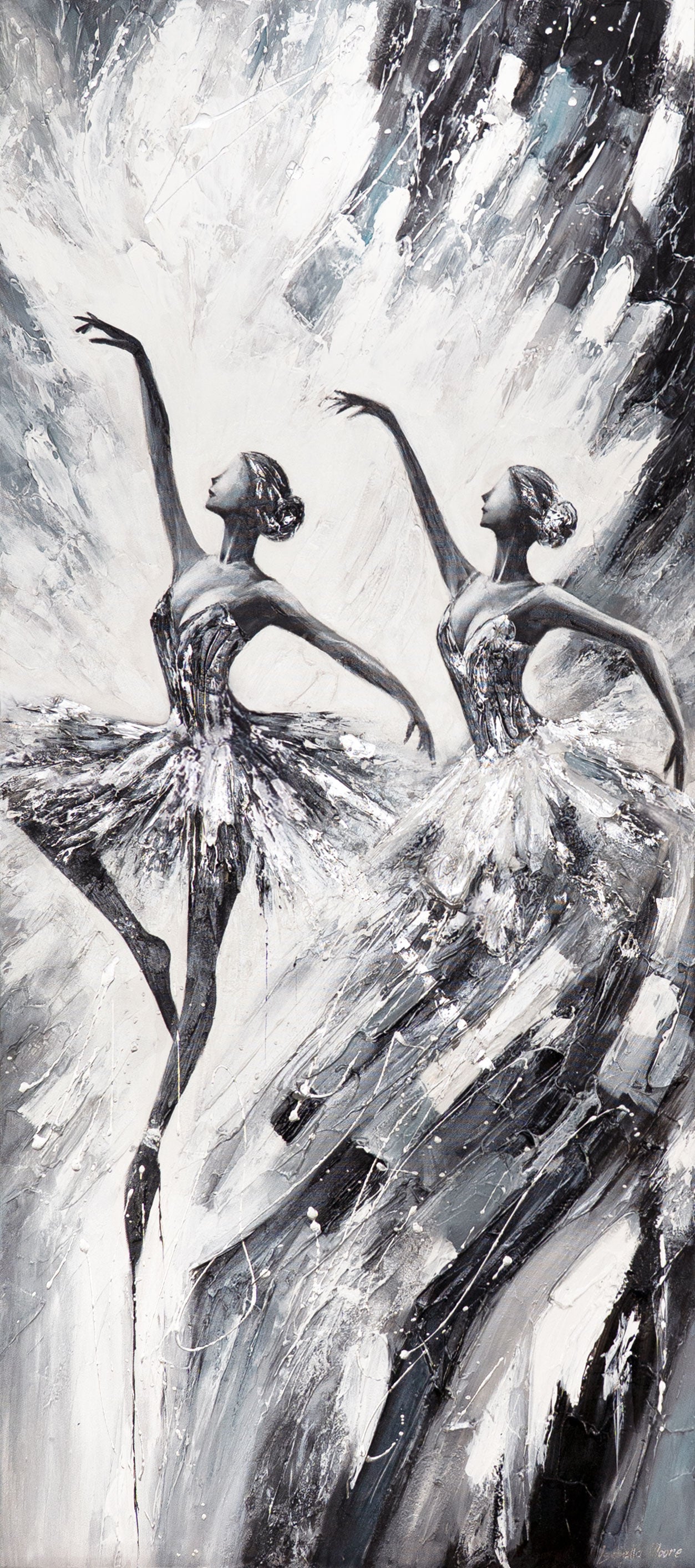„Die Kraft der Anmut“ ist ein handgemaltes Acrylbild auf Leinwand, das in expressiven Pinselstrichen zwei Ballerina‑Figuren in dynamischer Leichtigkeit darstellt. Die reduzierte Farbpalette aus Schwarz, Weiß und Grau lässt das Motiv zeitlos wirken und betont die Bewegung.