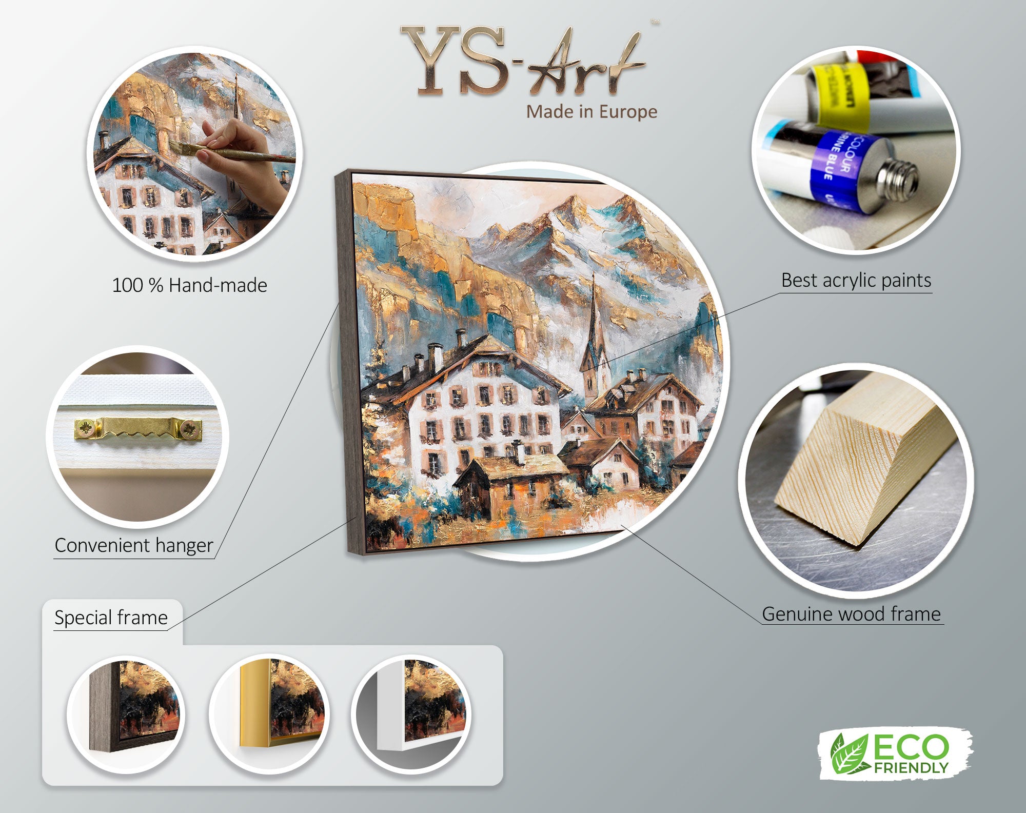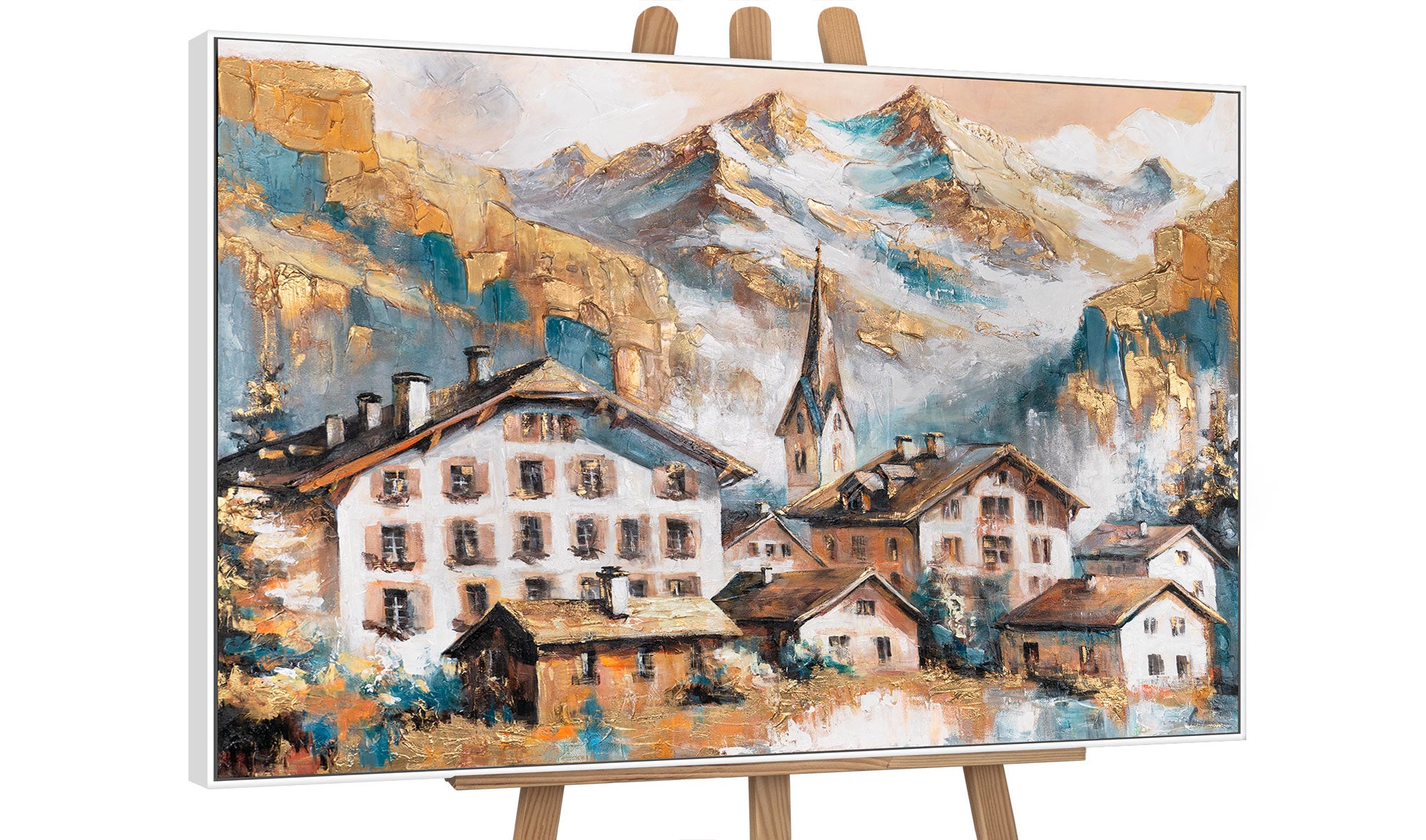 • Gemälde Bergdorf mit Goldrahmen – Acryl auf Leinwand