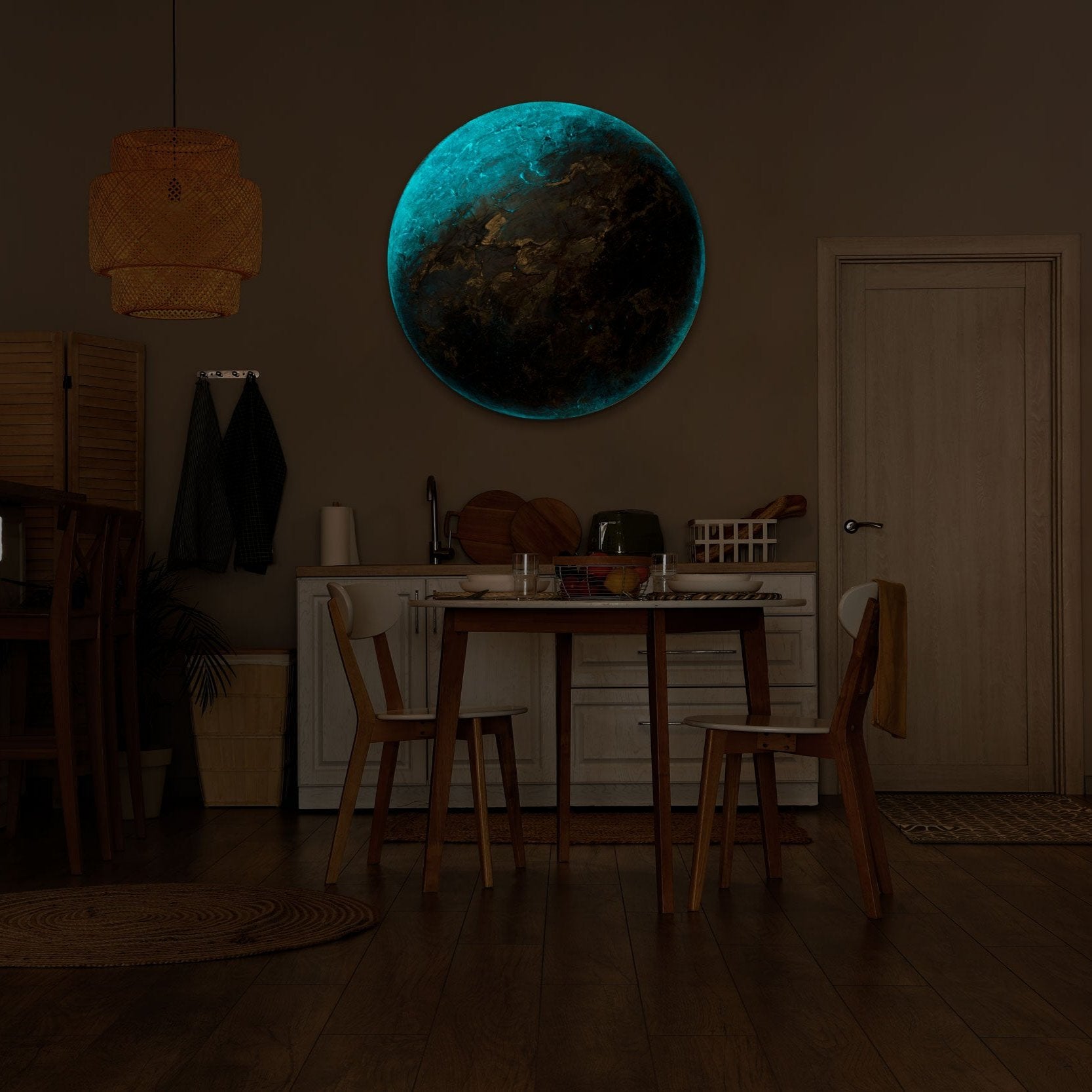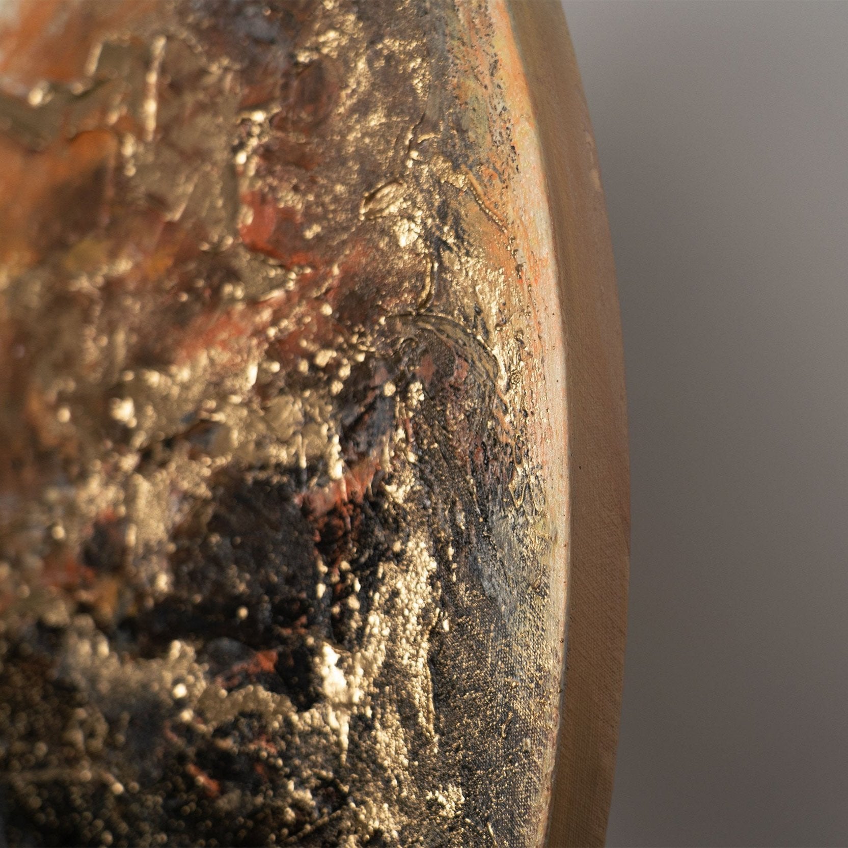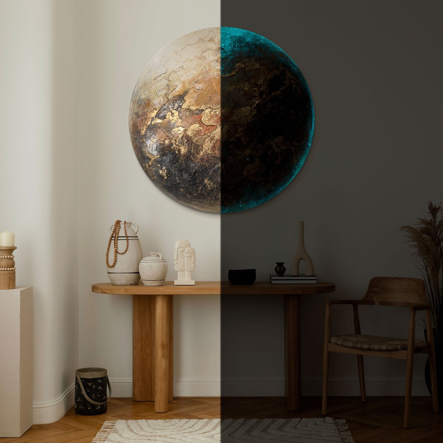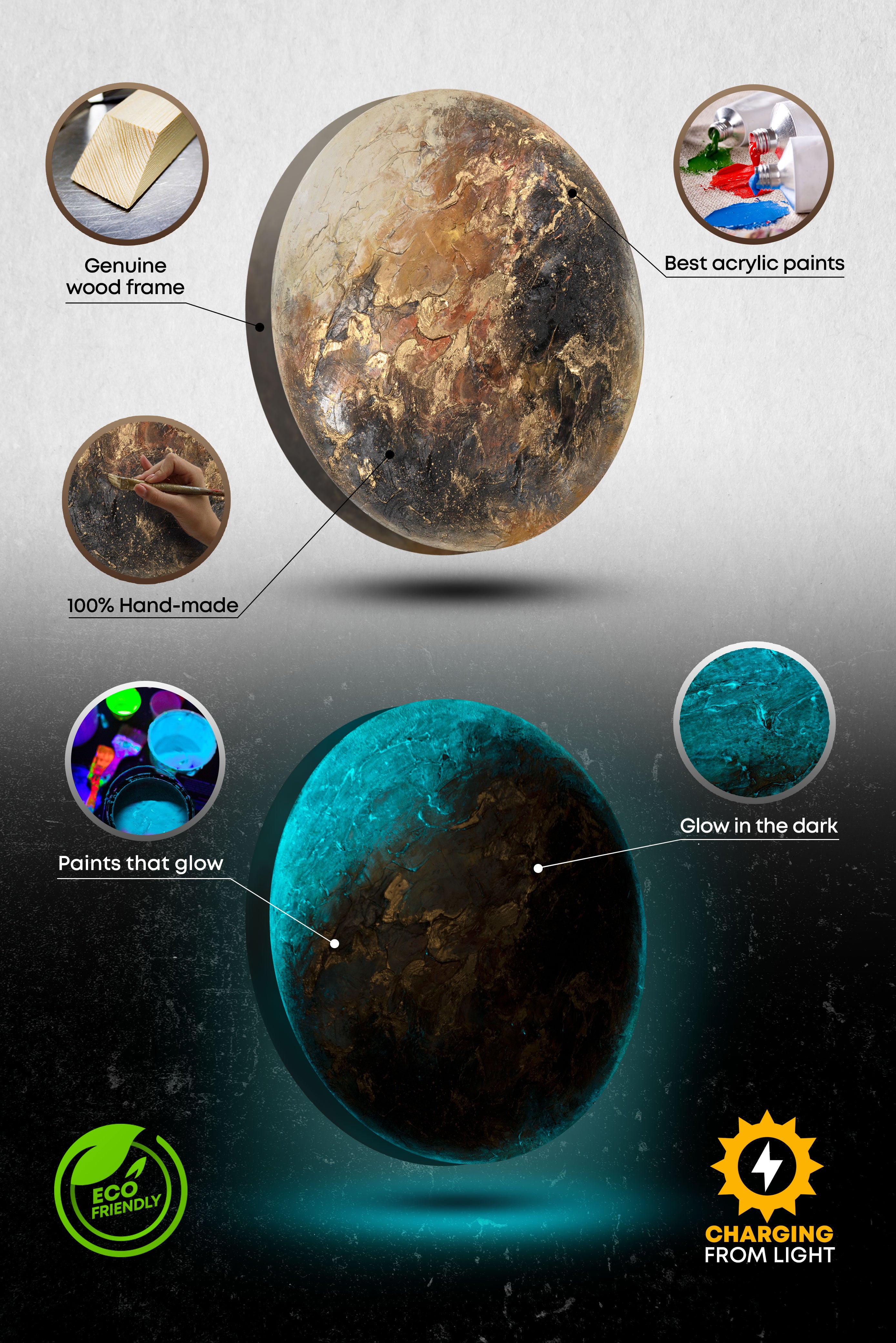 Dekorieren Sie Ihr Zuhause oder Ihr Büro mit der faszinierenden „Venus“, einem handgemalten runden Acrylbild, das die Schönheit des Planeten einfängt. Dieses Kunstwerk leuchtet im Dunkeln dank einer speziellen Leuchtfarbe und kombiniert meisterhaft goldene, braune und schwarze Texturen, die eine luxuriöse und dynamische Atmosphäre schaffen.