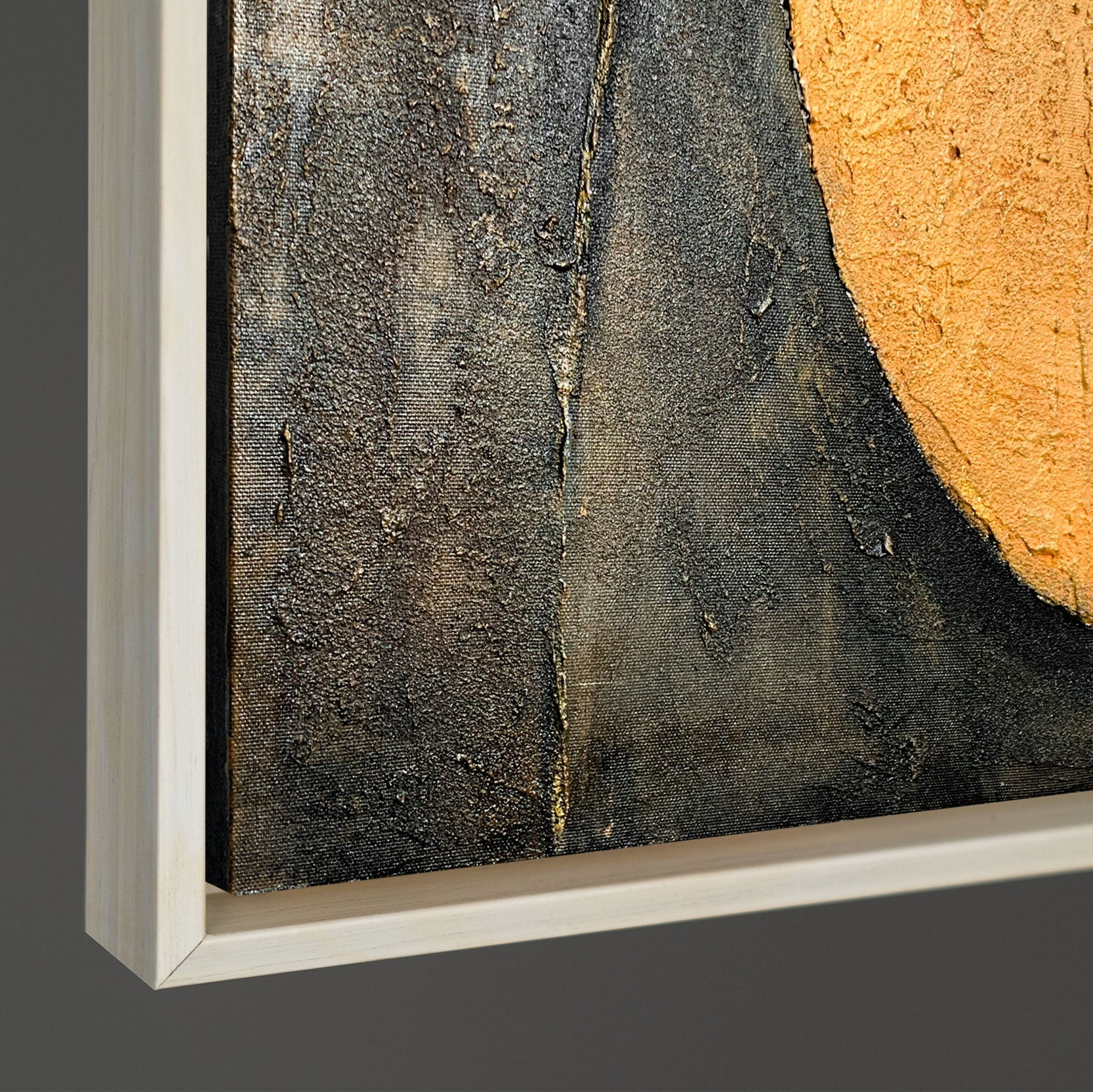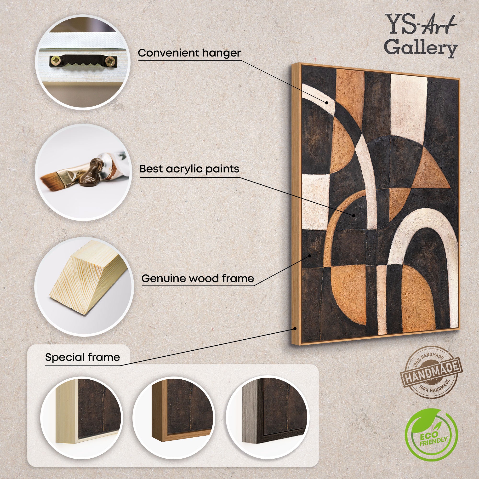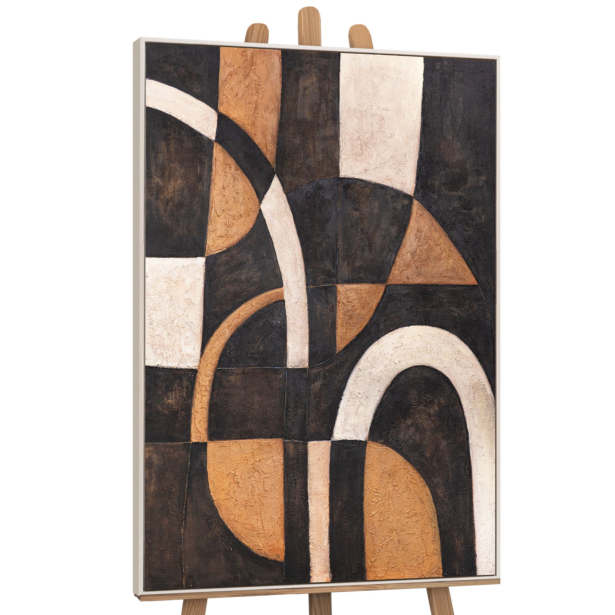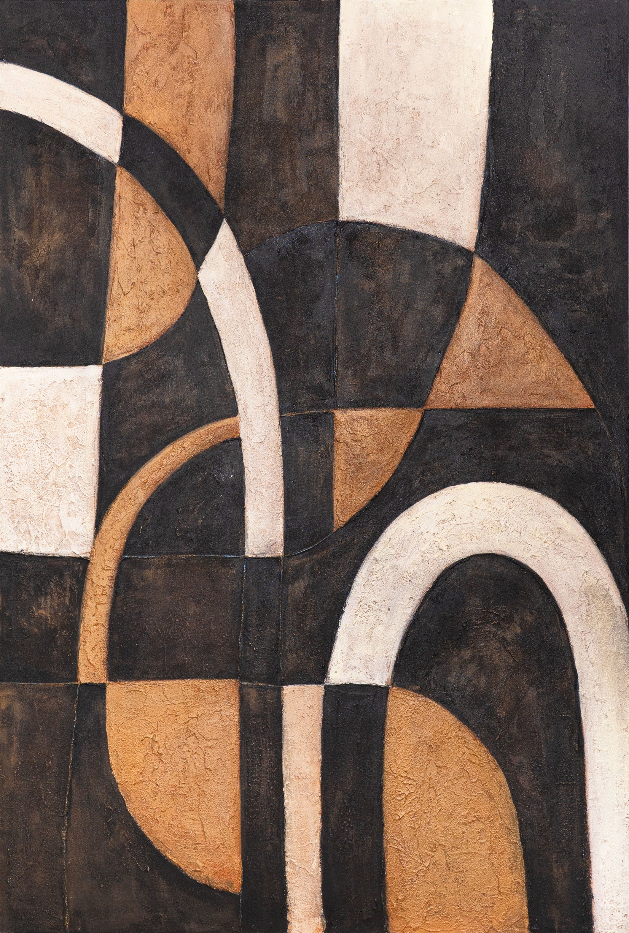 Esta pintura pintada a mano fascina con un juego de líneas curvas y formas geométricas. La combinación de cálido marrón, elegante beige y profundo negro crea una armoniosa interacción de contrastes. La superficie texturizada otorga profundidad y carácter a la obra, convirtiéndola en un verdadero centro de atención.