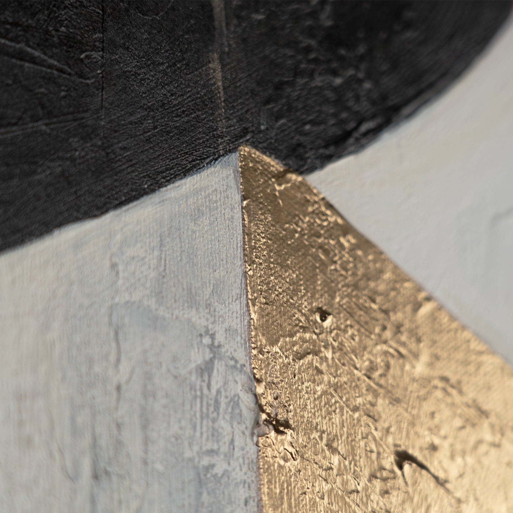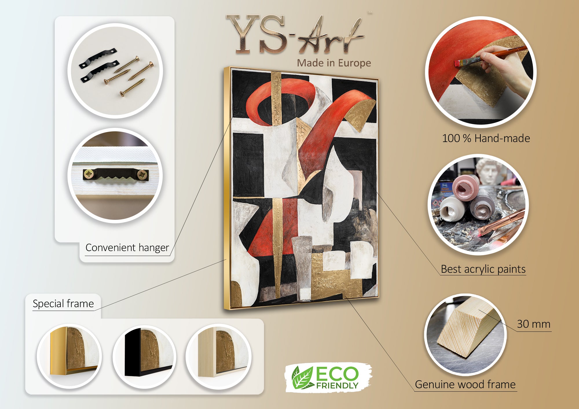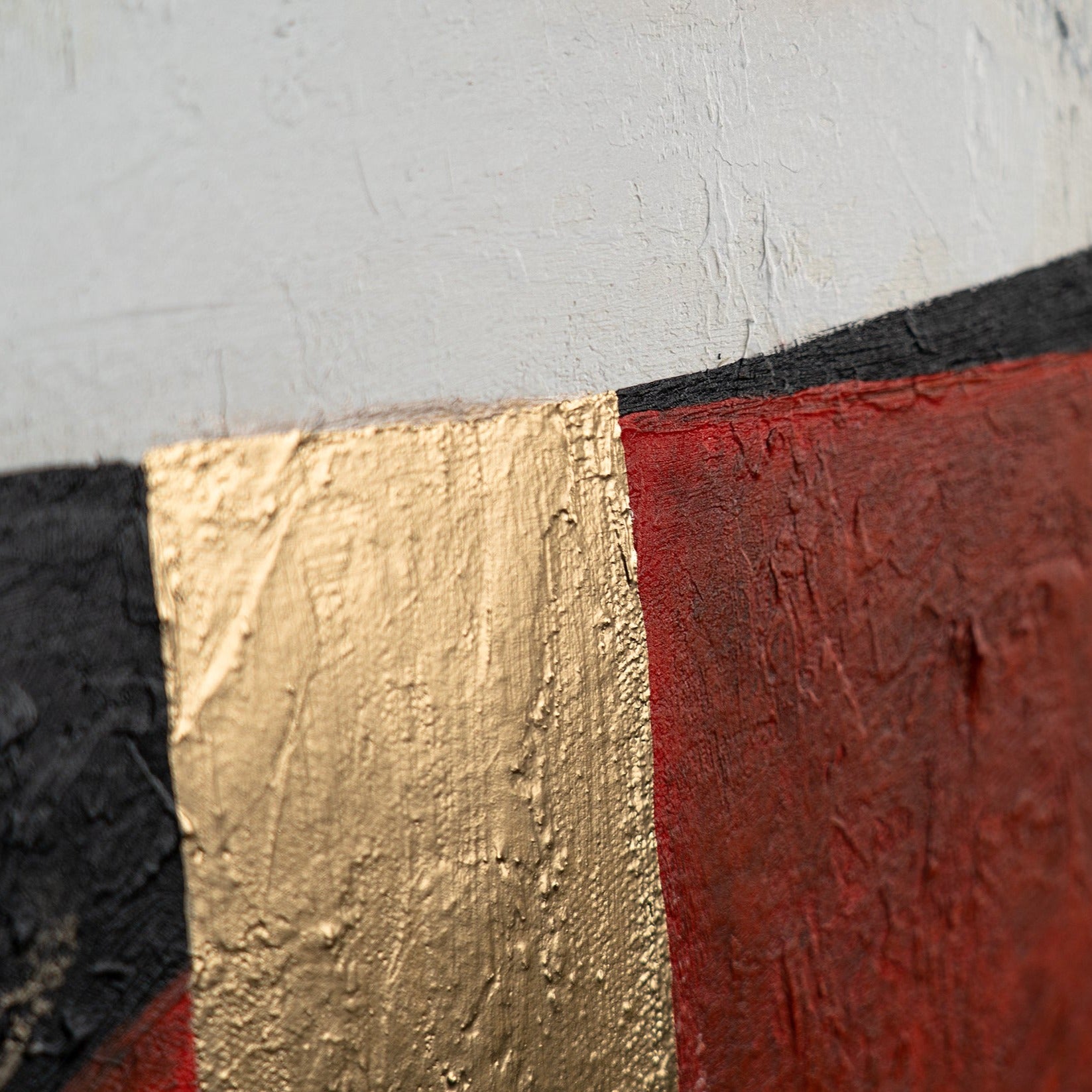 Enriquezca su hogar u oficina con esta pintura abstracta colorida, que representa una composición moderna en tonos rojos, dorados y negros. El cuadro destaca por sus fuertes contrastes y pinceladas expresivas. Está 100% pintado a mano y realzado con un moderno marco negro.