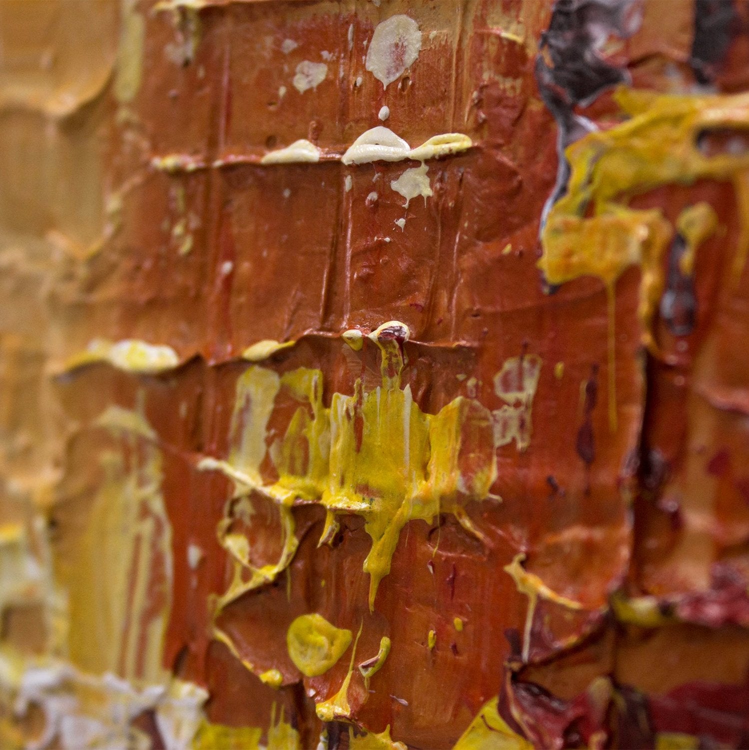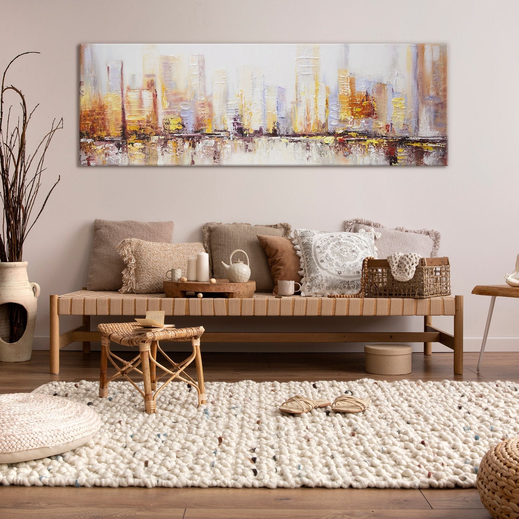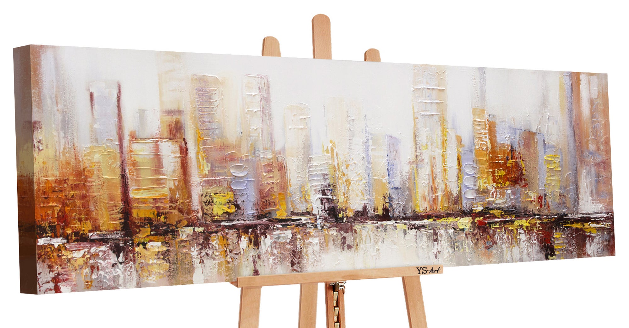 Esta impresionante pintura acrílica representa una interpretación abstracta de un paisaje urbano contemporáneo. Con pinceladas expresivas y cálidos tonos de amarillo, naranja y blanco, esta obra transmite la energía y el dinamismo de la vida en la metrópoli.