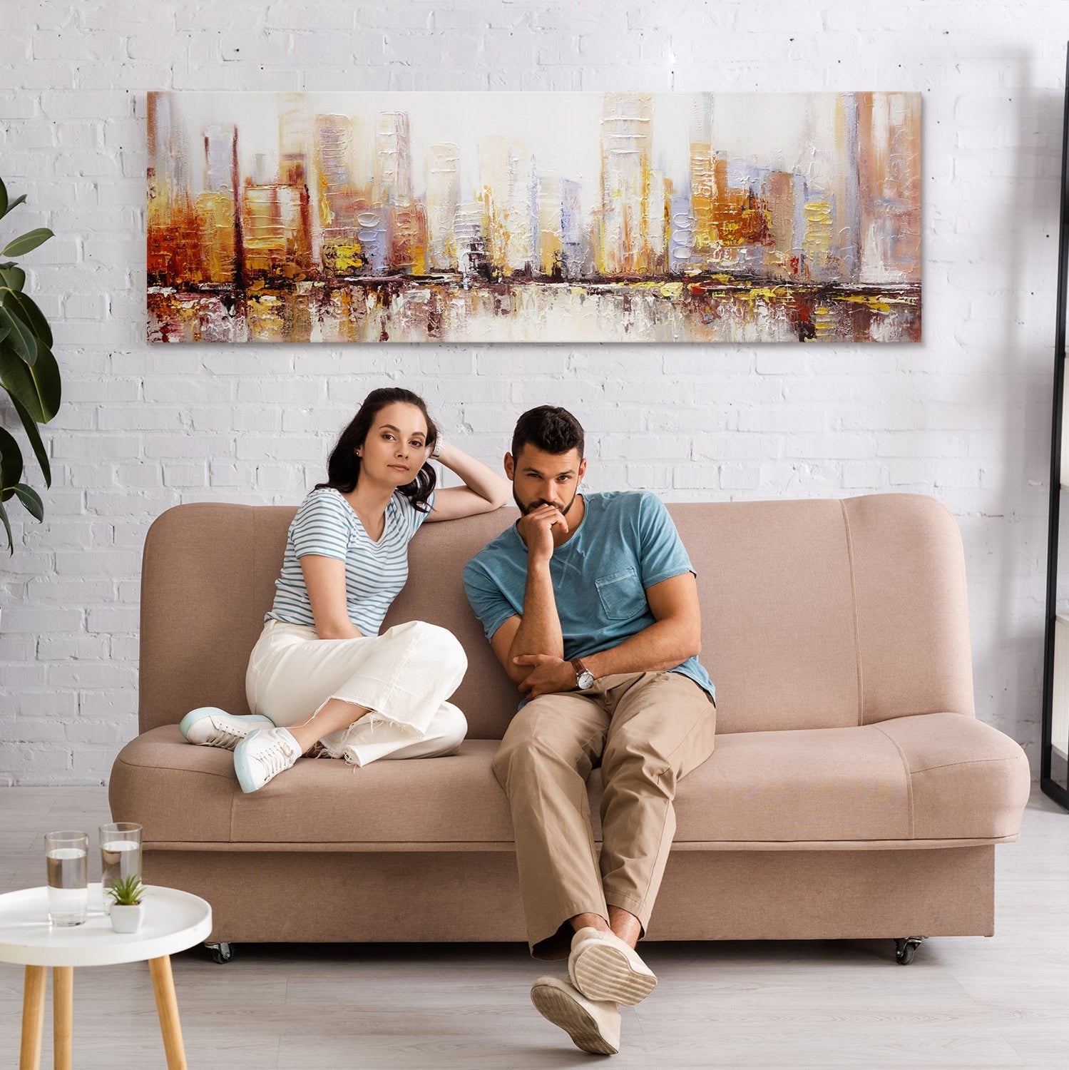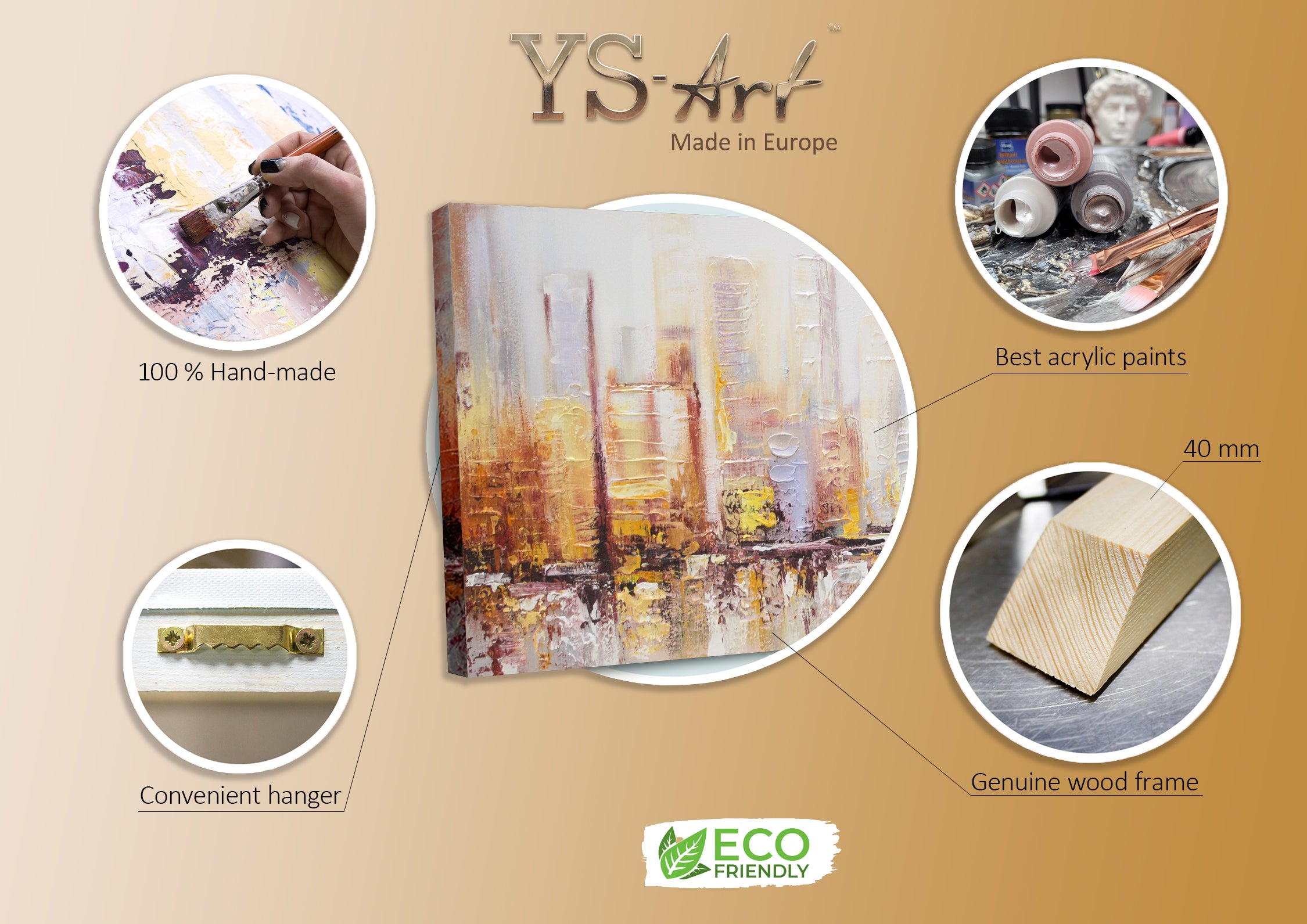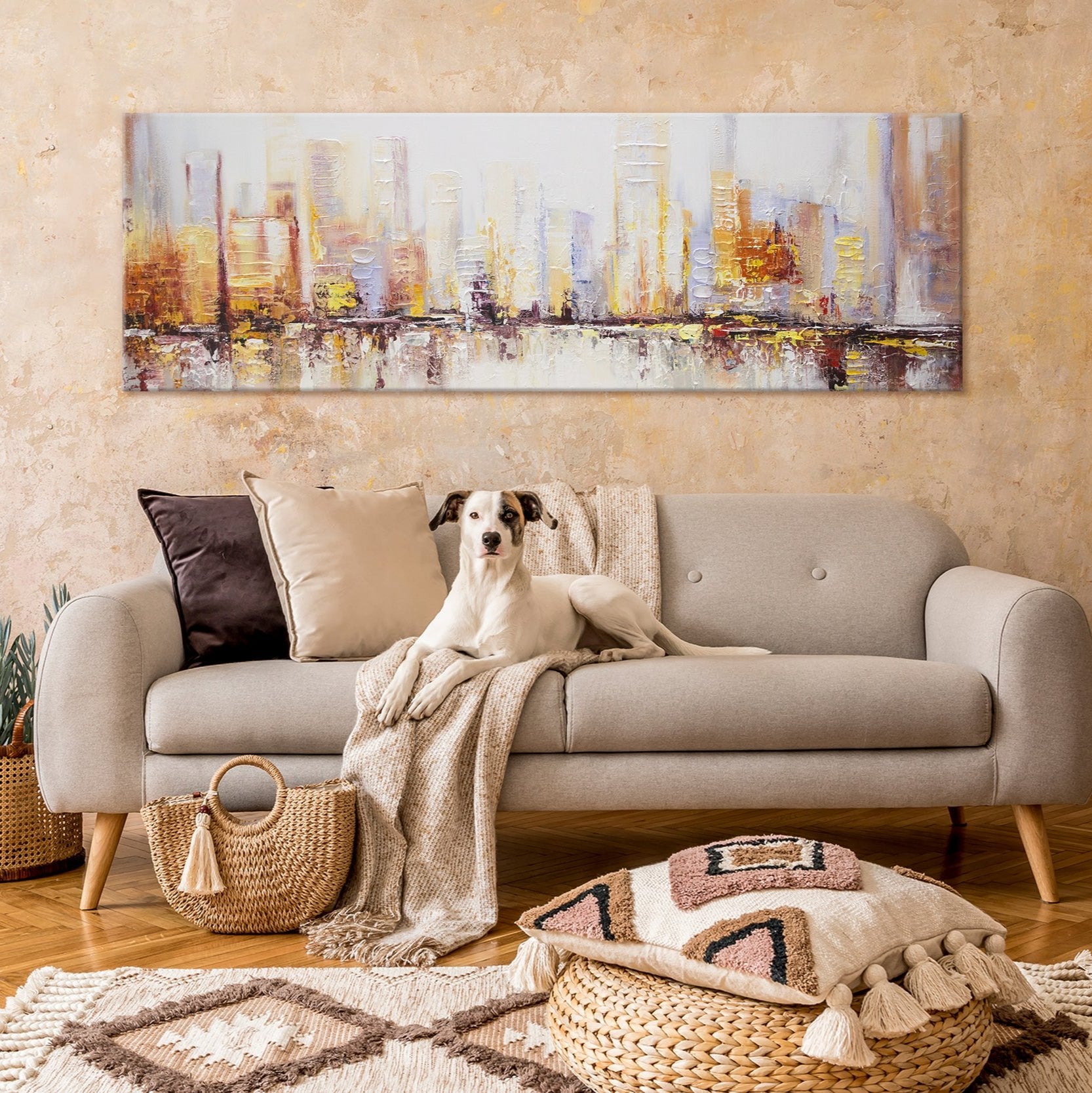 Esta impresionante pintura acrílica representa una interpretación abstracta de un paisaje urbano contemporáneo. Con pinceladas expresivas y cálidos tonos de amarillo, naranja y blanco, esta obra transmite la energía y el dinamismo de la vida en la metrópoli.