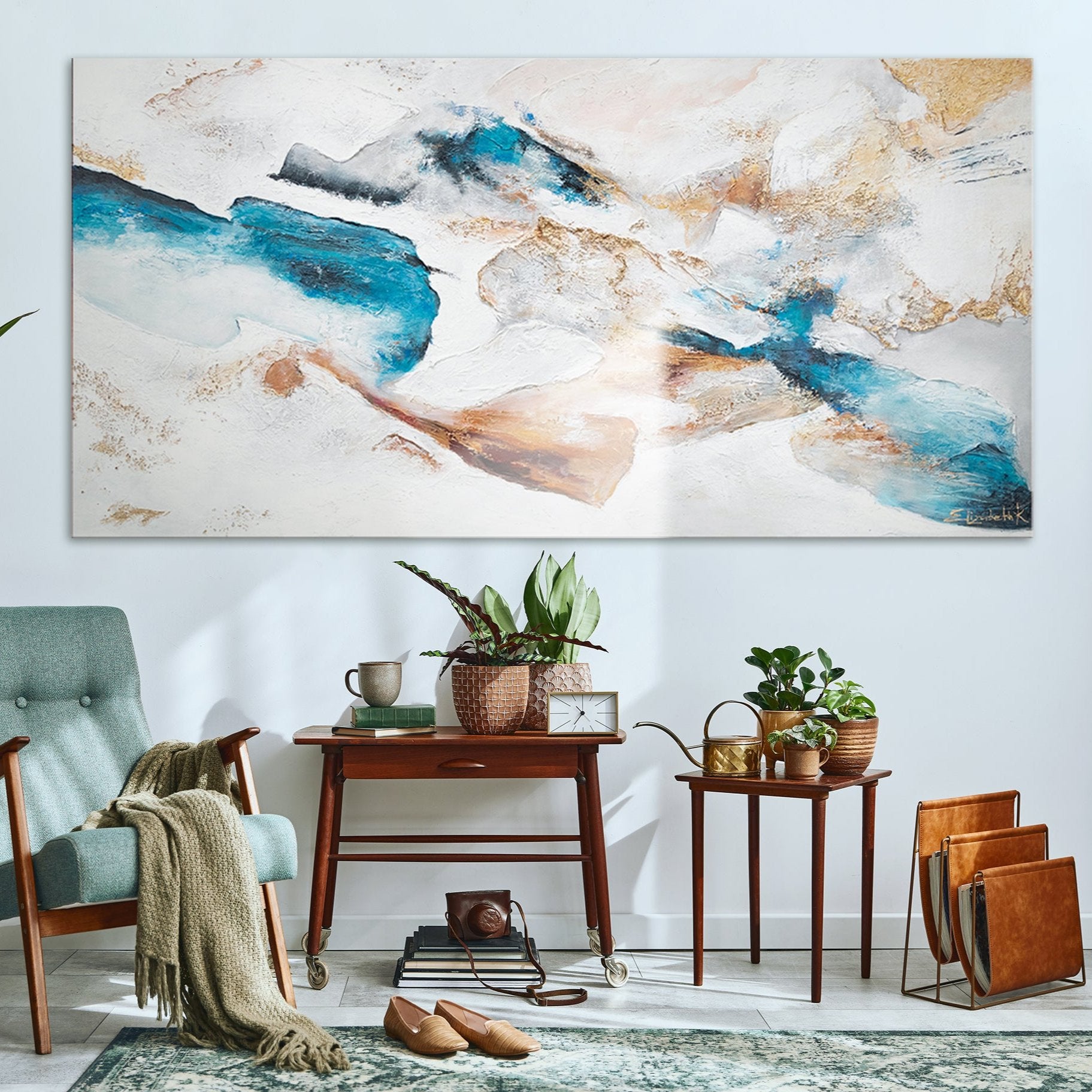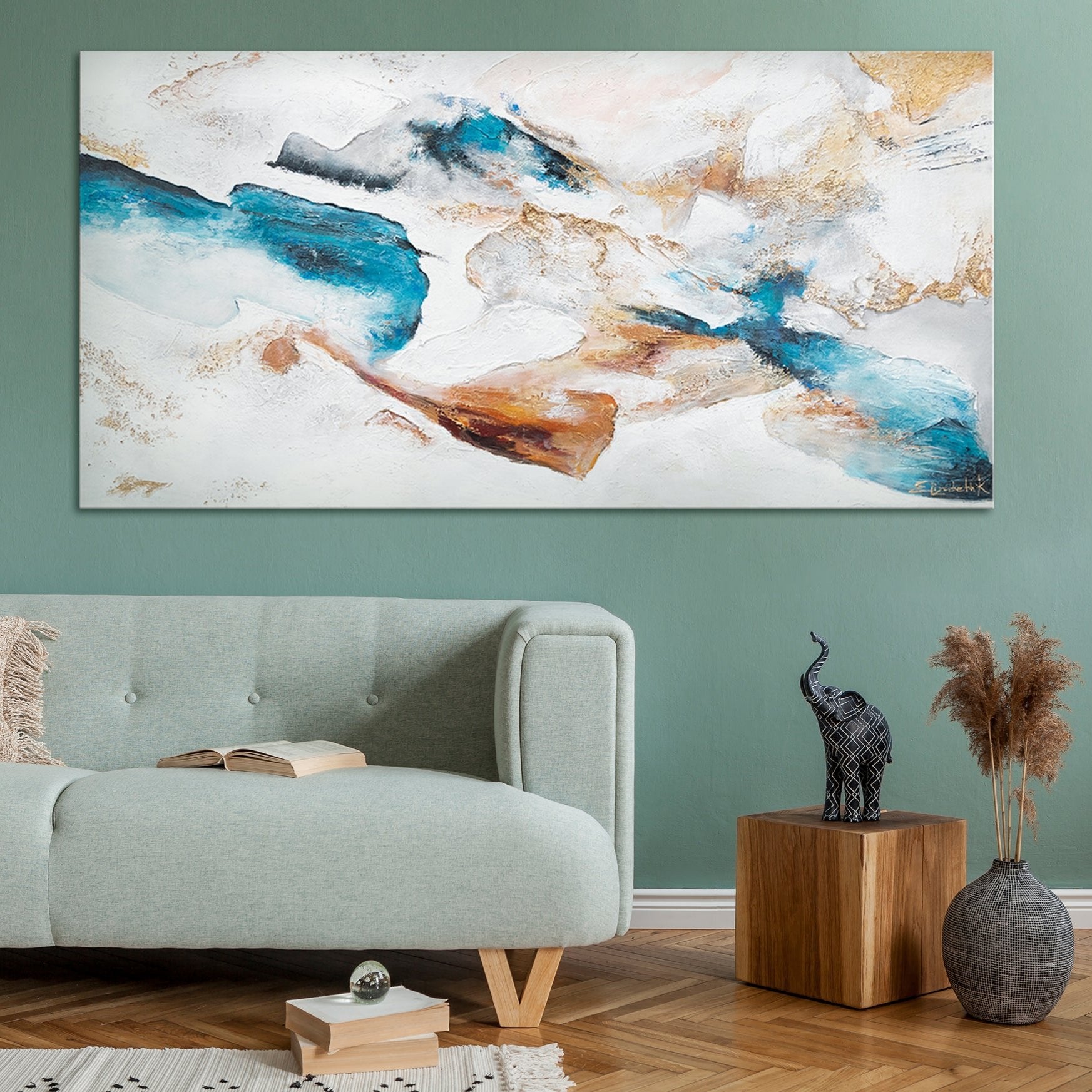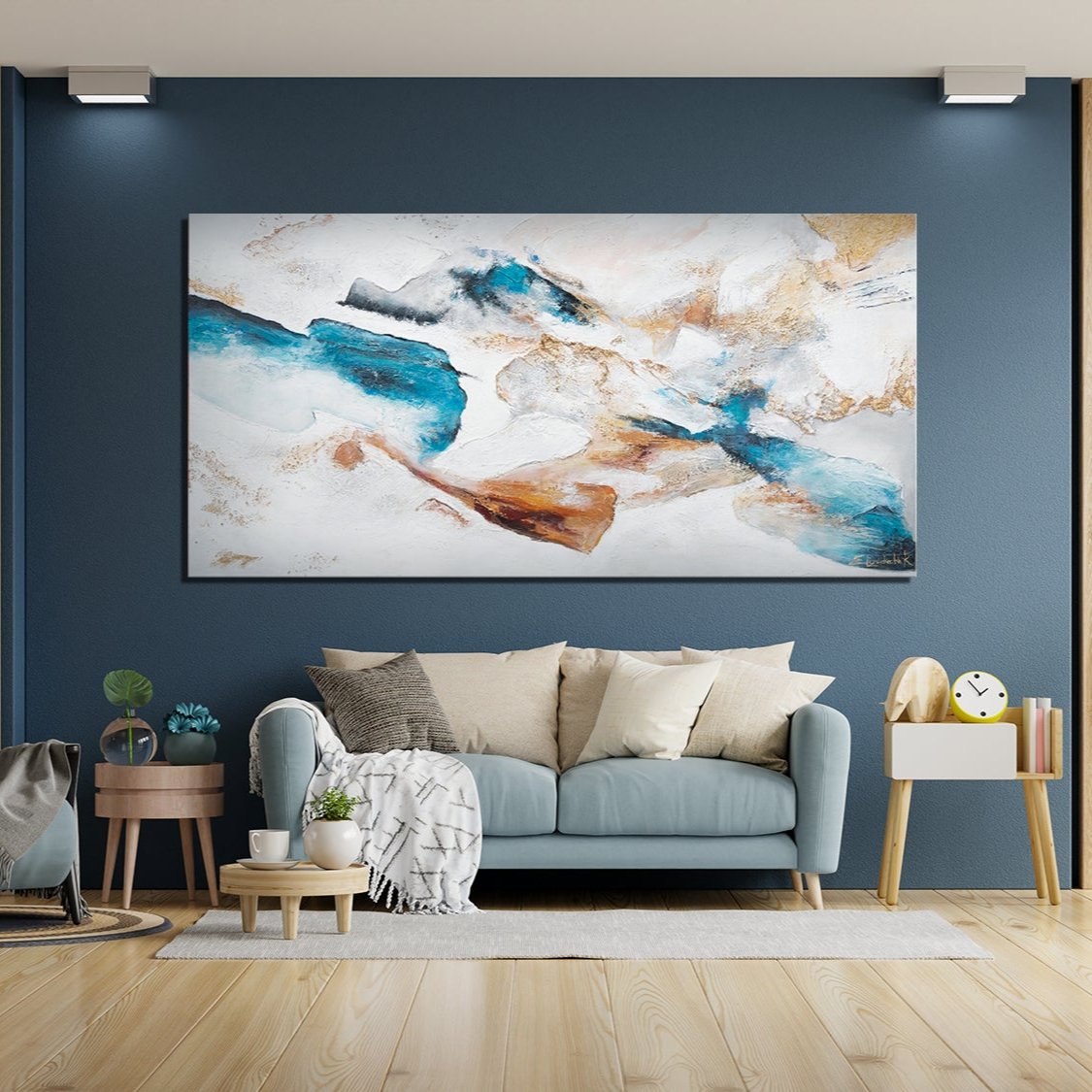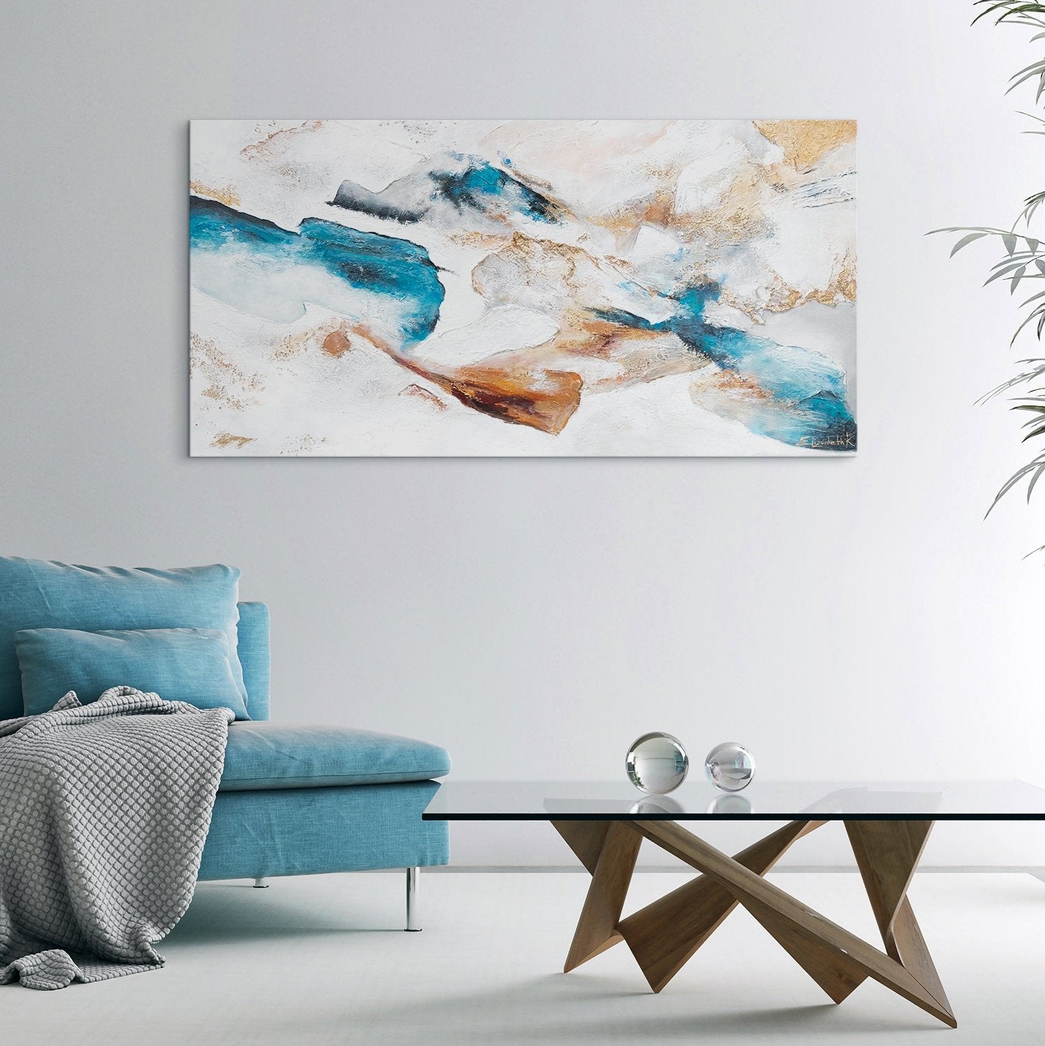 Sumérgete en el fascinante mundo del arte abstracto moderno con esta pintura acrílica sobre lienzo. La armoniosa combinación de tonos azules, blancos y dorados crea una atmósfera única y relajante que aporta elegancia y serenidad a cualquier espacio.