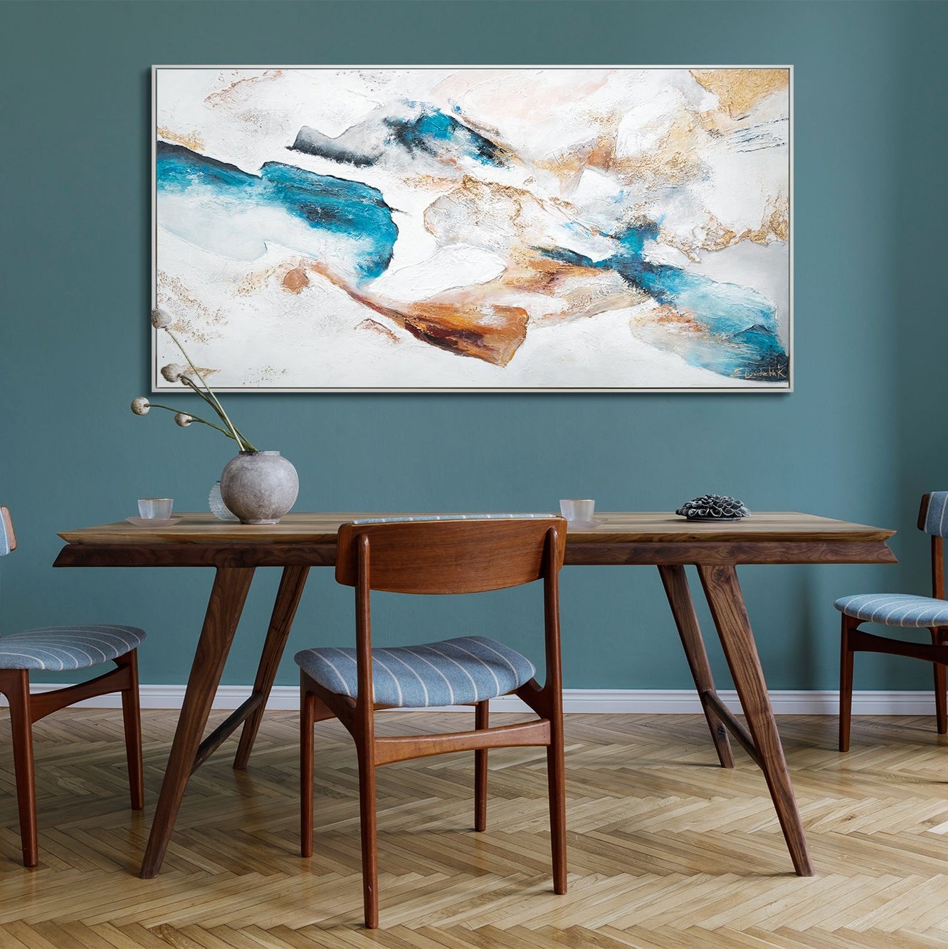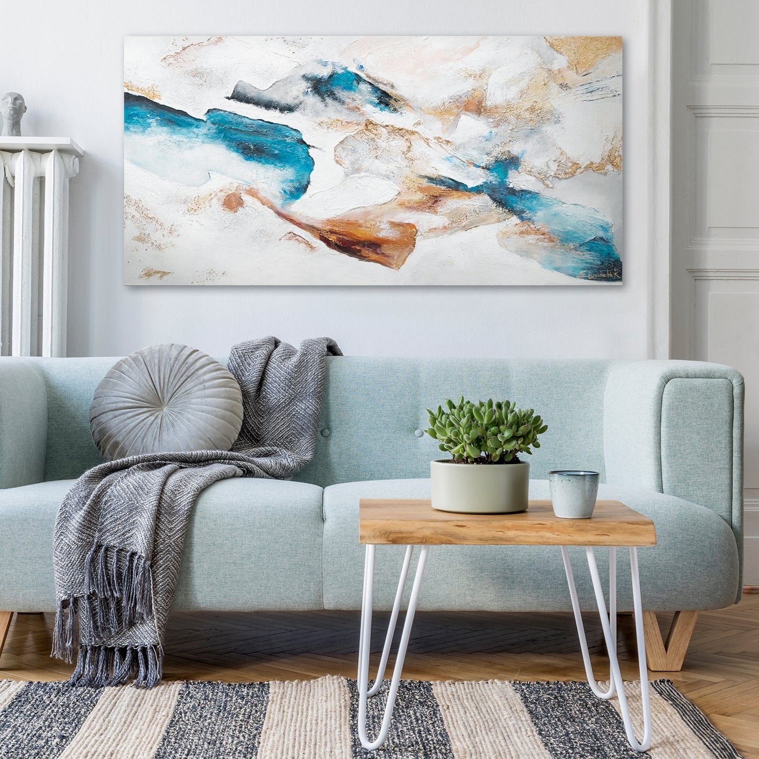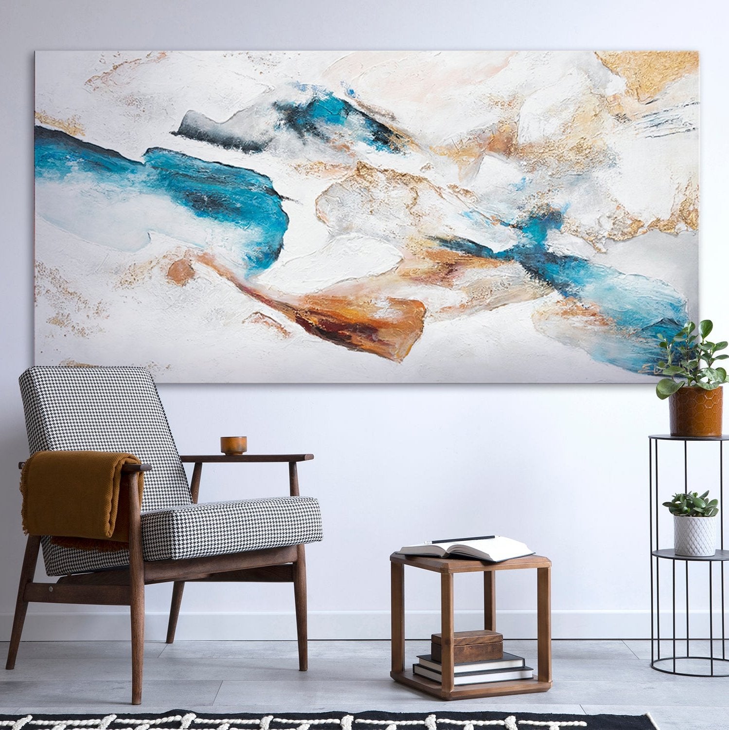 Sumérgete en el fascinante mundo del arte abstracto moderno con esta pintura acrílica sobre lienzo. La armoniosa combinación de tonos azules, blancos y dorados crea una atmósfera única y relajante que aporta elegancia y serenidad a cualquier espacio.