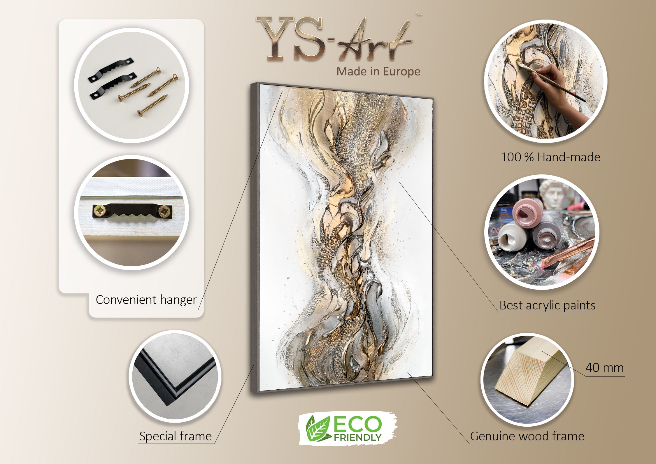 - Para nuestros cuadros abstractos en acrílico, utilizamos exclusivamente materiales de alta calidad que cumplen con los estándares internacionales. Cada pintura de nuestra colección puede ser pintada también en otros tamaños según tu preferencia.