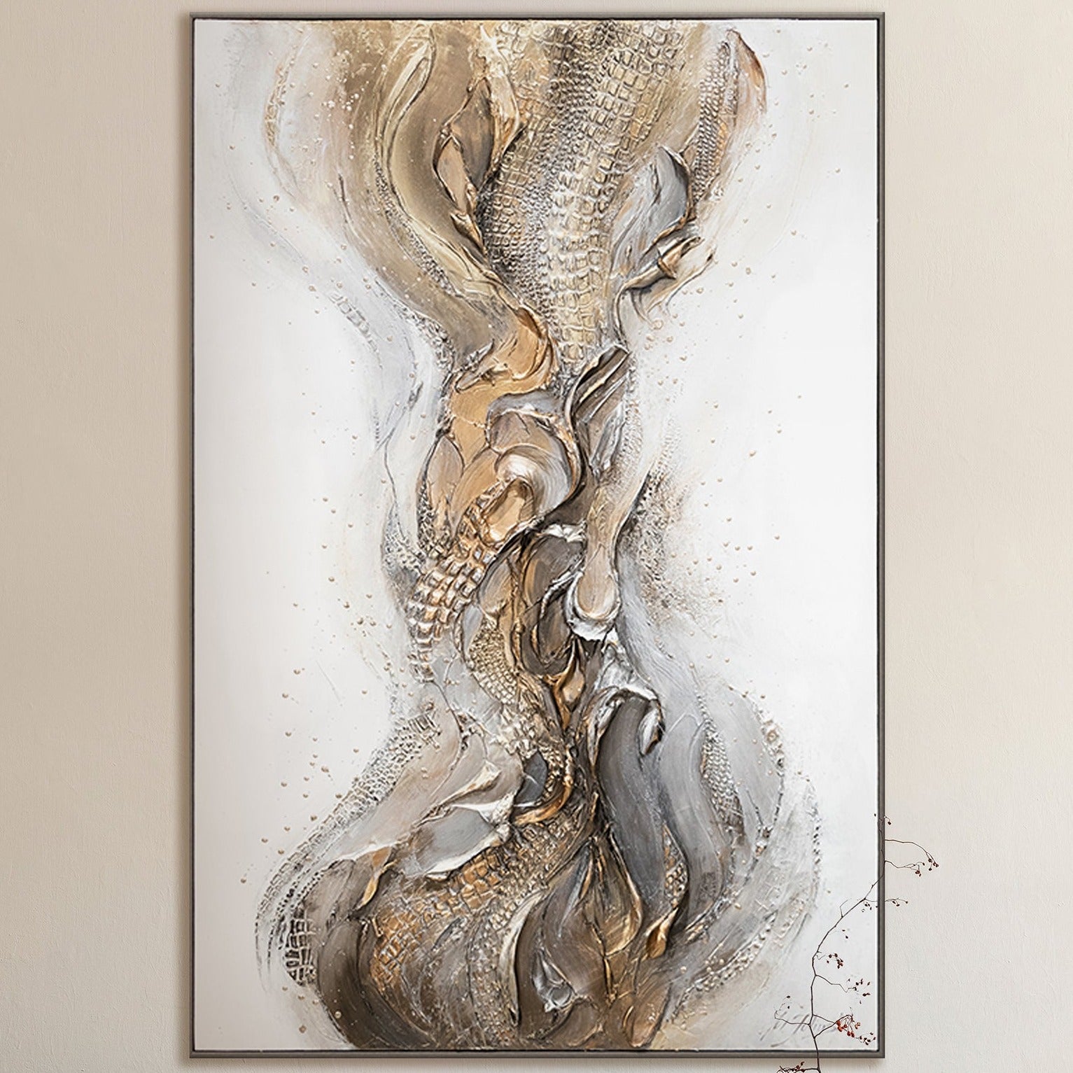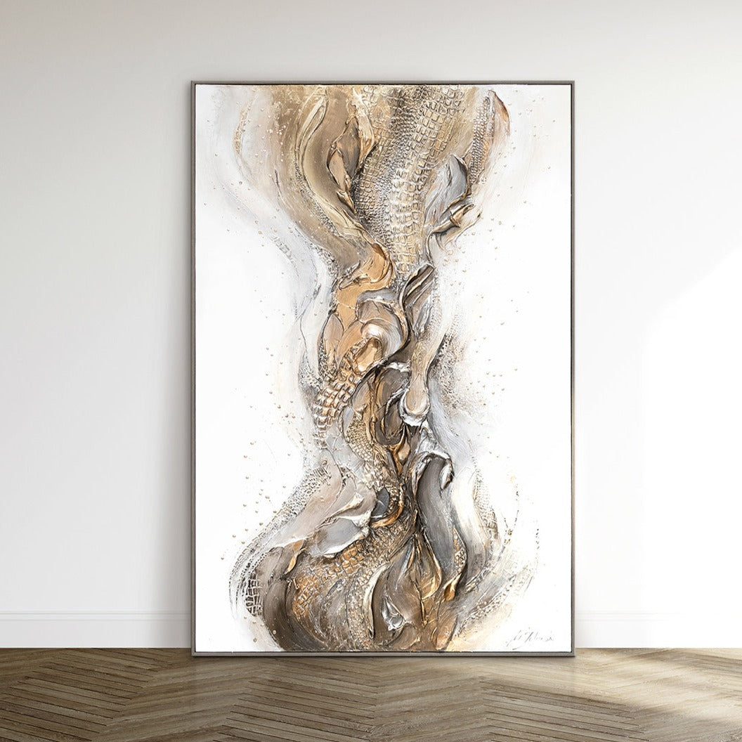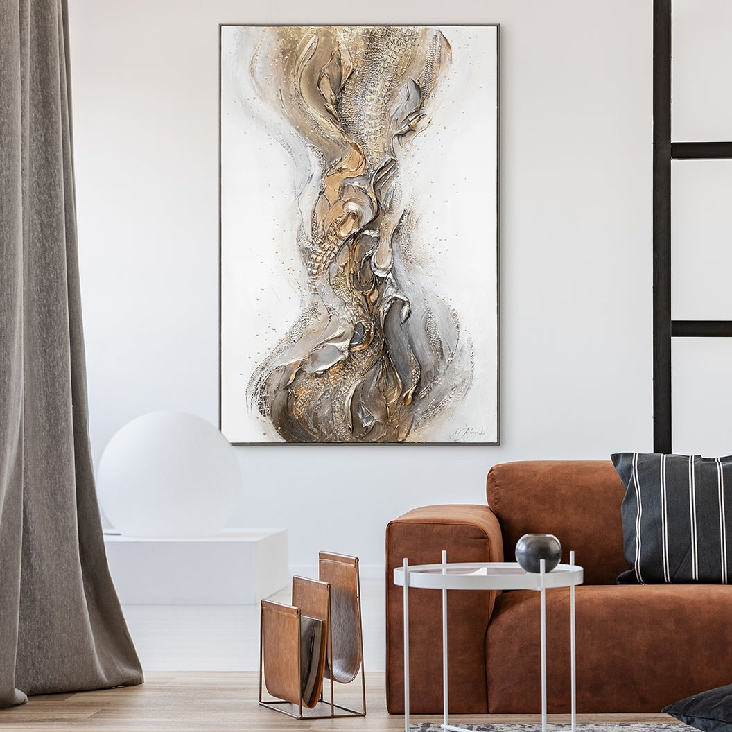 La atmósfera de abstracción en esta pintura en lienzo es fascinante. Las diferentes texturas, el uso de pan de oro y el marco delgado le dan lujo y elegancia. Esta obra de arte lucirá impresionante tanto en la sala de estar como en el dormitorio o la oficina.
