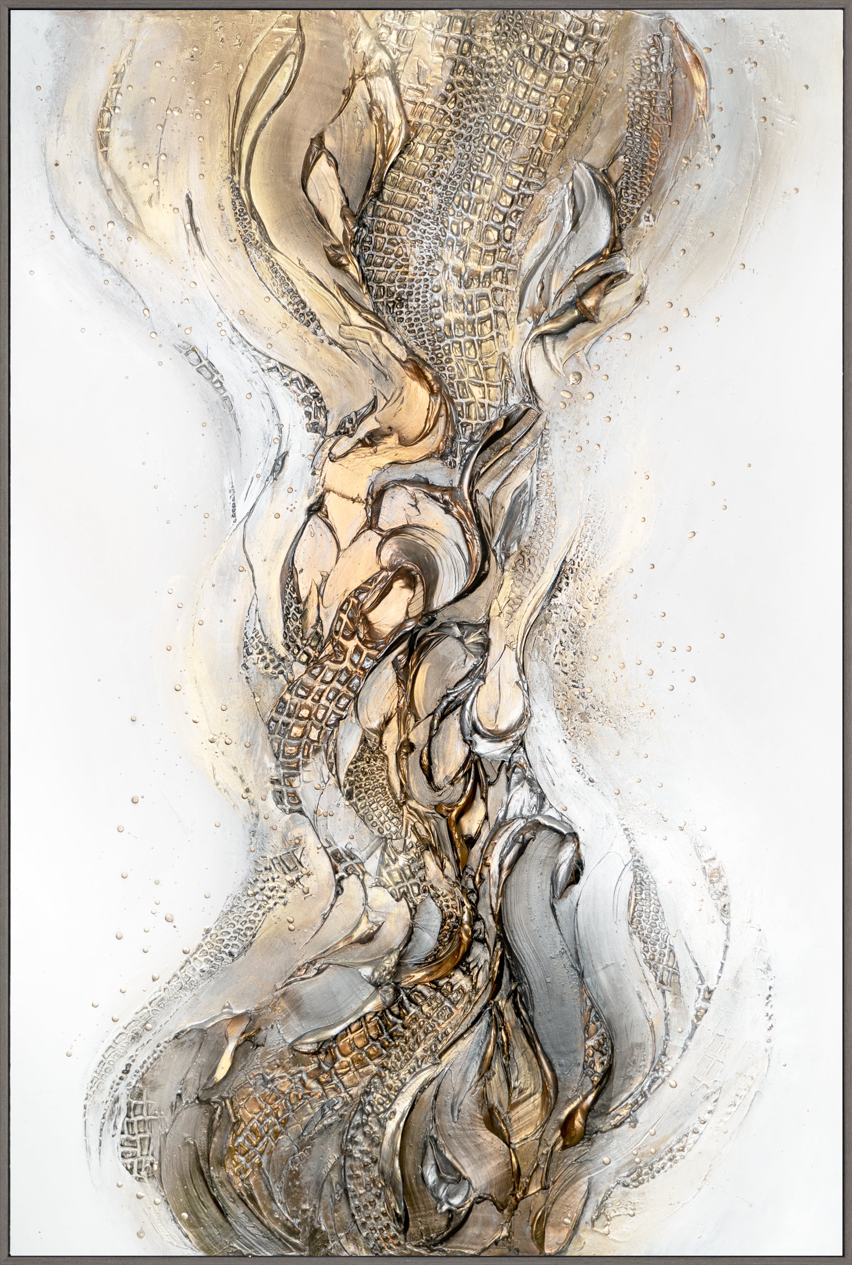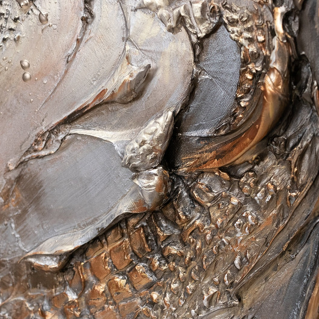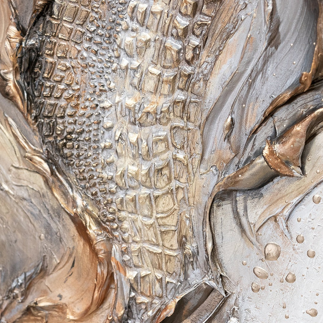La atmósfera de abstracción en esta pintura en lienzo es fascinante. Las diferentes texturas, el uso de pan de oro y el marco delgado le dan lujo y elegancia. Esta obra de arte lucirá impresionante tanto en la sala de estar como en el dormitorio o la oficina.