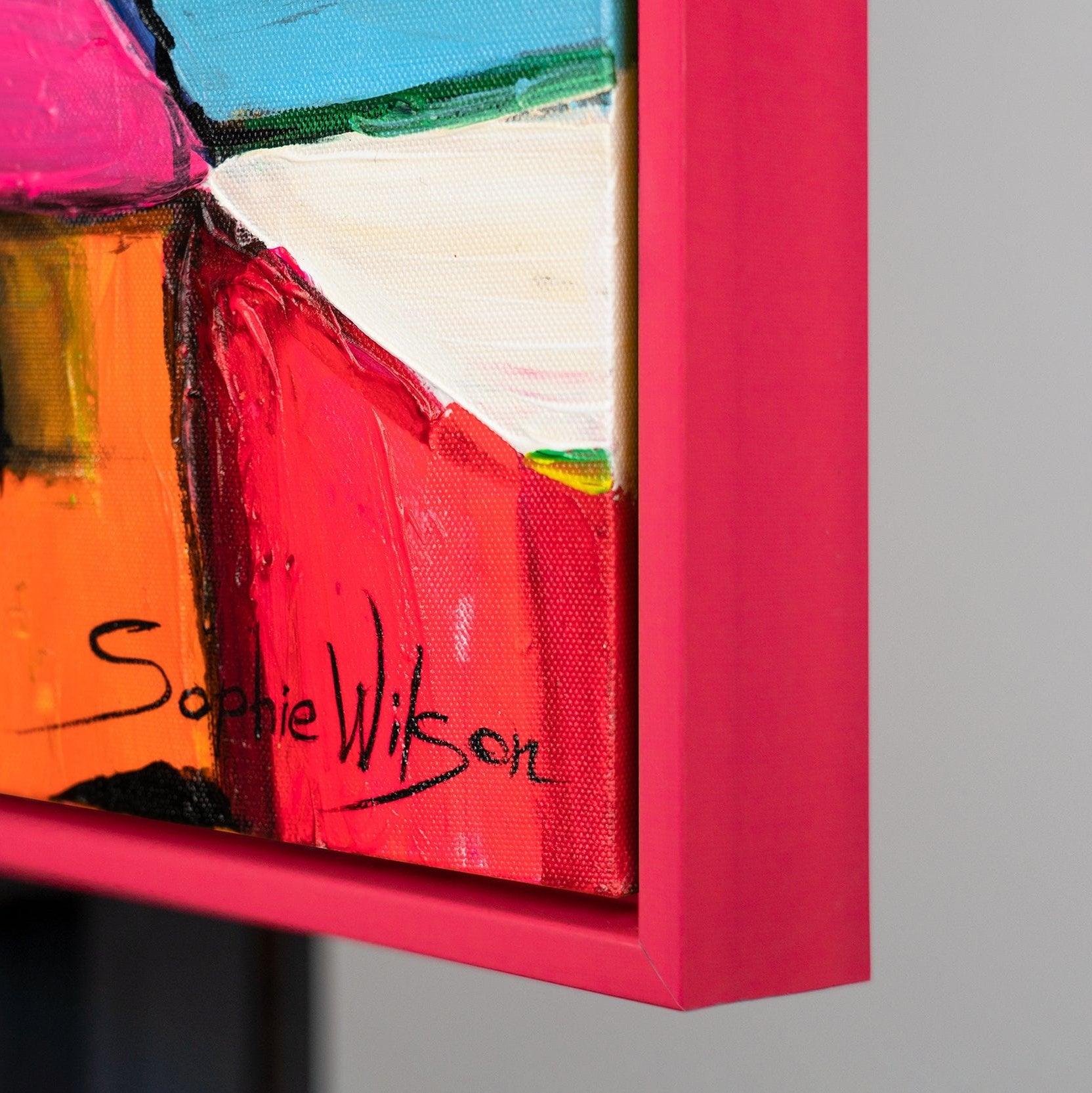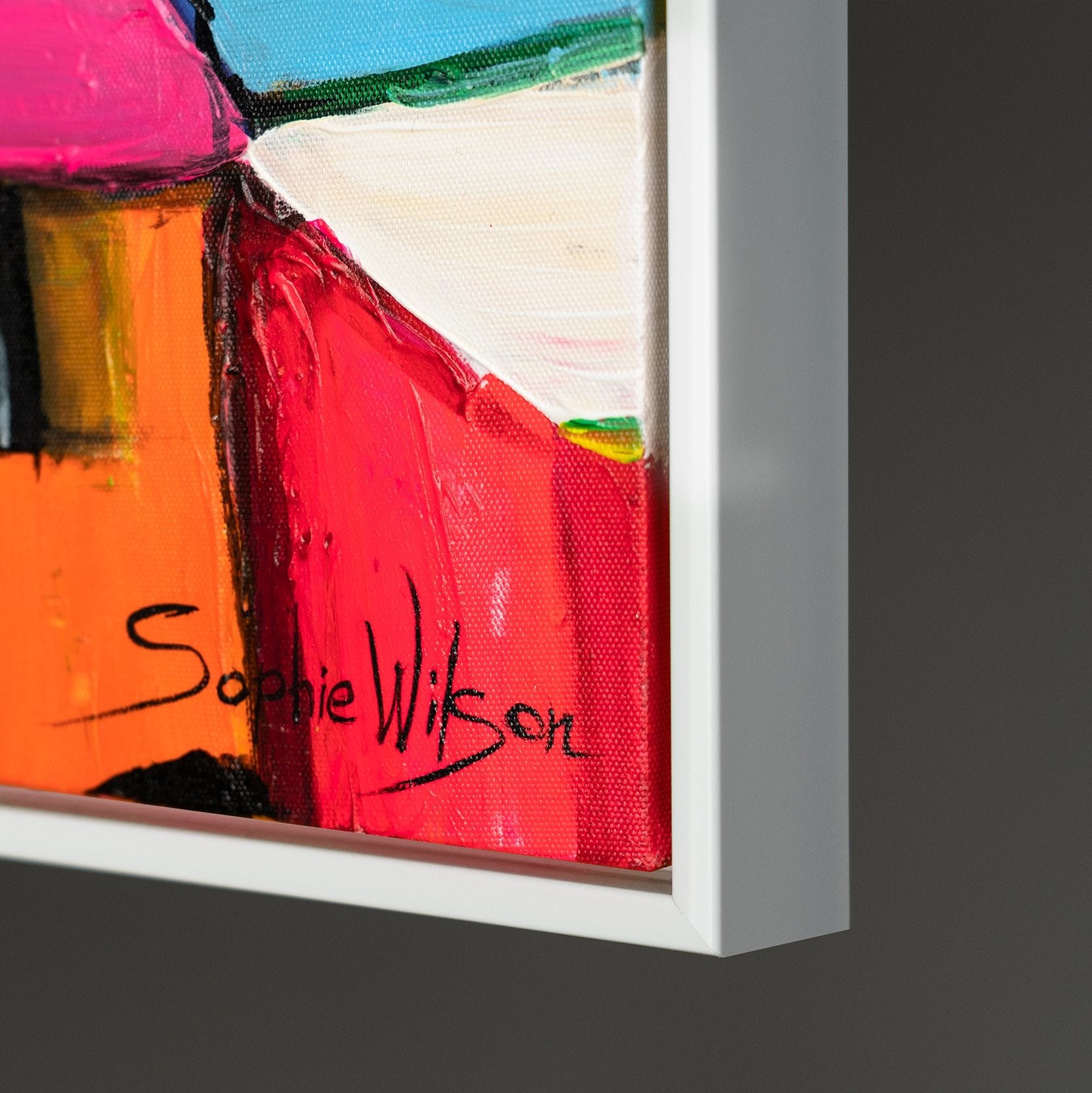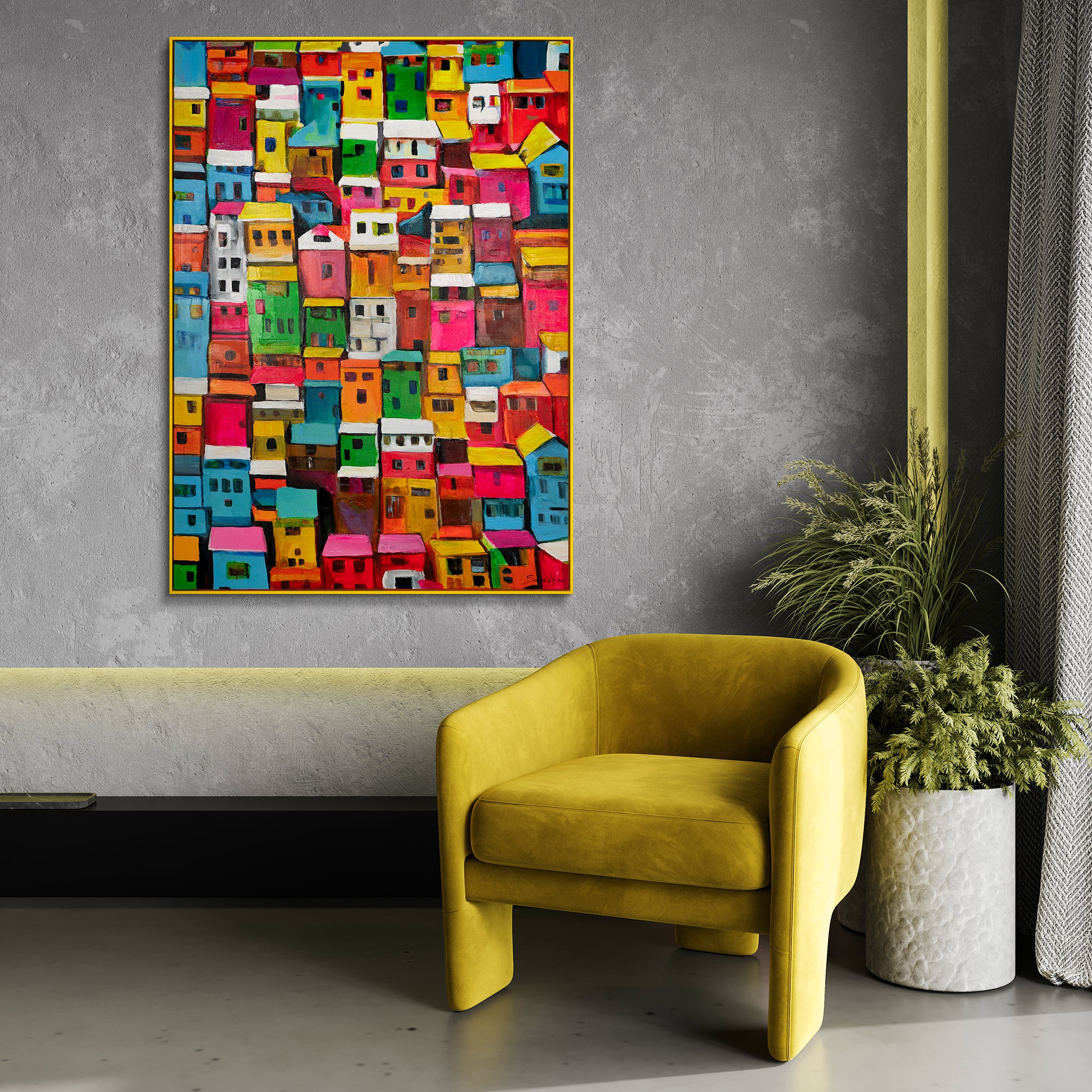 Dieses farbenfrohe abstrakte Gemälde stellt eine lebendige und dynamische Stadtlandschaft dar, die durch eine Vielzahl an leuchtenden Farben besticht. Mit kräftigen Tönen von Blau, Gelb, Grün und Rot bringt dieses Kunstwerk Fröhlichkeit und Energie in jeden Raum.
