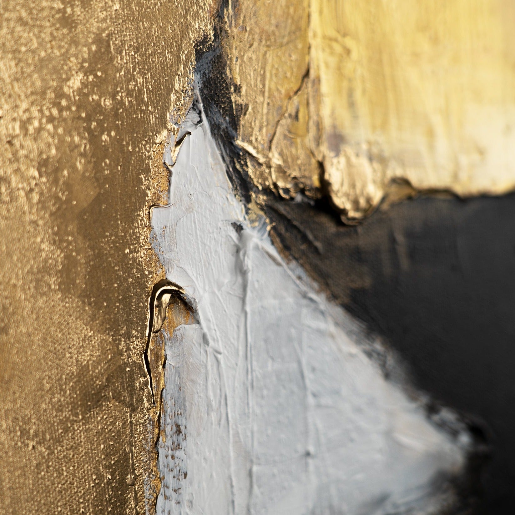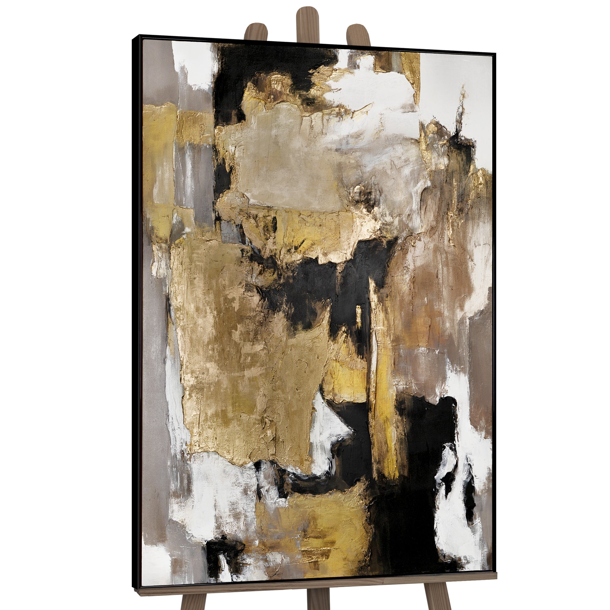 Enriquezca su hogar u oficina con esta elegante pintura abstracta, que representa una composición moderna y dinámica en tonos dorados y negros. El cuadro destaca por sus fuertes contrastes y pinceladas expresivas. Está 100% pintado a mano y realzado con un moderno marco negro.