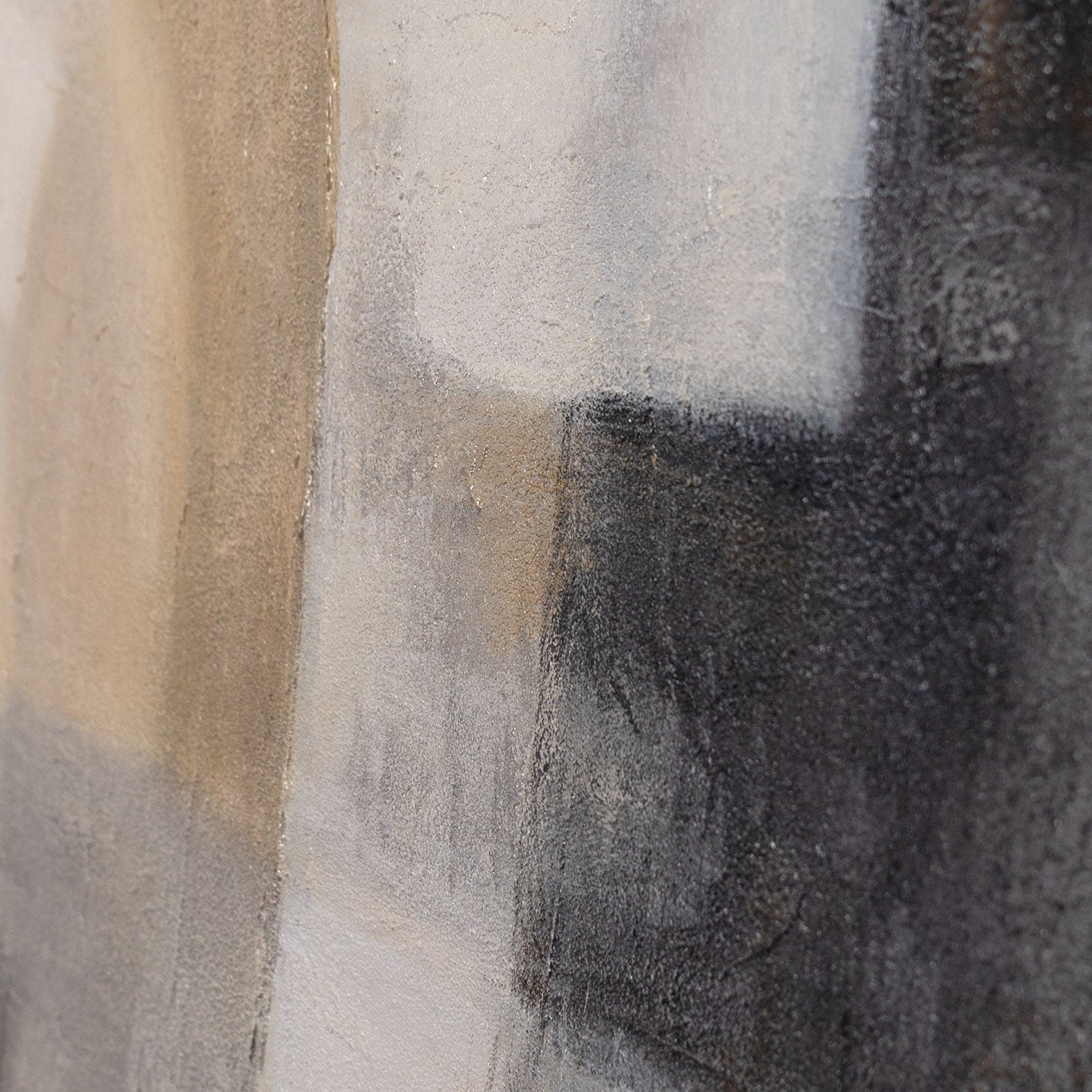 "Luz Fantasmal" presenta una composición suave, casi nebulosa, de tonos beige, gris y crema. Las transiciones suaves se combinan con claros acentos geométricos, creando un juego de luces y sombras sutil y a la vez potente. La superficie texturizada aporta profundidad a la pintura y hace visible cada matiz de color.