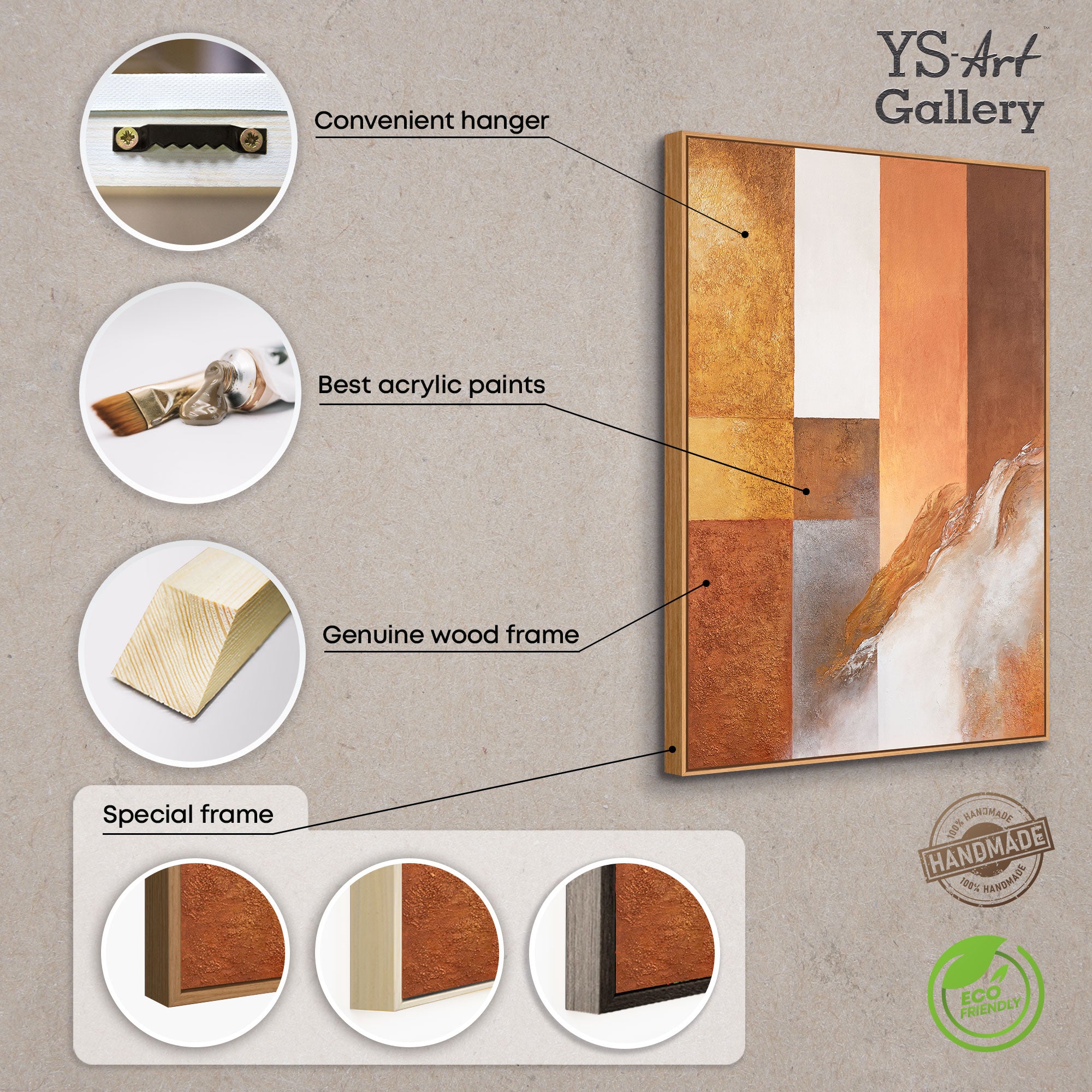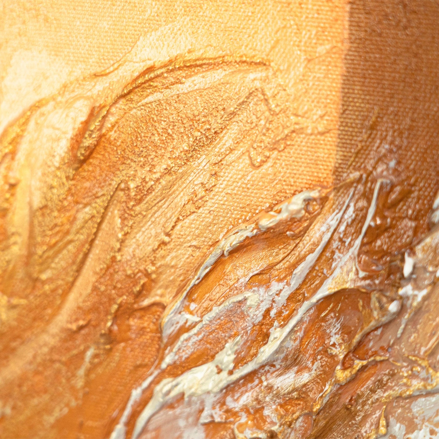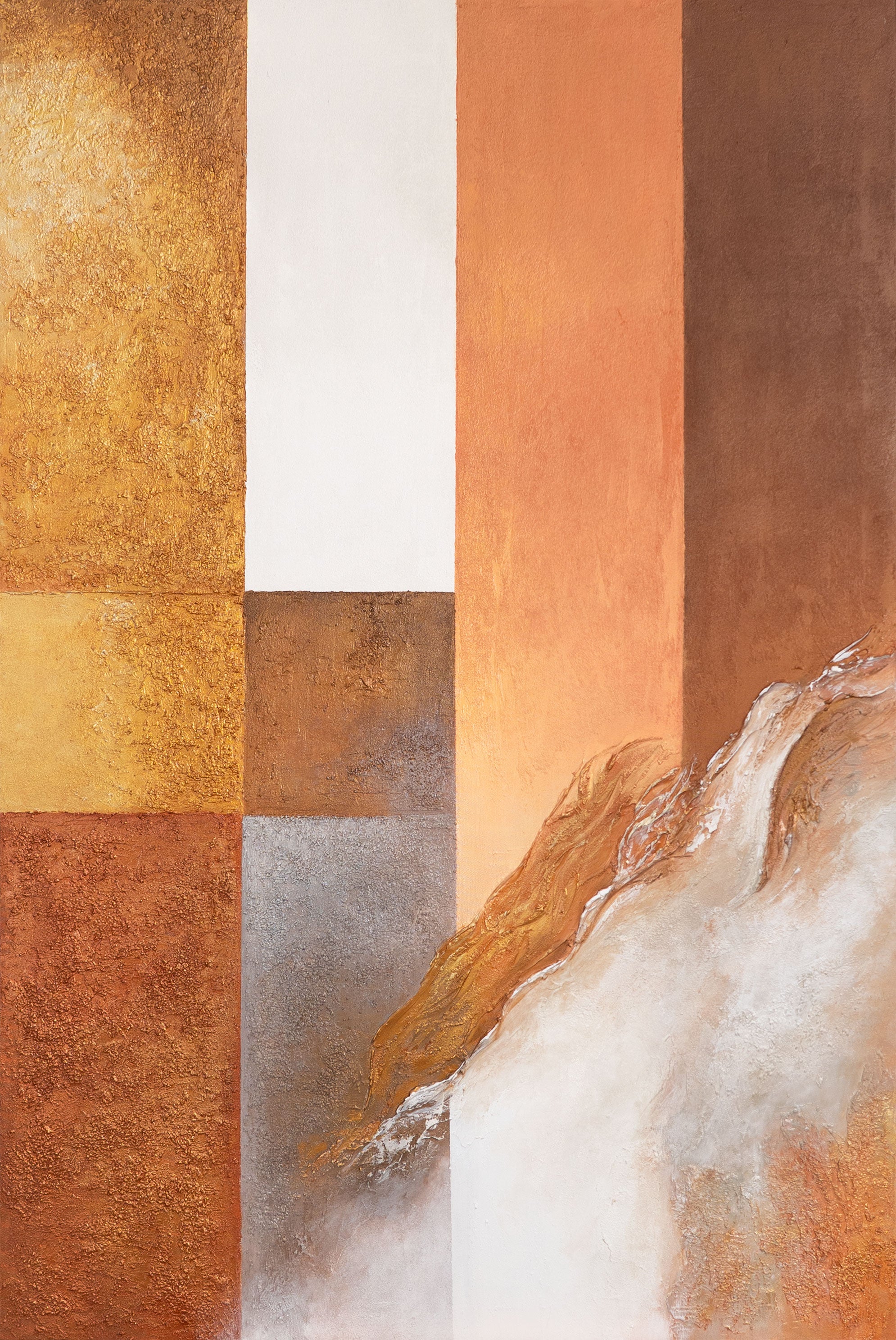 «Armonía de Formas» es una pintura acrílica pintada a mano que impresiona por su combinación de estructuras geométricas y suaves degradados de color. La paleta de cálidos tonos naranja, dorado, marrón y sutiles tonos naturales le confiere profundidad y un brillo sofisticado. La textura en relieve realza el carácter artístico y convierte cada superficie en una experiencia única.