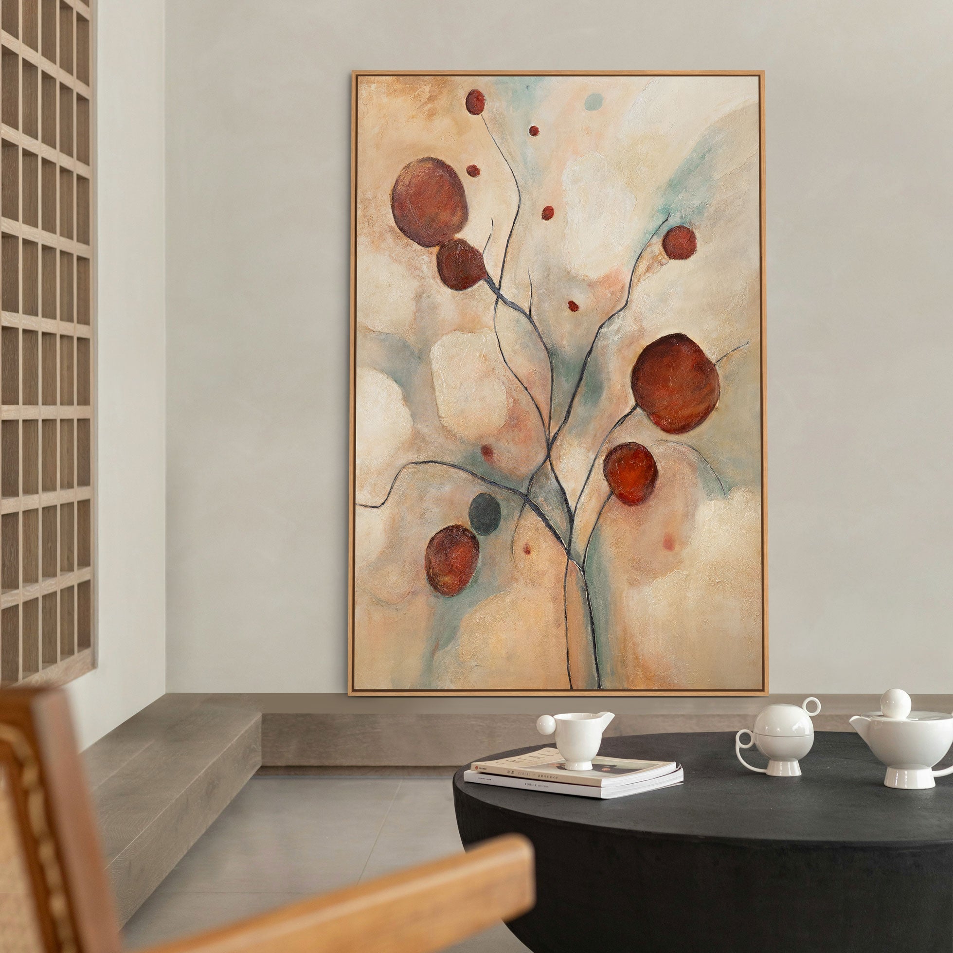 “Constelaciones Escarlatas” es una pintura acrílica pintada a mano sobre lienzo, que evoca las brillantes constelaciones con sus intensas esferas rojas y finas líneas. Los tonos cálidos de beige, suaves velos azules y acentos rojos intensos se fusionan en una composición fascinante que irradia calma y energía al mismo tiempo. La superficie texturizada realza la profundidad, haciendo que cada detalle cobre vida.