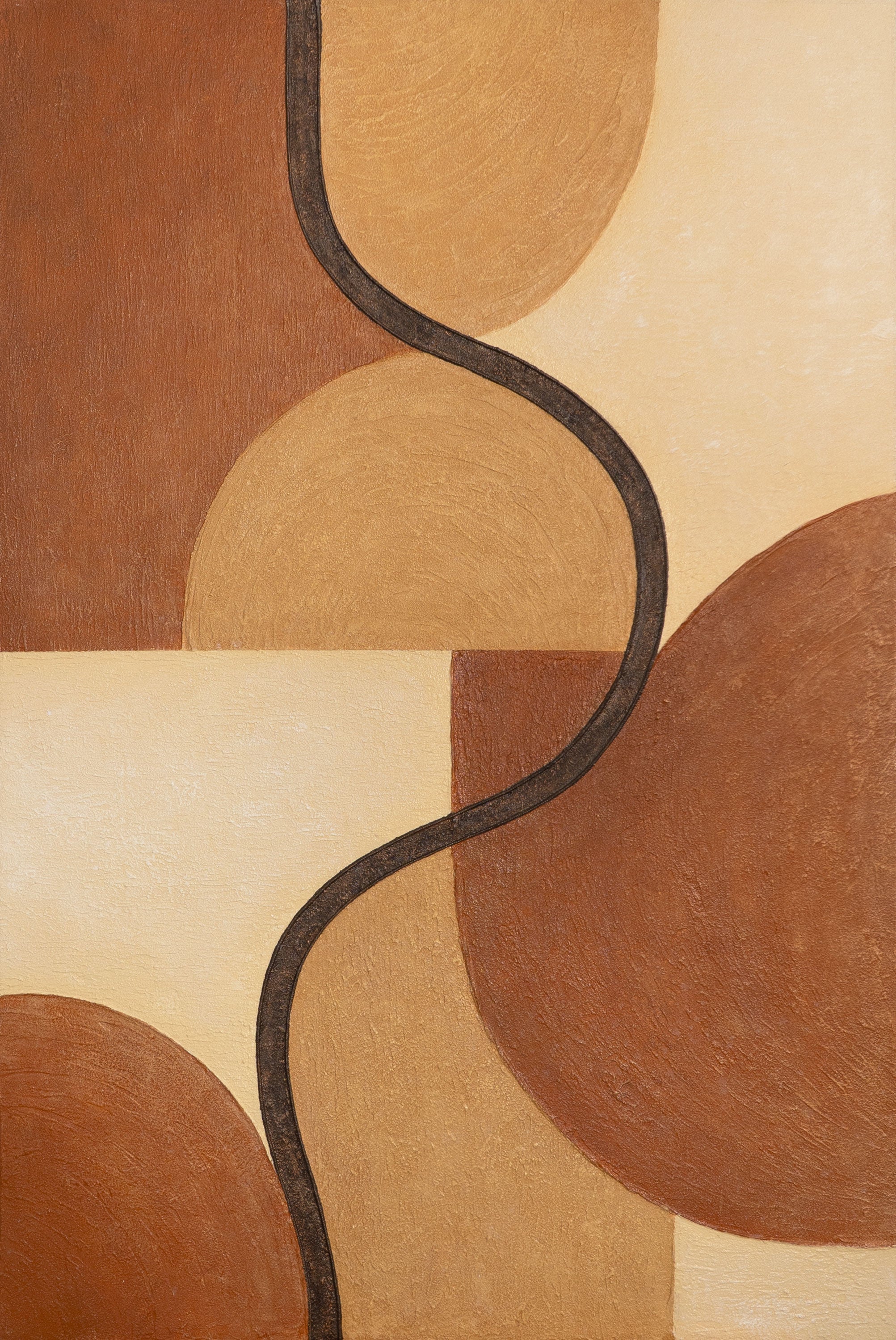 «Entrelazamiento de Formas» es una pintura acrílica pintada a mano que cautiva por su armoniosa interacción de líneas y formas. La composición en cálidos tonos marrones, beige y ocres crea una profundidad natural y una sensación de movimiento. La textura en relieve añade dinamismo a las formas geométricas y le confiere a la obra un atractivo moderno y táctil.