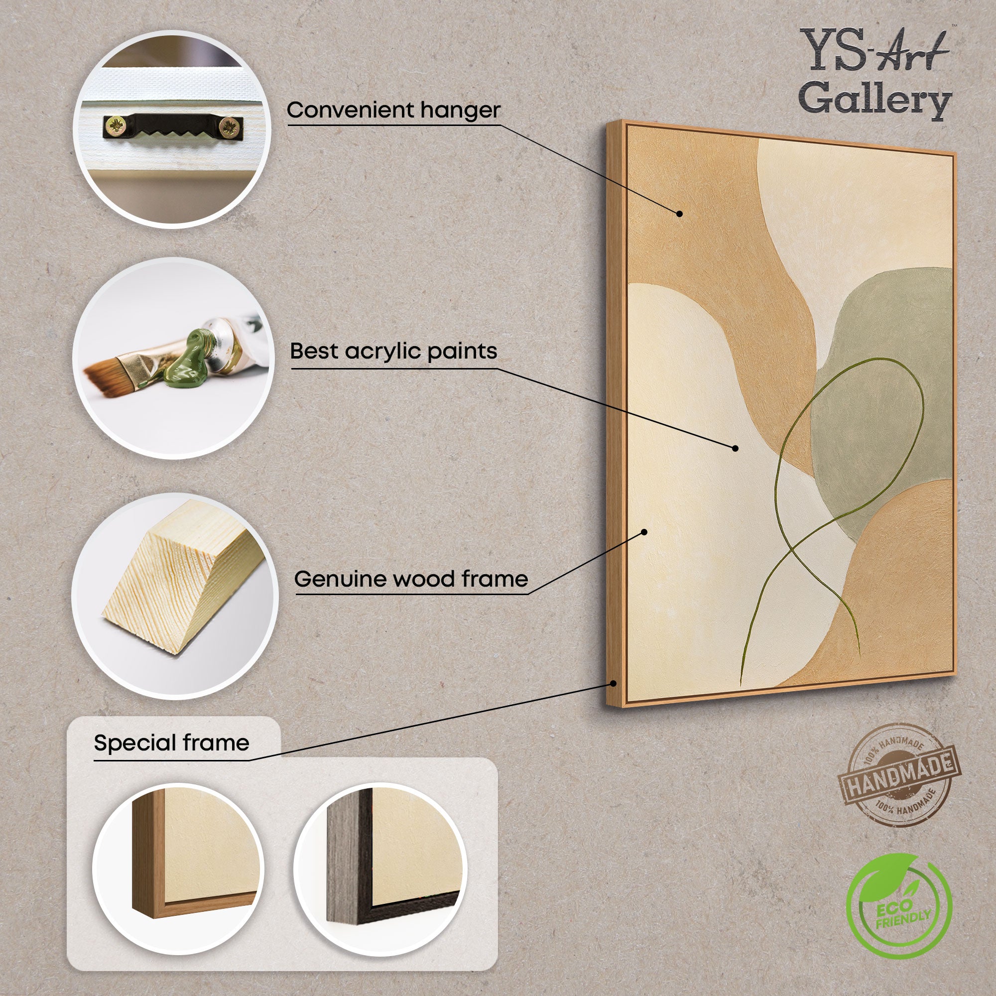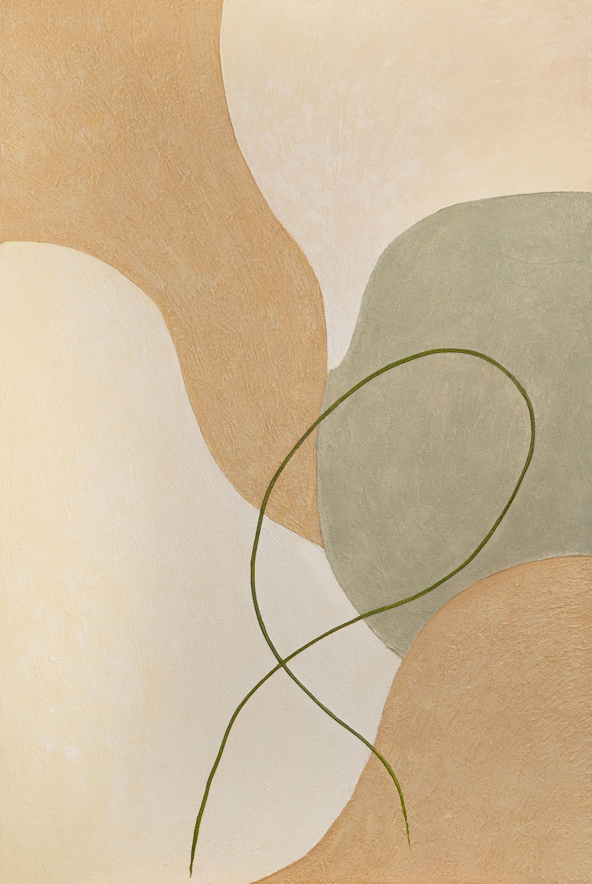 «Entrelazando» es una pintura acrílica pintada a mano que cautiva con sus líneas suaves y su armoniosa composición cromática. Delicados tonos beige, zonas cremosas y un sutil toque verde crean un movimiento orgánico y sereno, elegante y moderno a la vez.