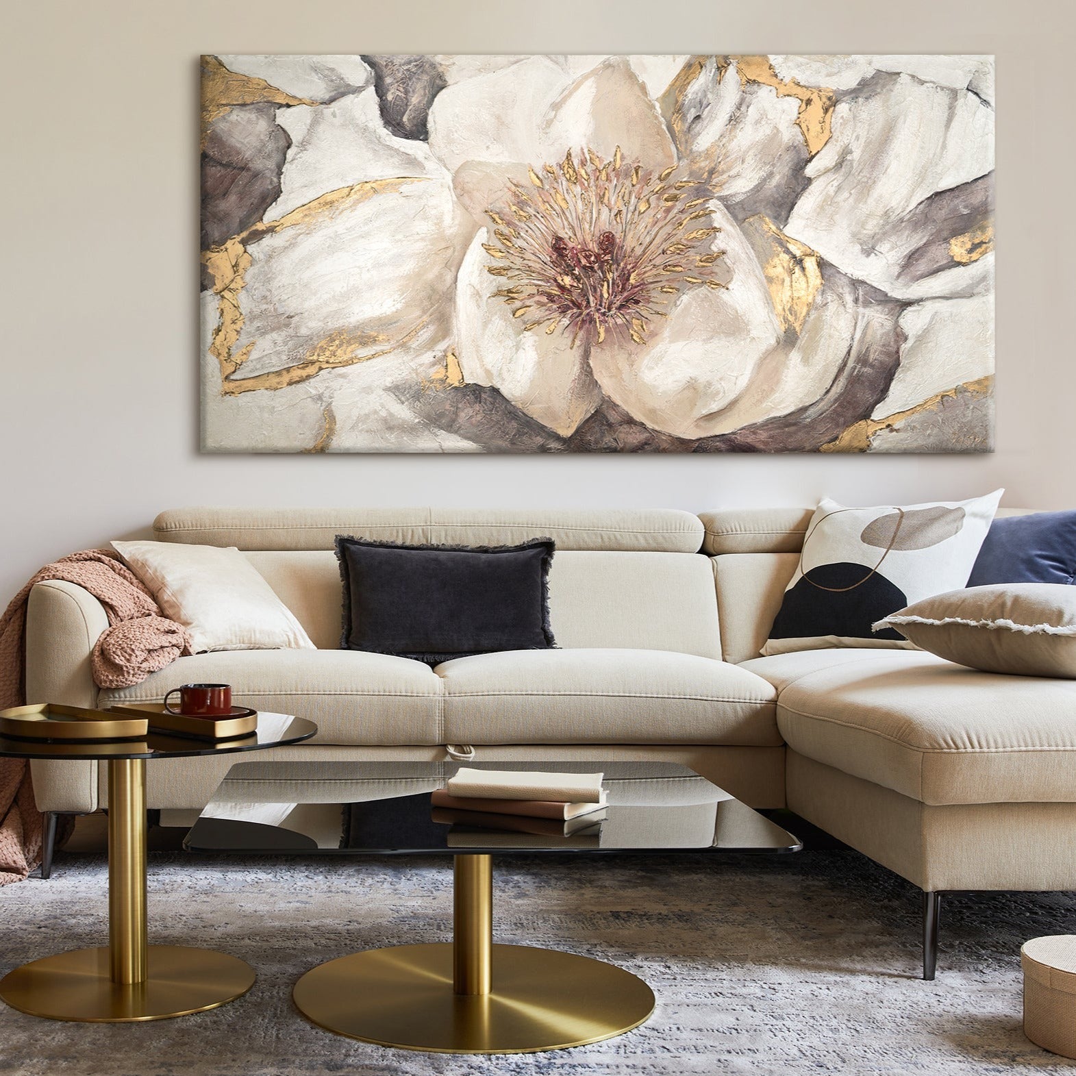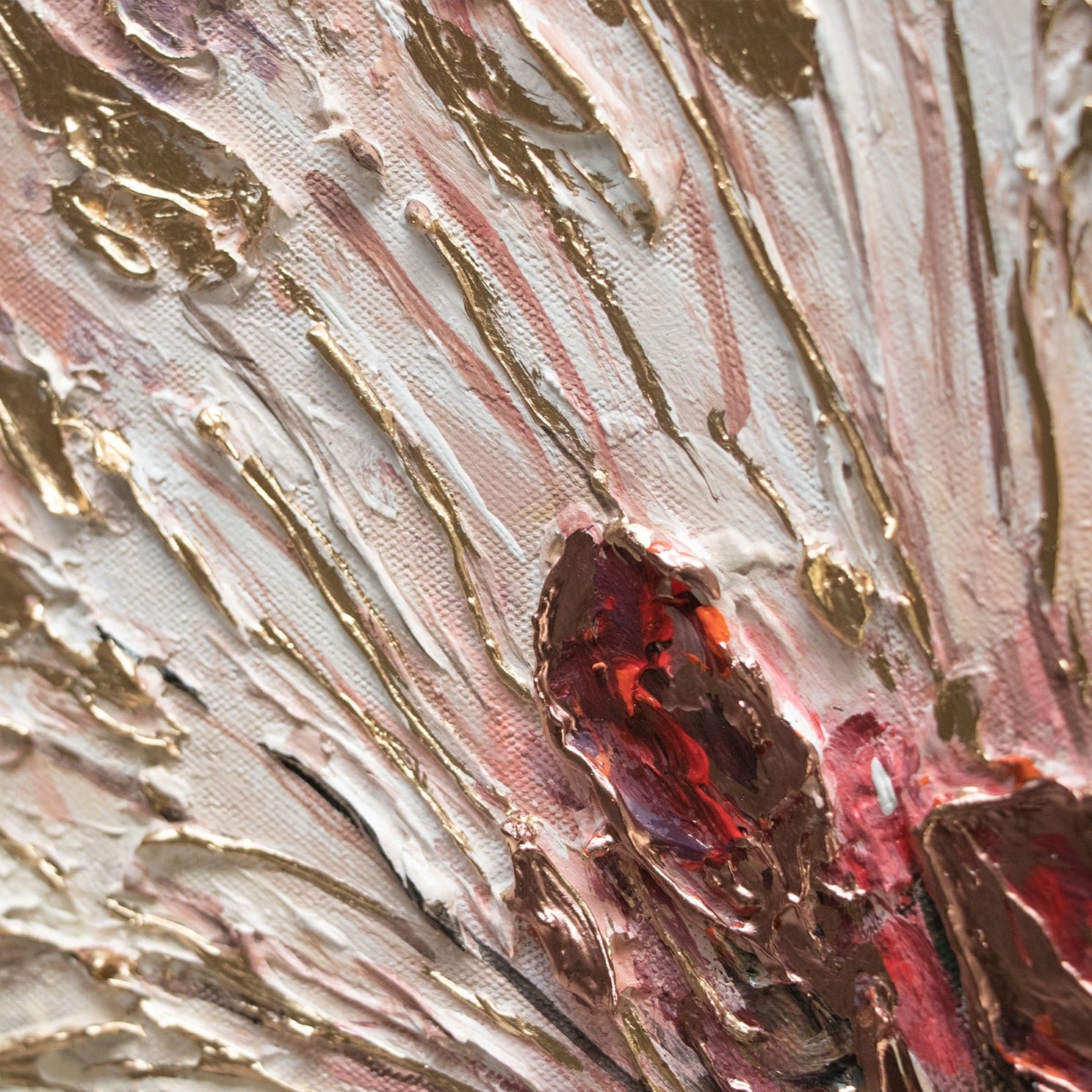 Aporta un toque especial a tu espacio con esta pintura floral hecha a mano sobre lienzo. La representación detallada y los acentos dorados crean una atmósfera lujosa y elegante. Esta obra de arte está completamente hecha a mano y es una pieza única. Disfruta del envío gratuito directamente a tu hogar.