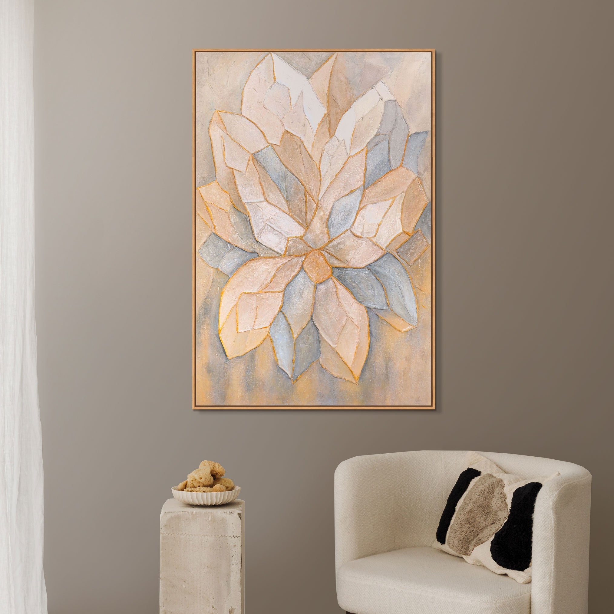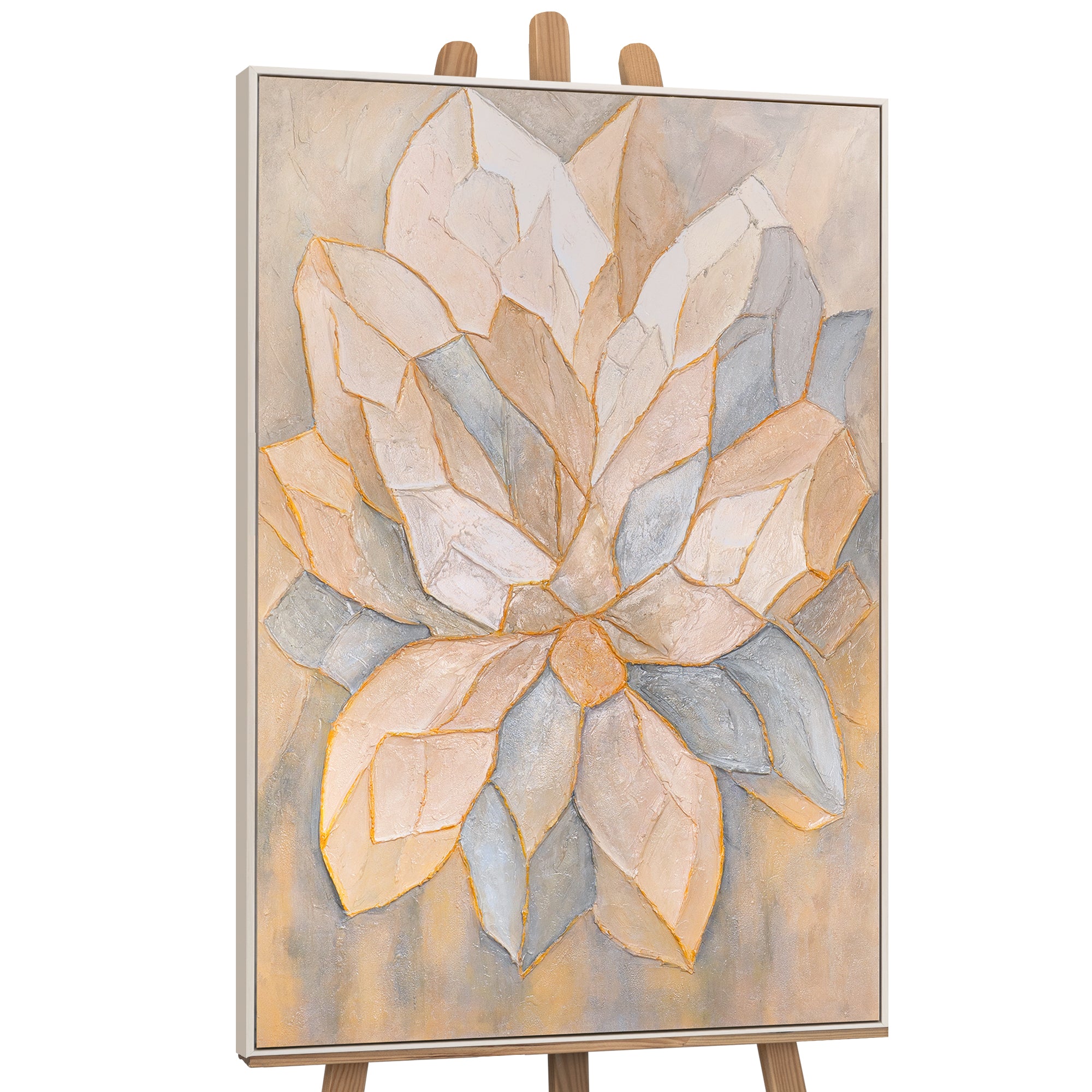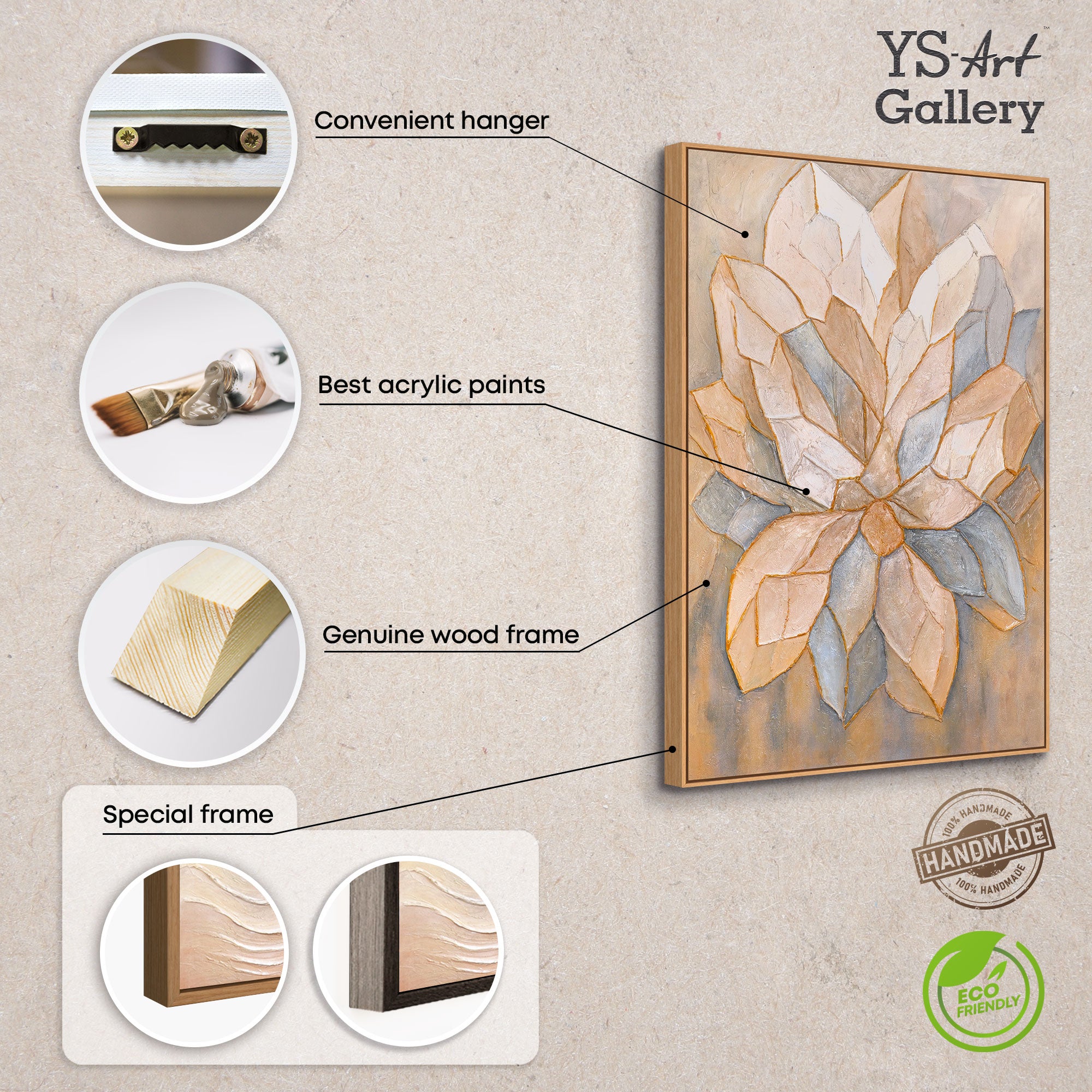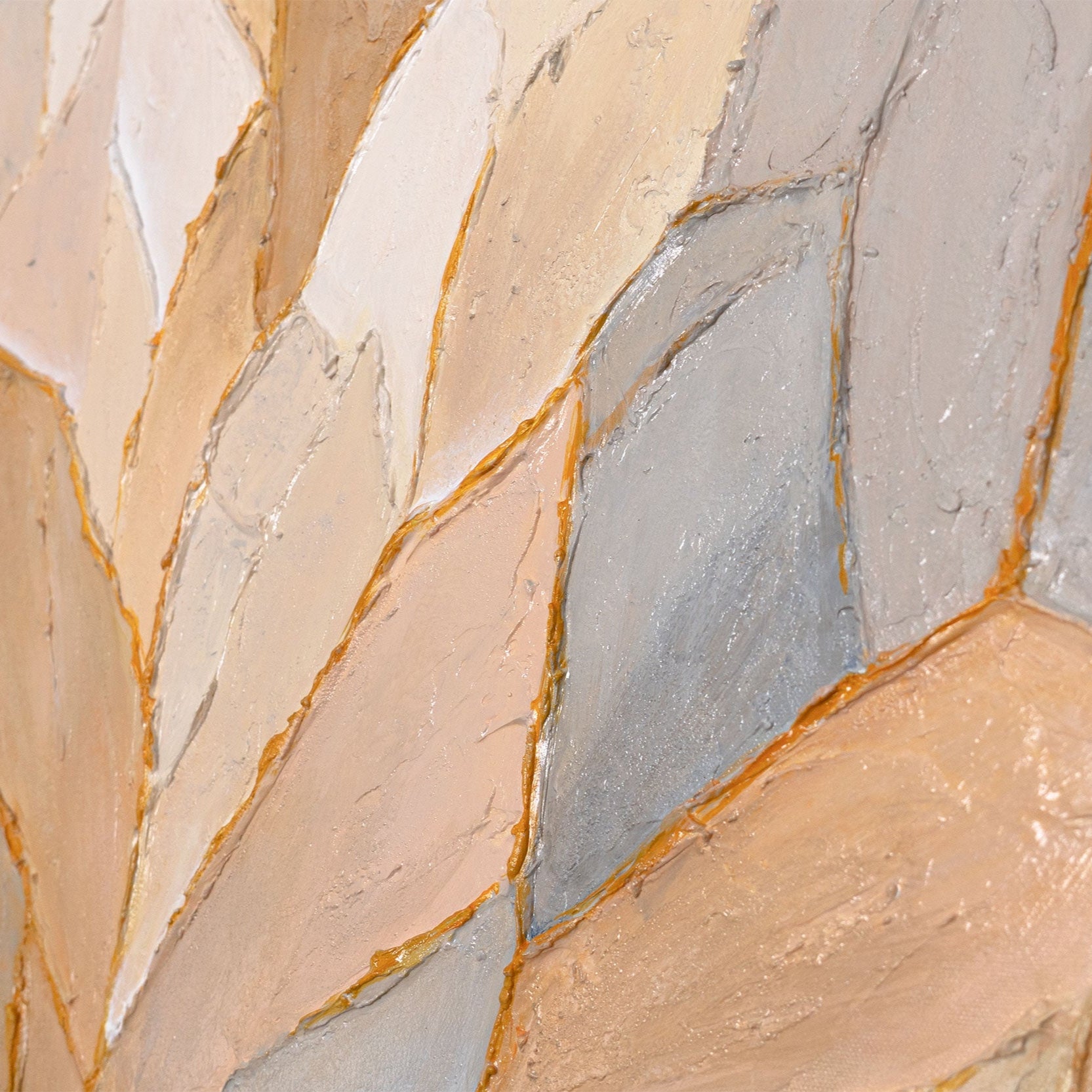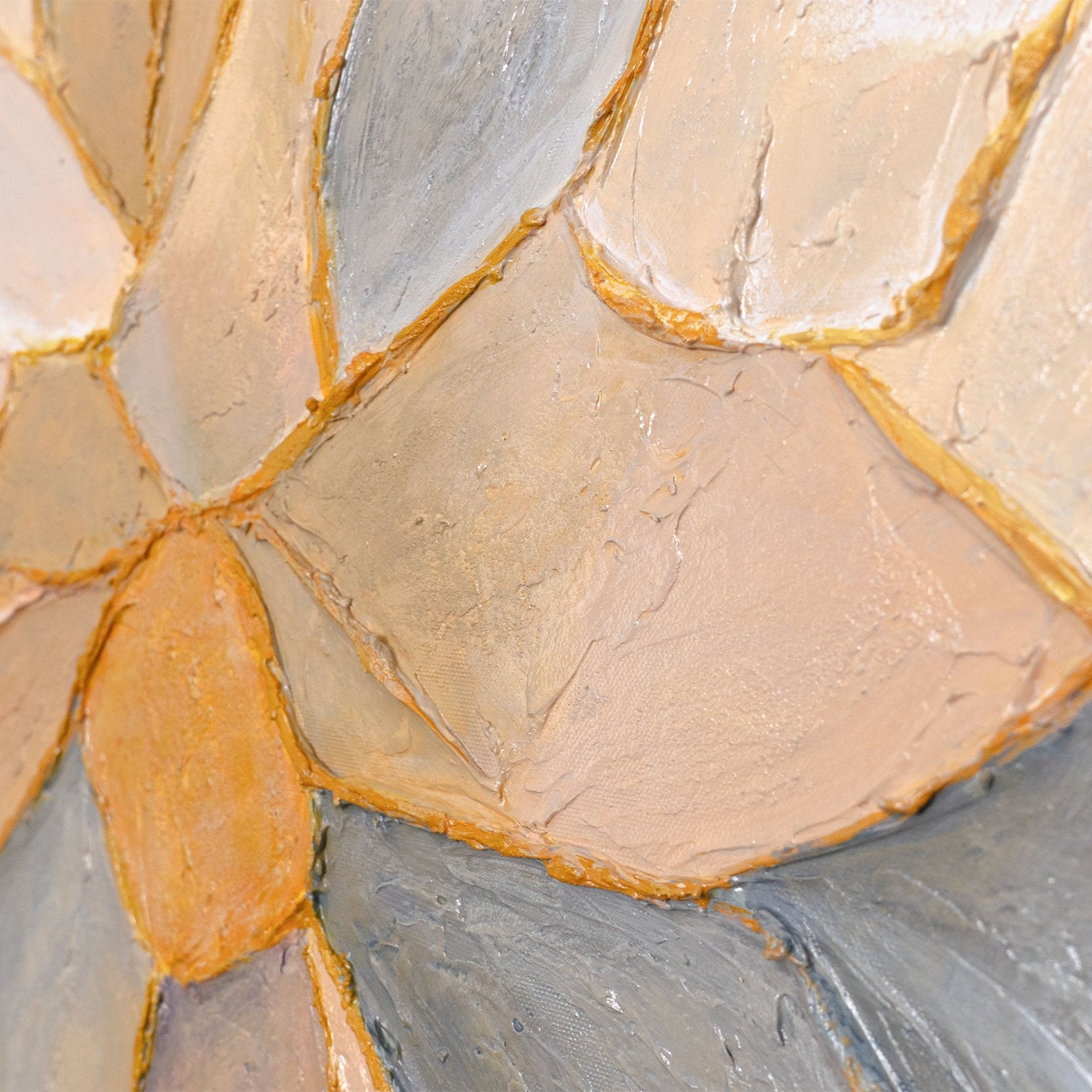 «Facetas de Pétalos» es una pintura acrílica pintada a mano que captura la belleza de las formas florales en una interpretación moderna y abstracta. Suaves tonos beige y grises, entrelazados con toques dorados, crean una armoniosa interacción que irradia elegancia y tranquilidad. La textura en relieve añade profundidad y vitalidad, permitiendo que la obra despliegue todo su esplendor en cualquier espacio.