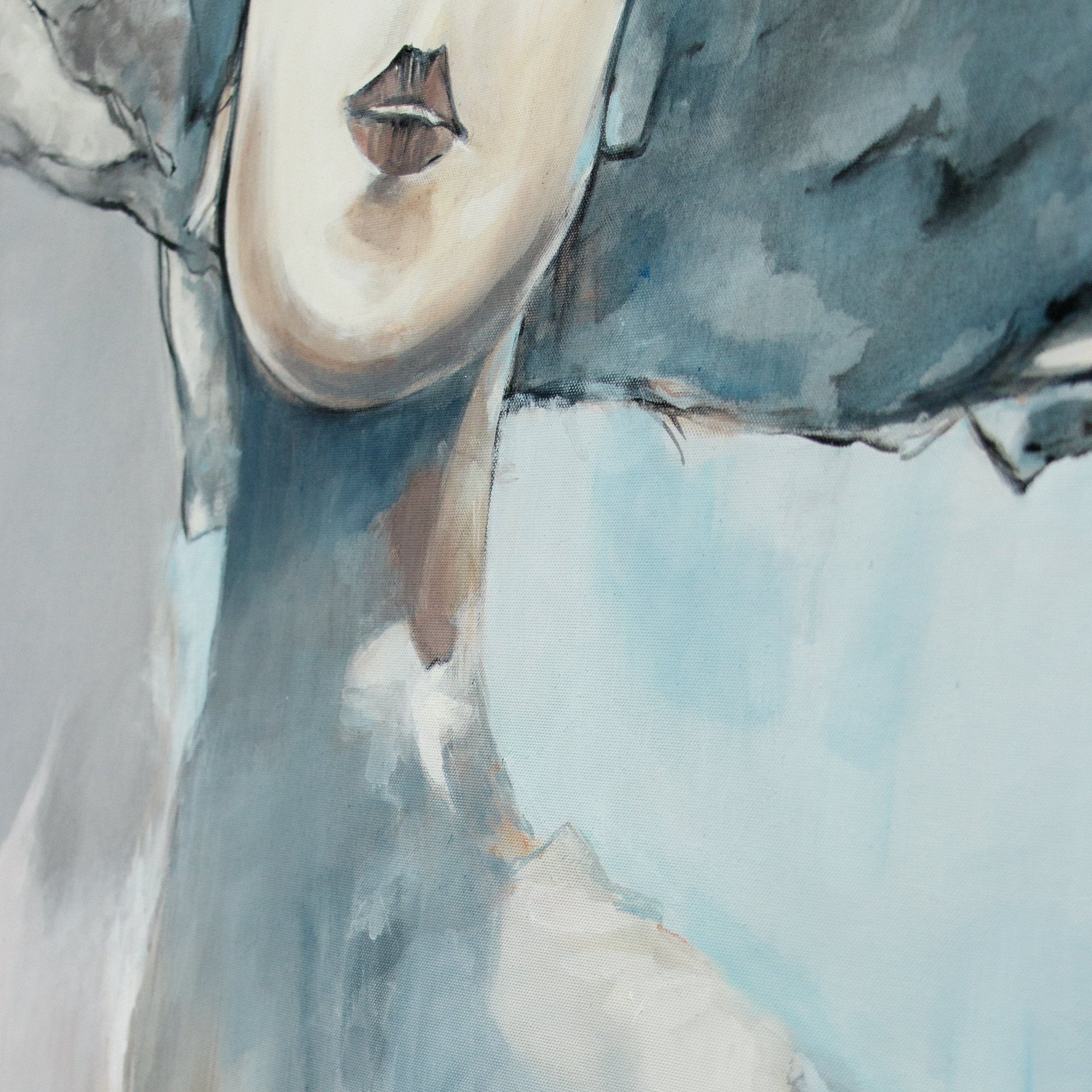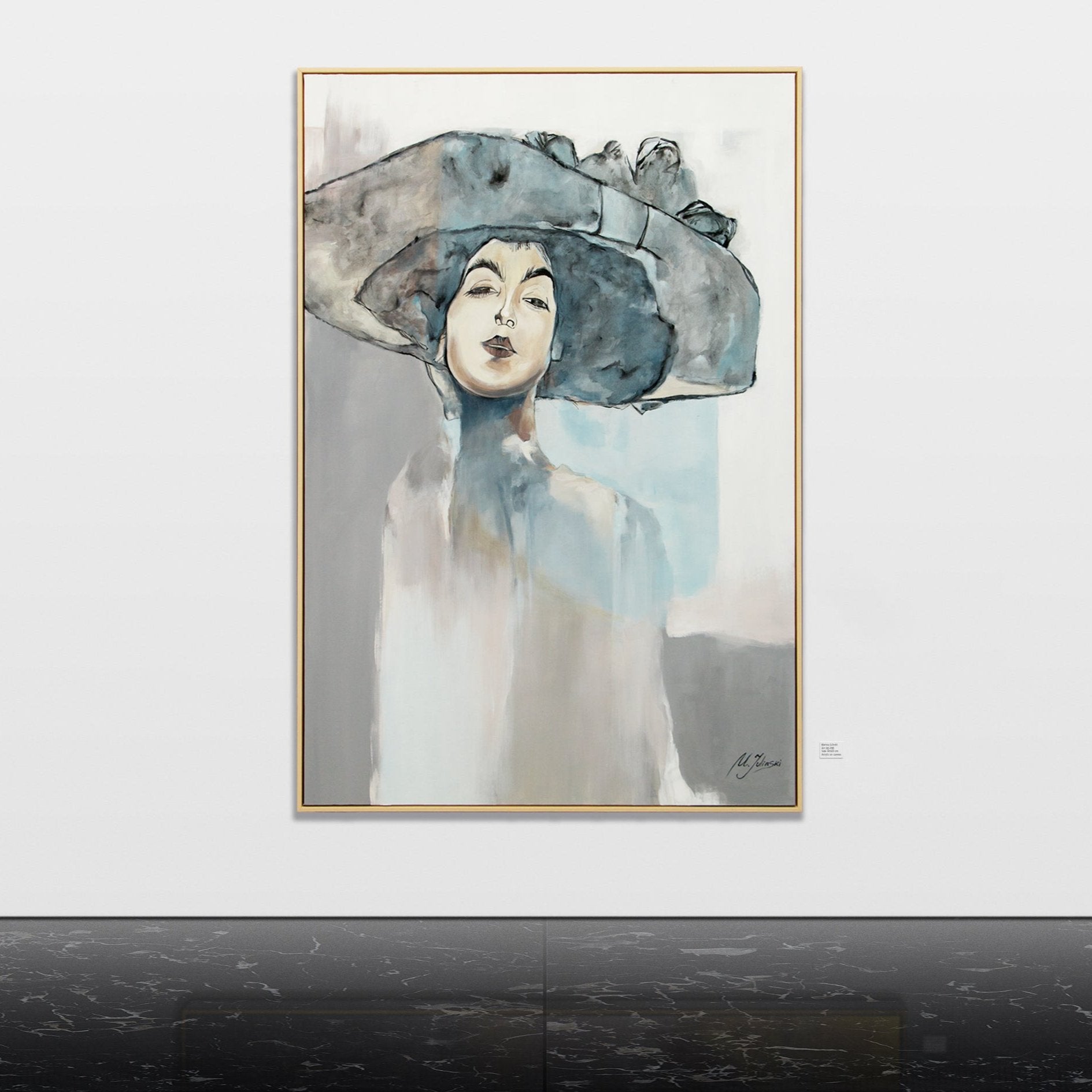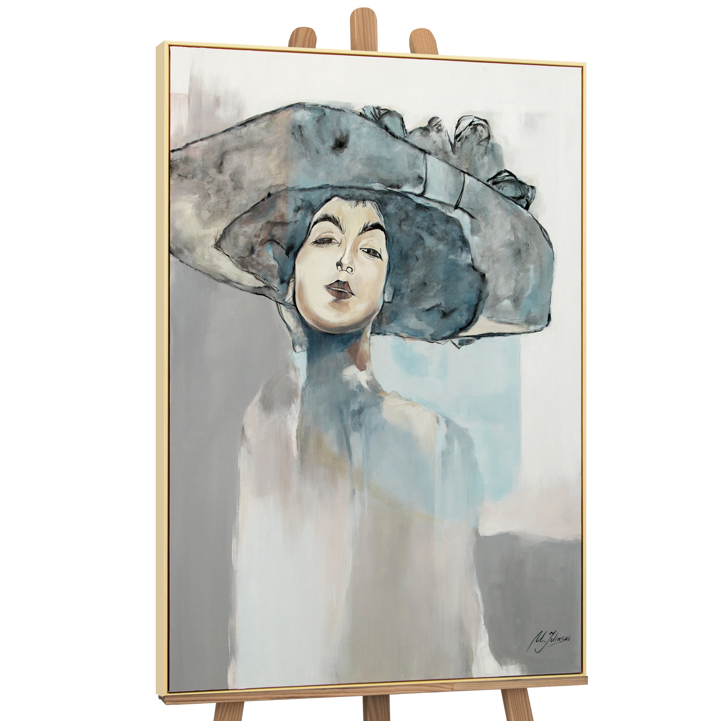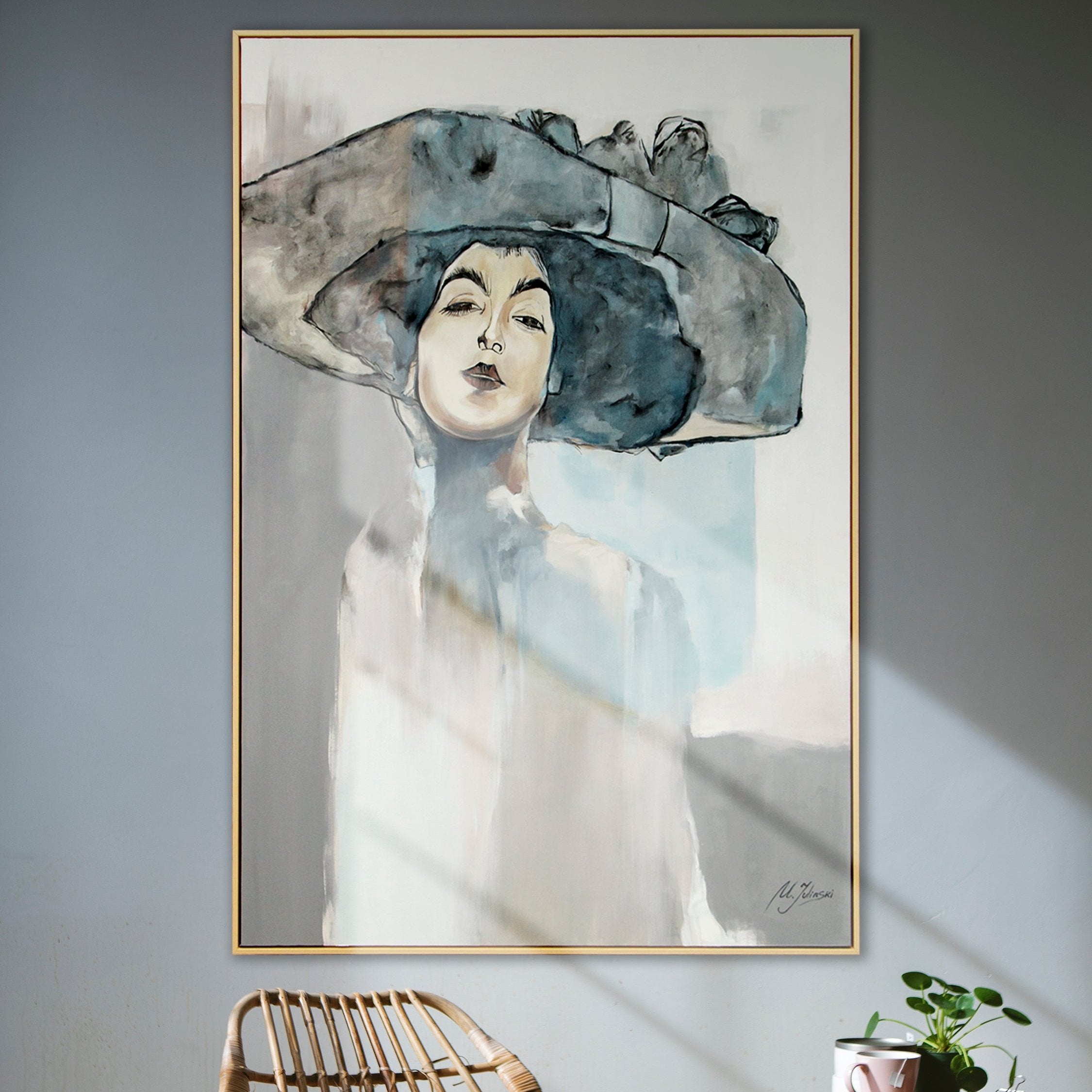 Esta pintura acrílica hecha a mano presenta un retrato elegante de una mujer con sombrero, realizado con suaves transiciones de color en tonos grises y azules que aportan profundidad y distinción. El estilo minimalista pero expresivo convierte esta obra en un punto focal ideal para interiores modernos.