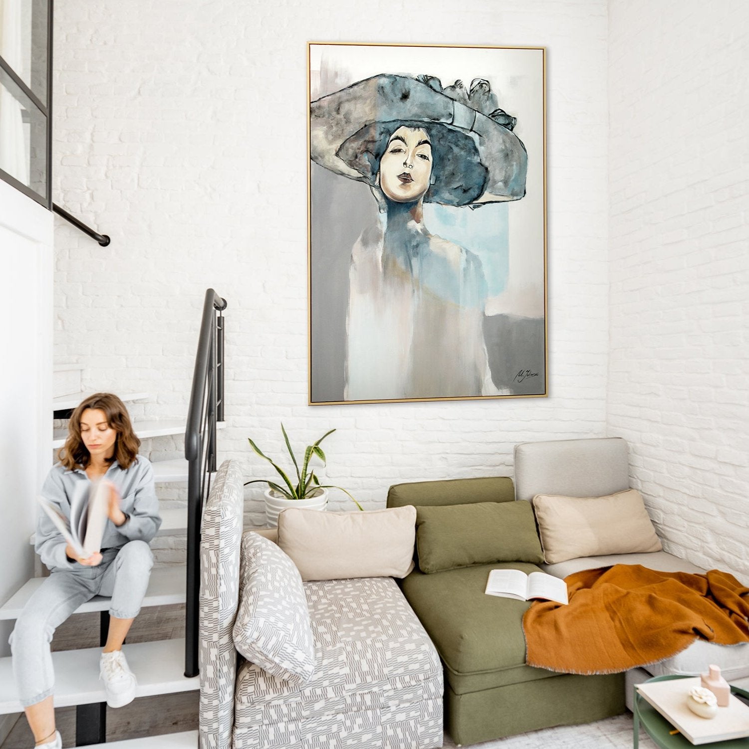 • Pintura acrílica moderna “Bridget” – Mujer con sombrero sobre lienzo