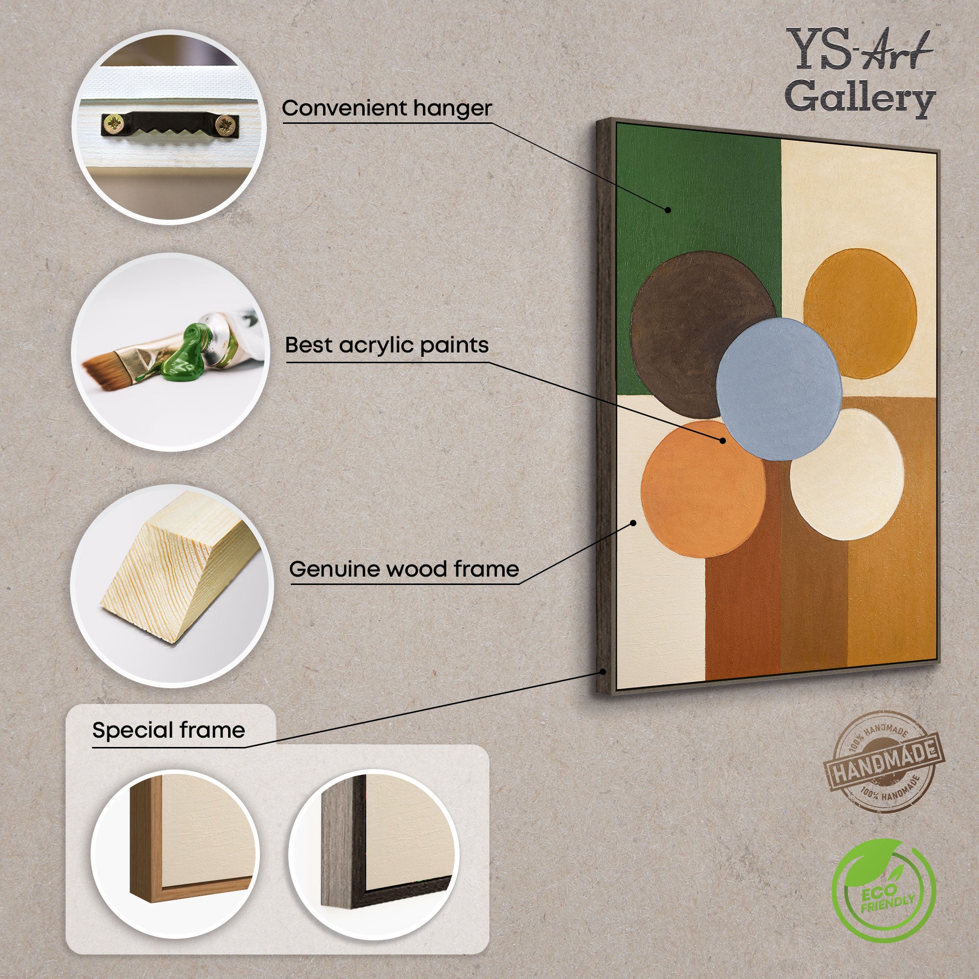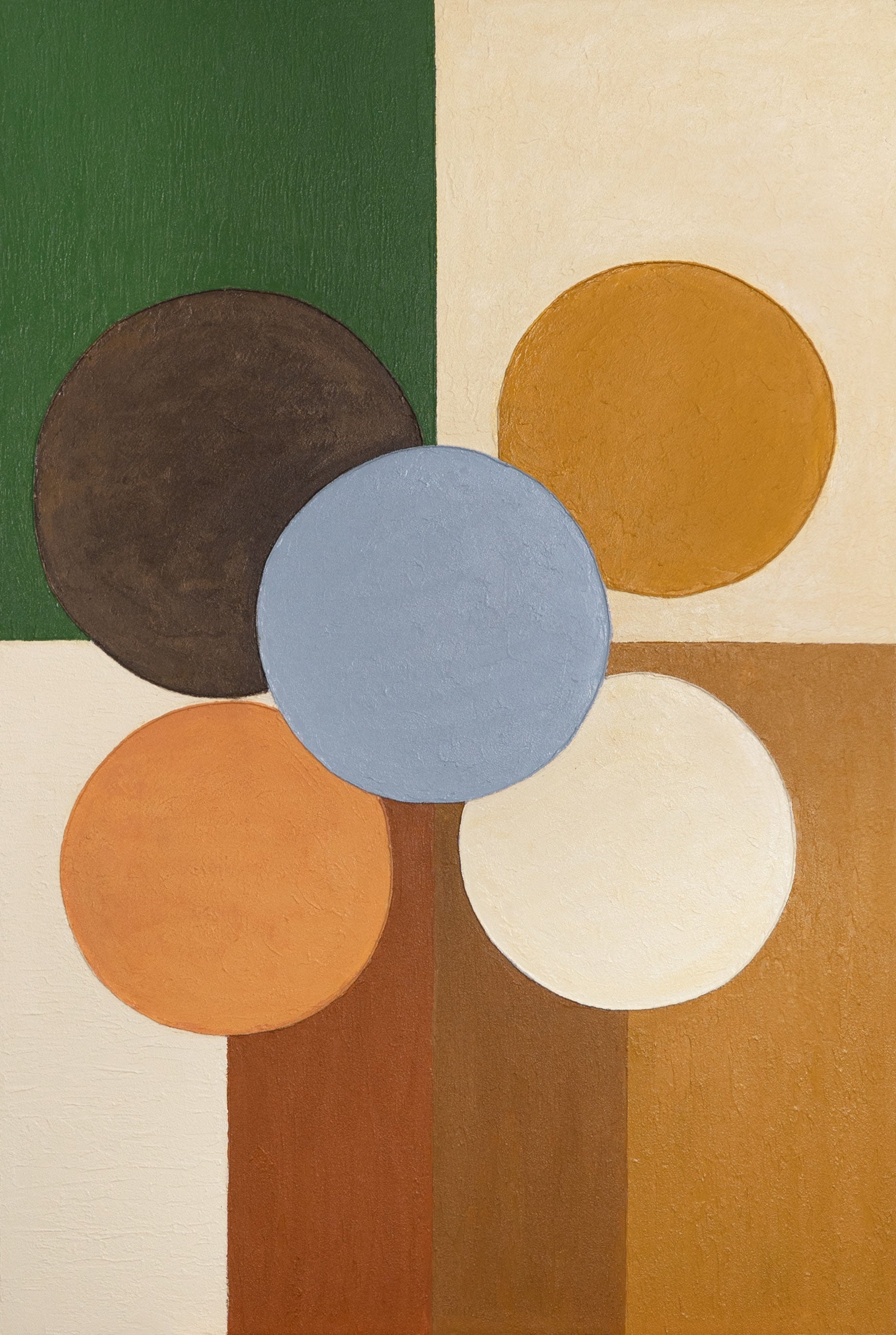 «Esfera de Equilibrio» es una pintura acrílica moderna, pintada a mano sobre lienzo, que cautiva con sus formas geométricas definidas y sus armoniosos colores. Tonos tierra, marrones y beiges se funden con verdes suaves, naranjas vibrantes y azules fríos para crear una composición que irradia tranquilidad y equilibrio. La textura de la superficie le confiere profundidad y una experiencia táctil única.