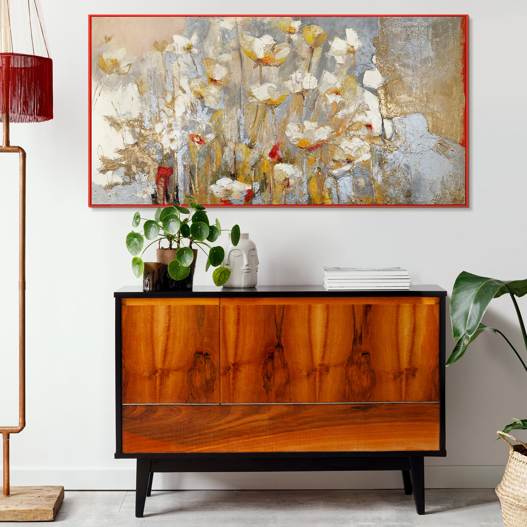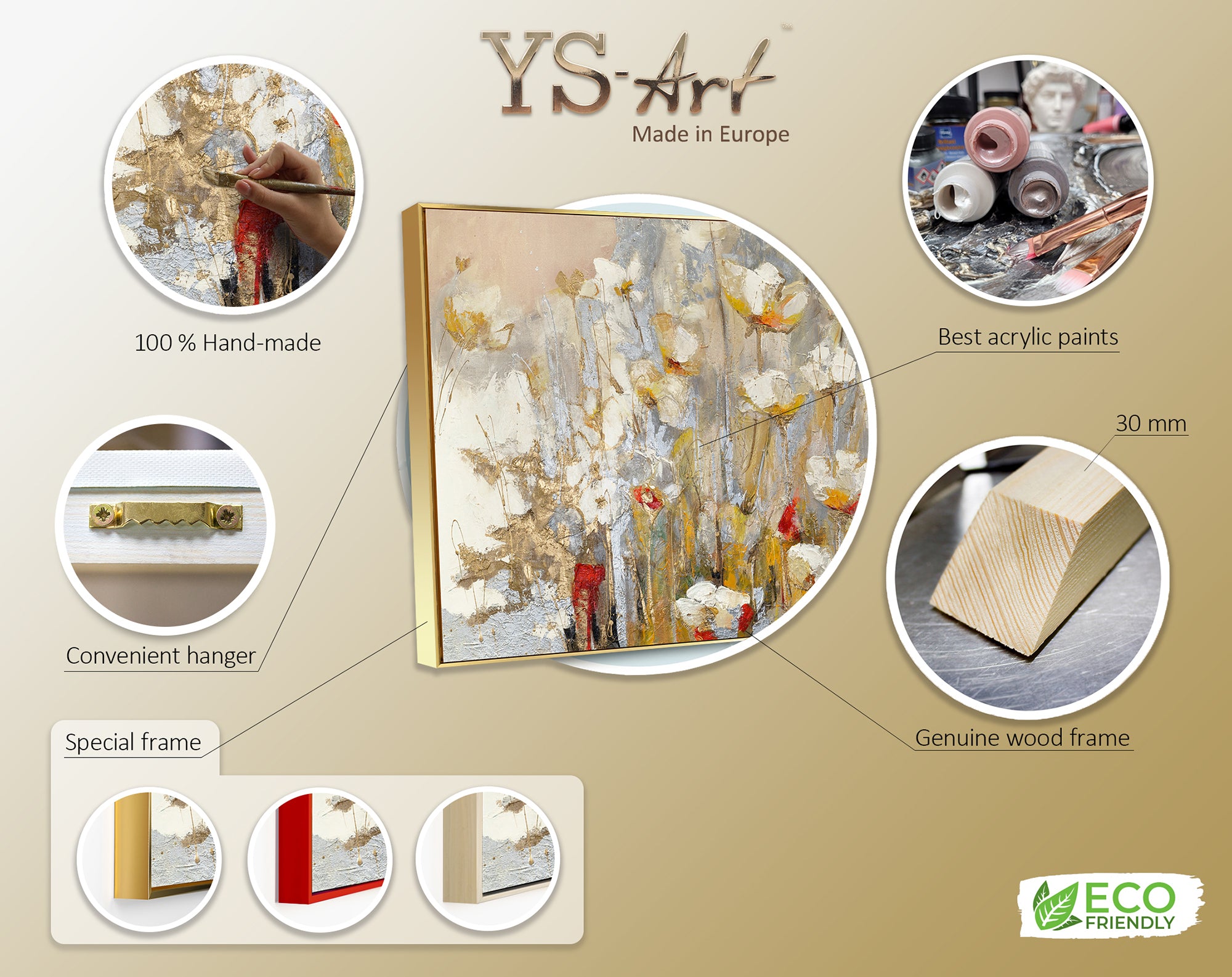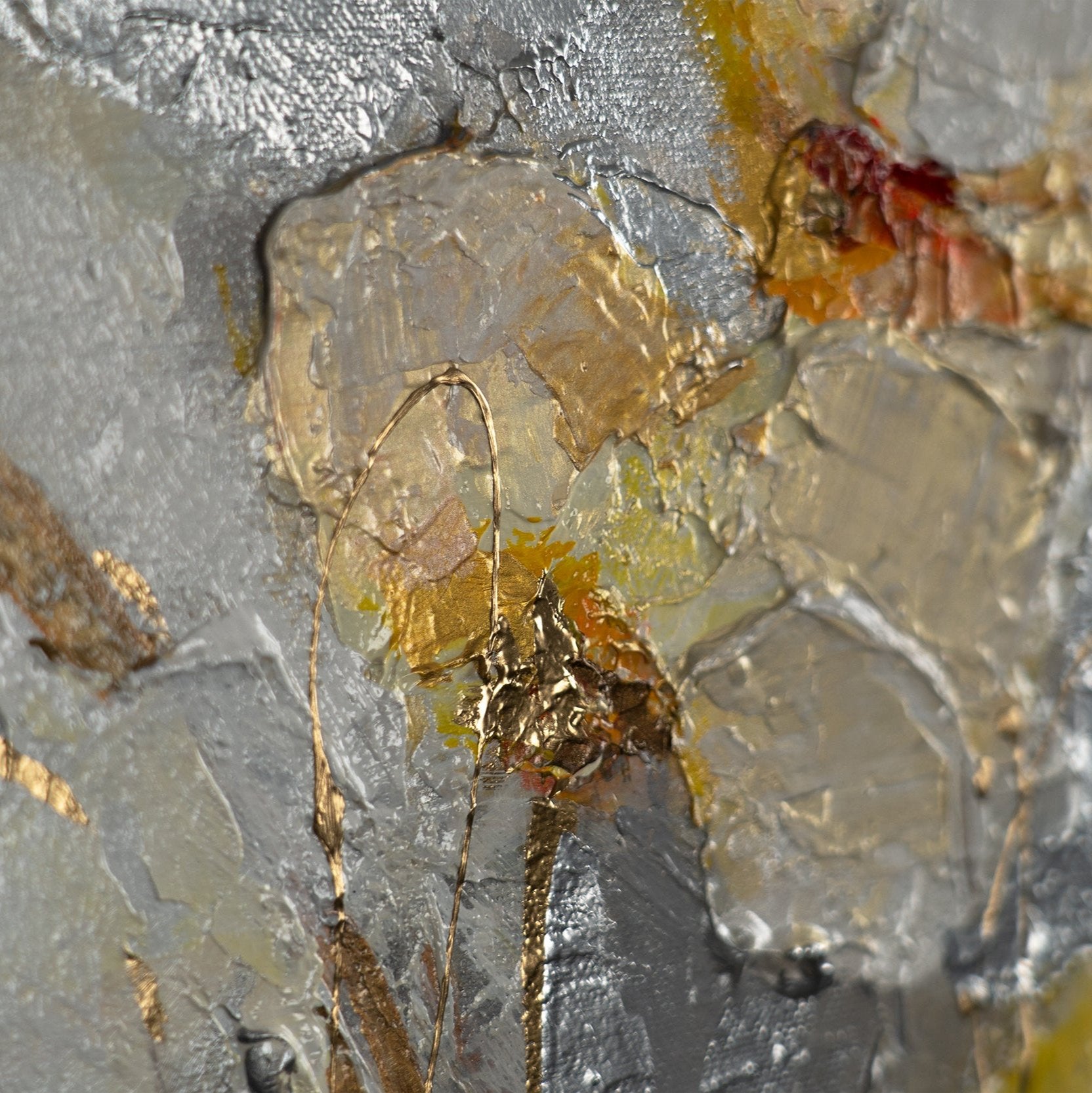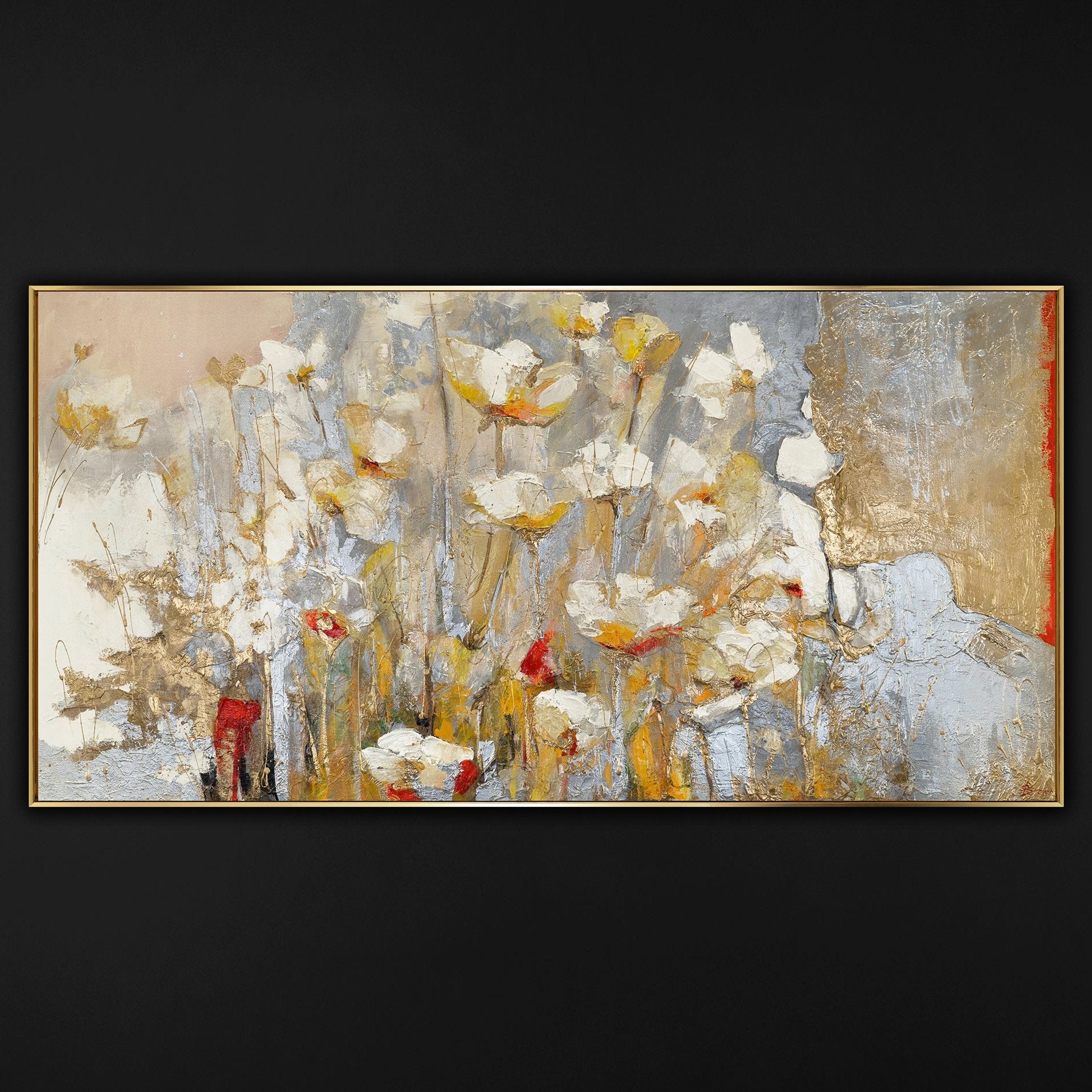 Esta impresionante pintura floral hecha a mano combina delicados tonos acrílicos con refinados acentos dorados, creando un paisaje floral encantador. Los colores vivos y la textura aplicada aportan profundidad y movimiento, haciendo que las flores parezcan cobrar vida en el lienzo.