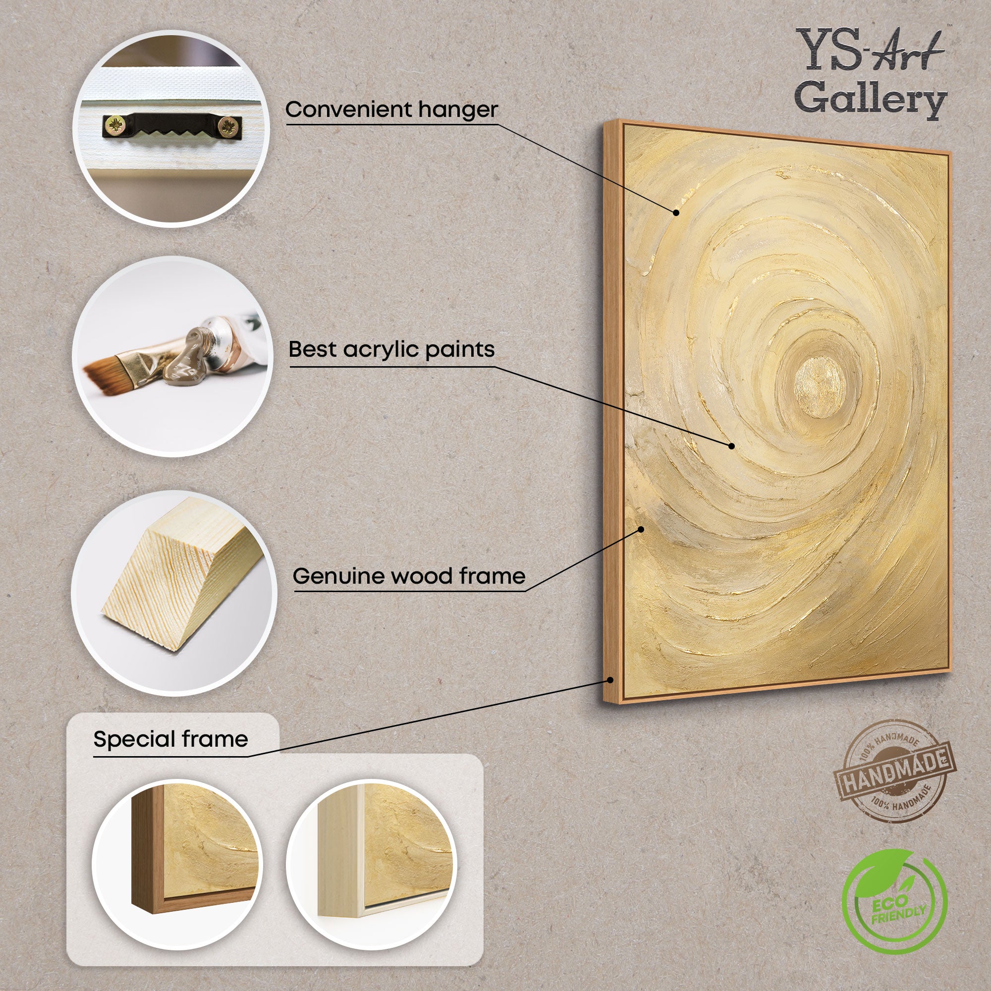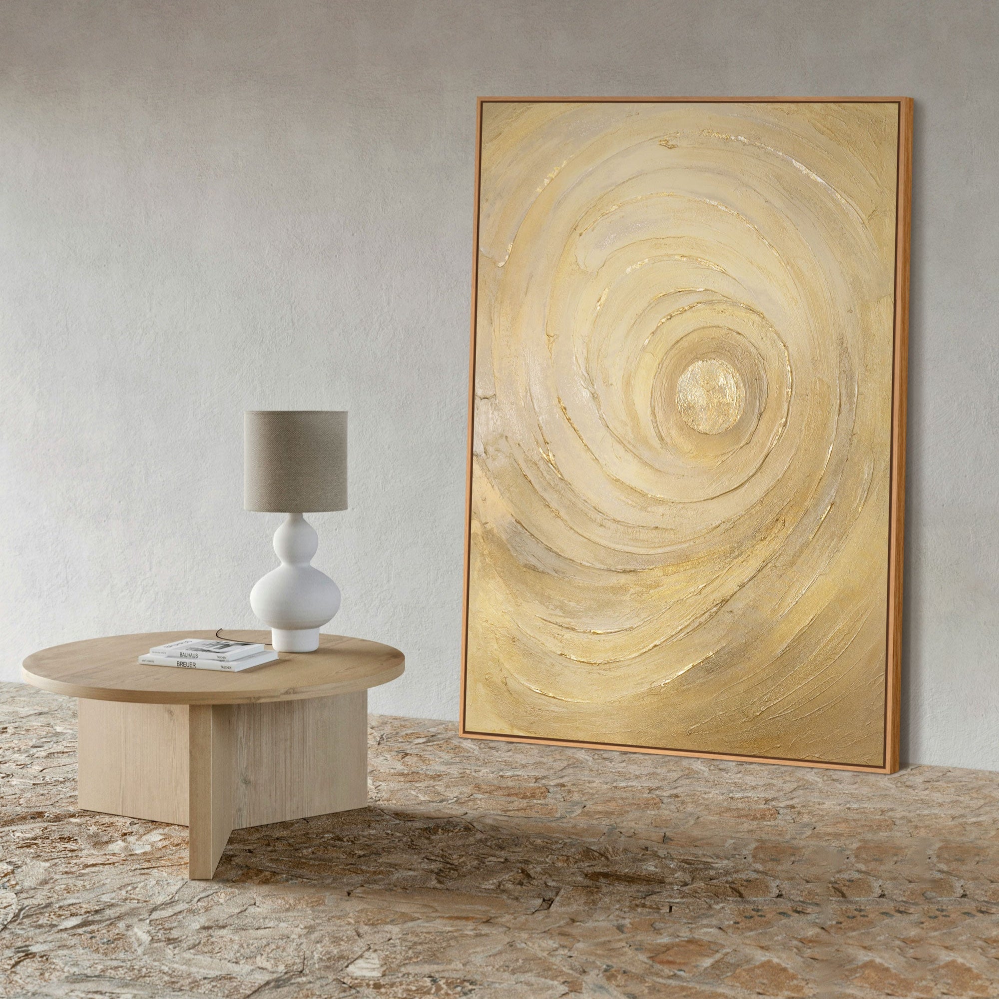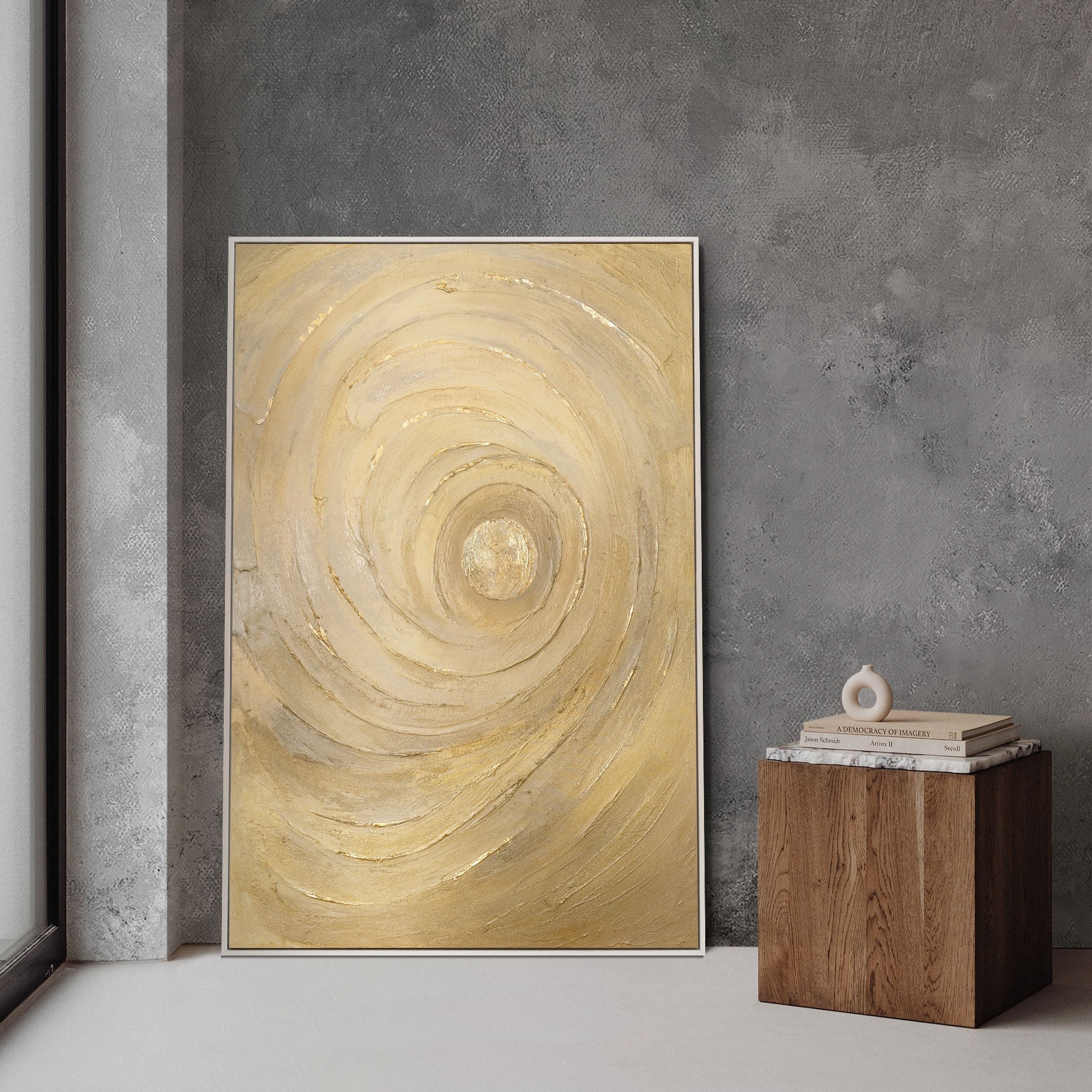 El cuadro “Círculos del Tiempo” cautiva con su forma espiral armónica, que brilla en tonos dorados sobre un lienzo texturizado. Las formas concéntricas recuerdan el flujo constante del tiempo, creando un efecto meditativo, casi hipnótico.