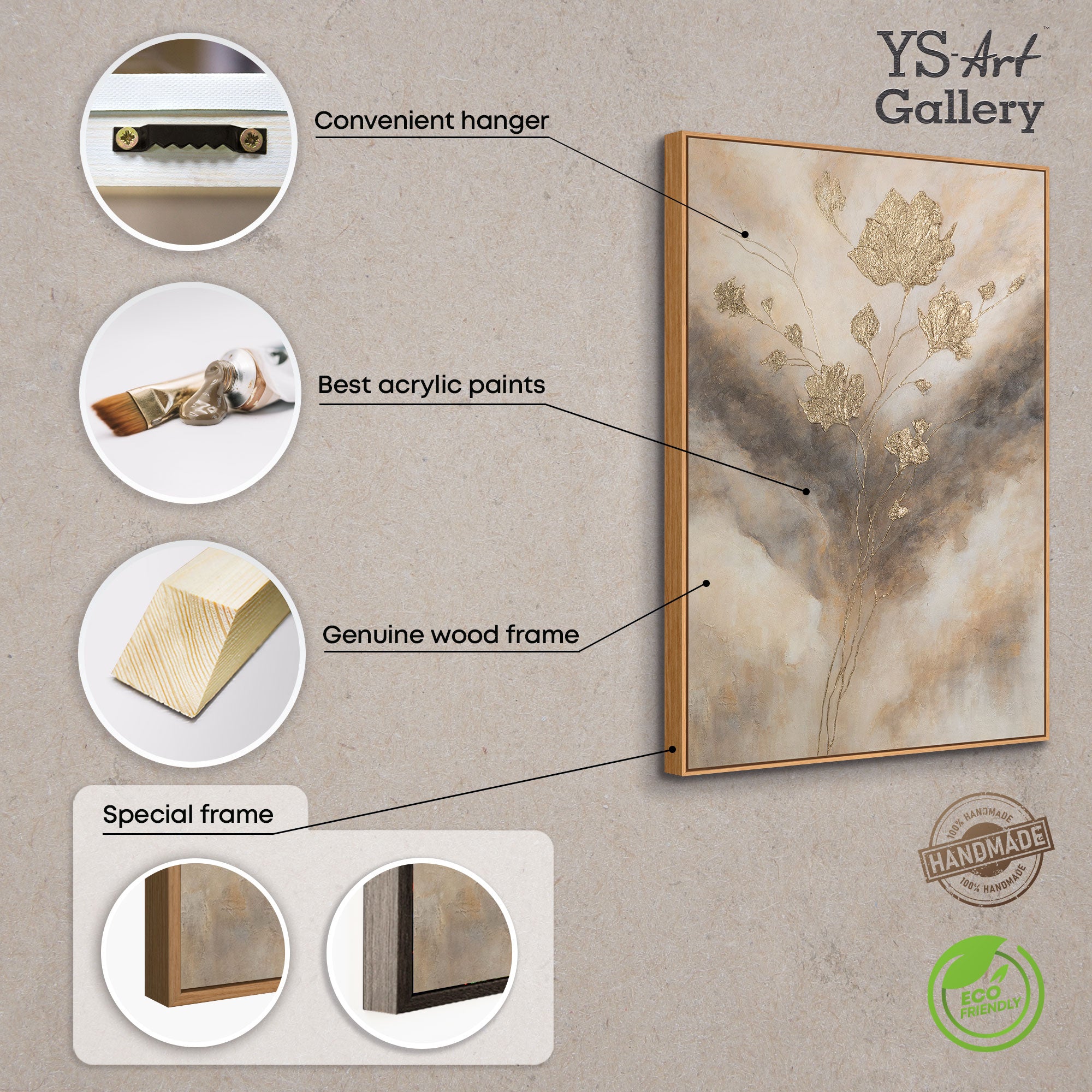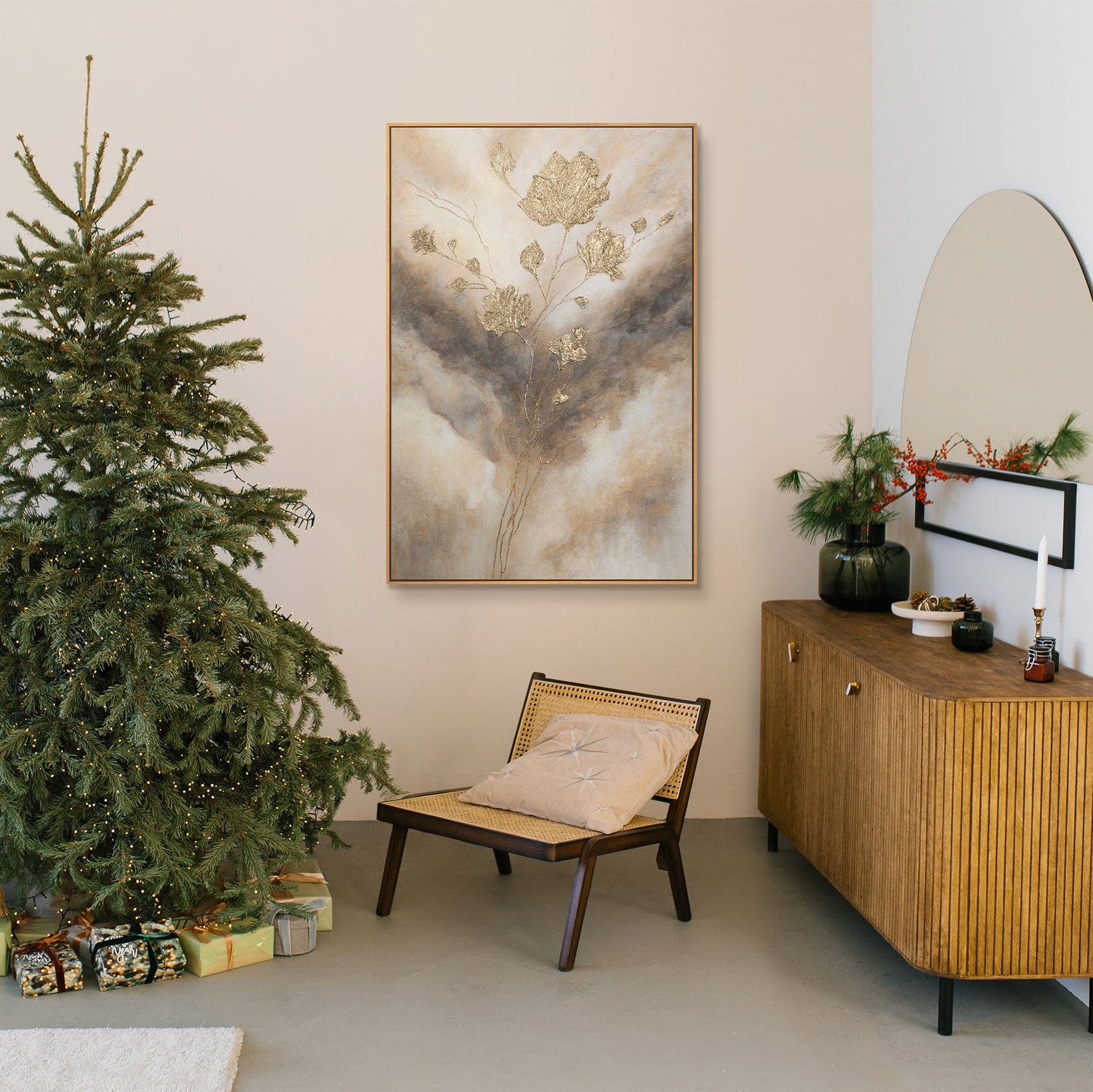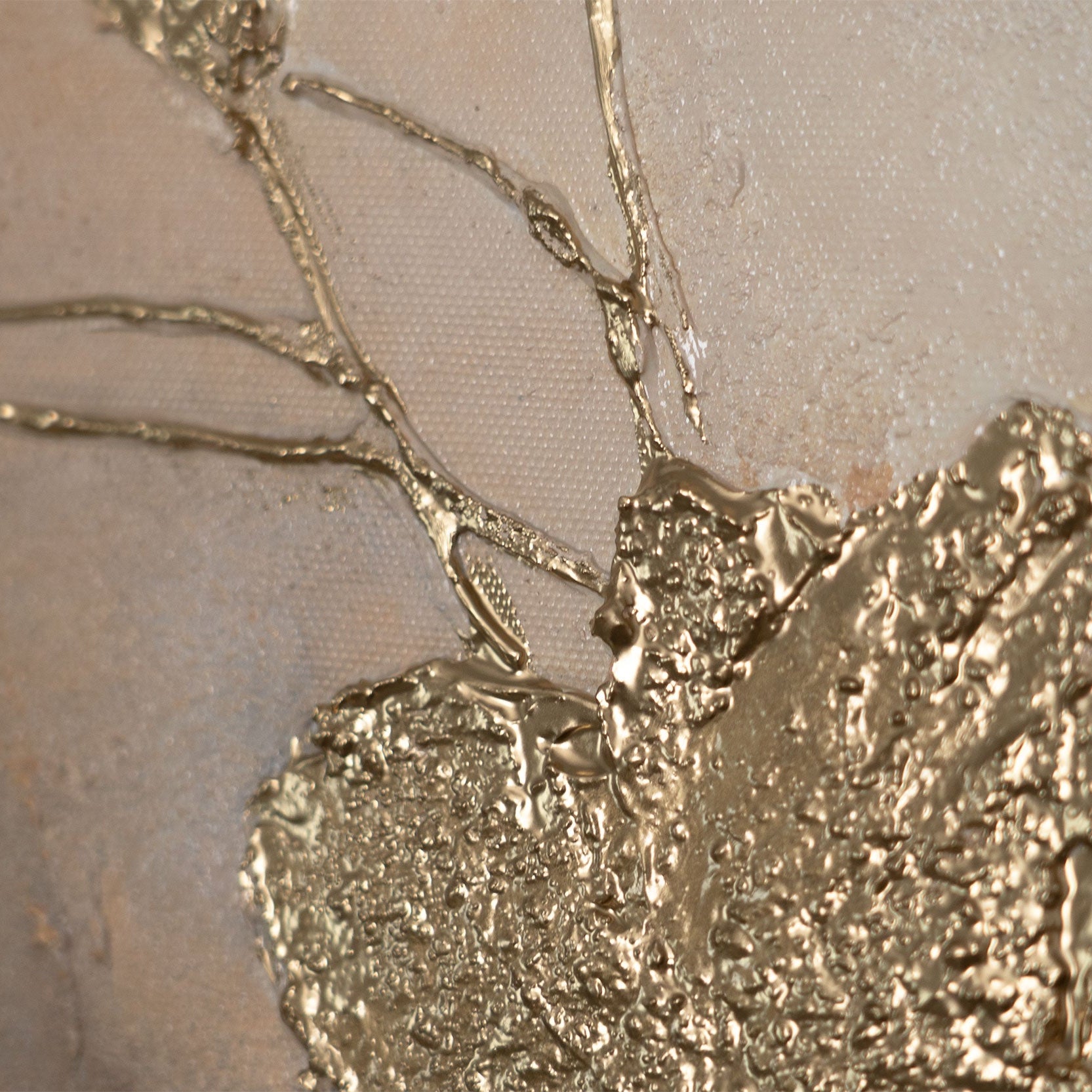 «Resplandor en las nubes» combina la elegancia floral con una profundidad abstracta. Flores doradas emergen de una composición nubosa en tonos grises, beige y crema. La delicada textura de la superficie capta la luz de forma única, otorgando a la pintura un brillo lujoso.