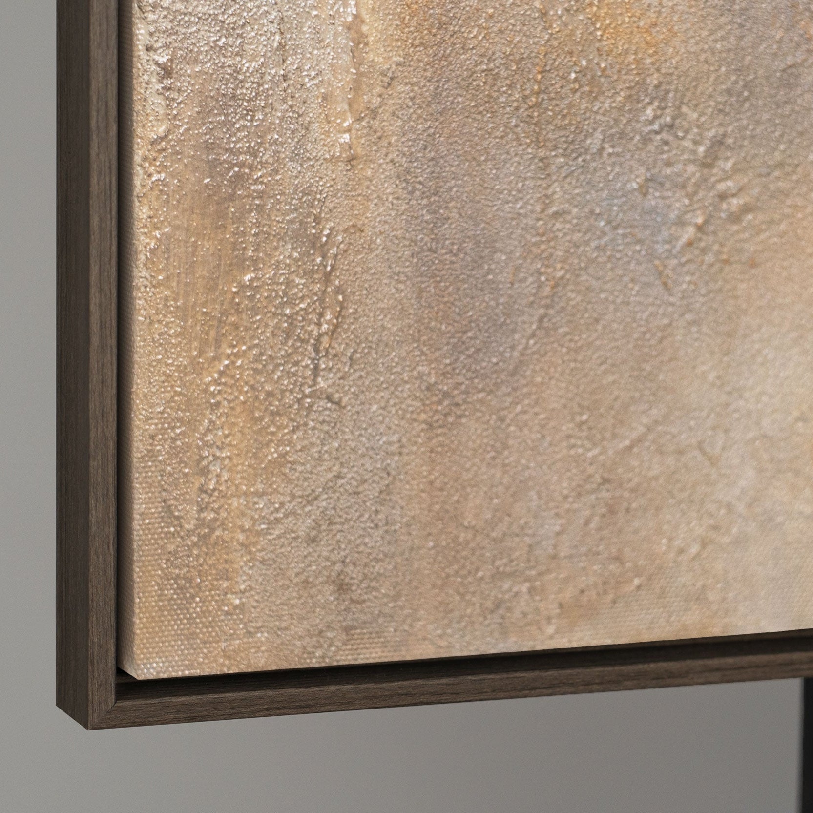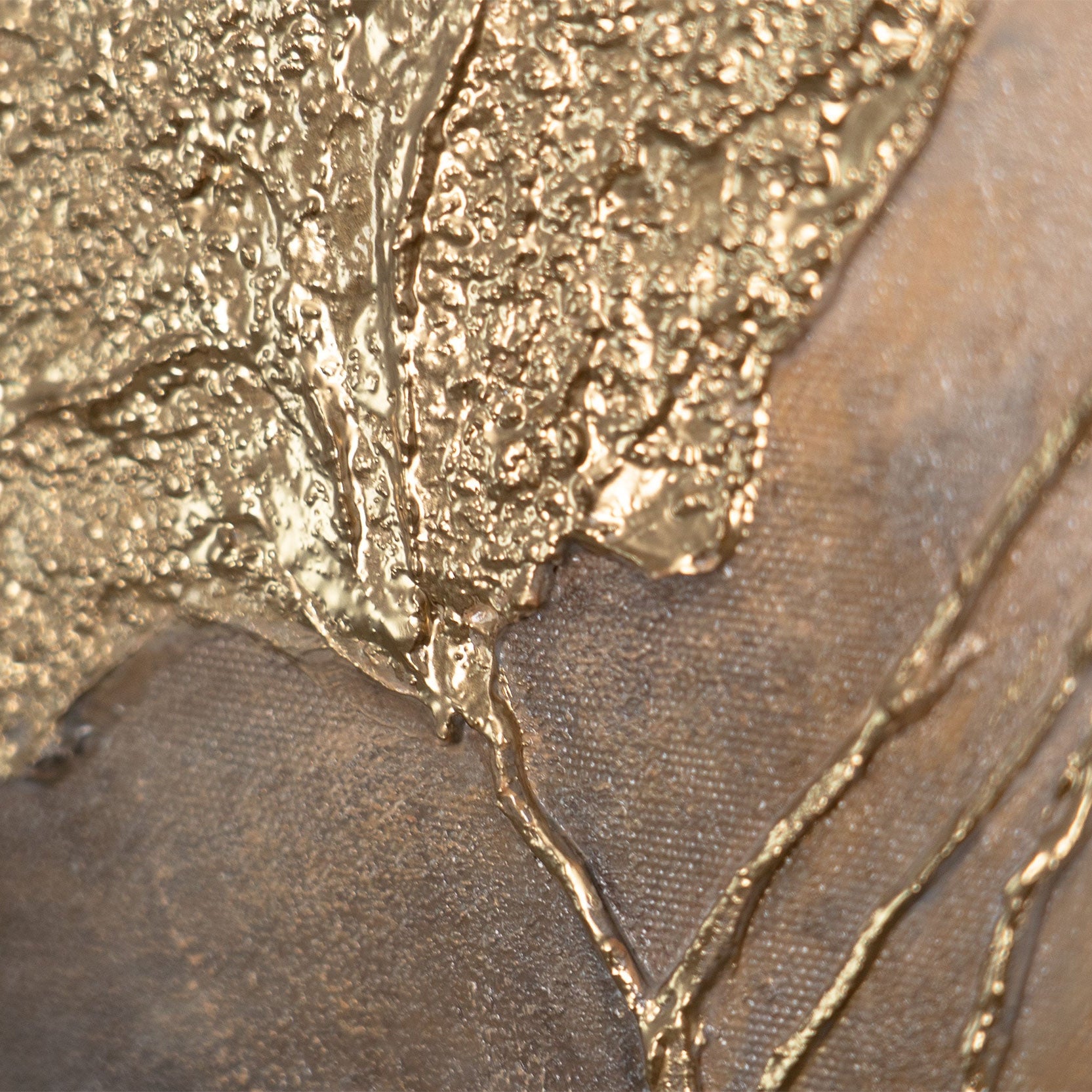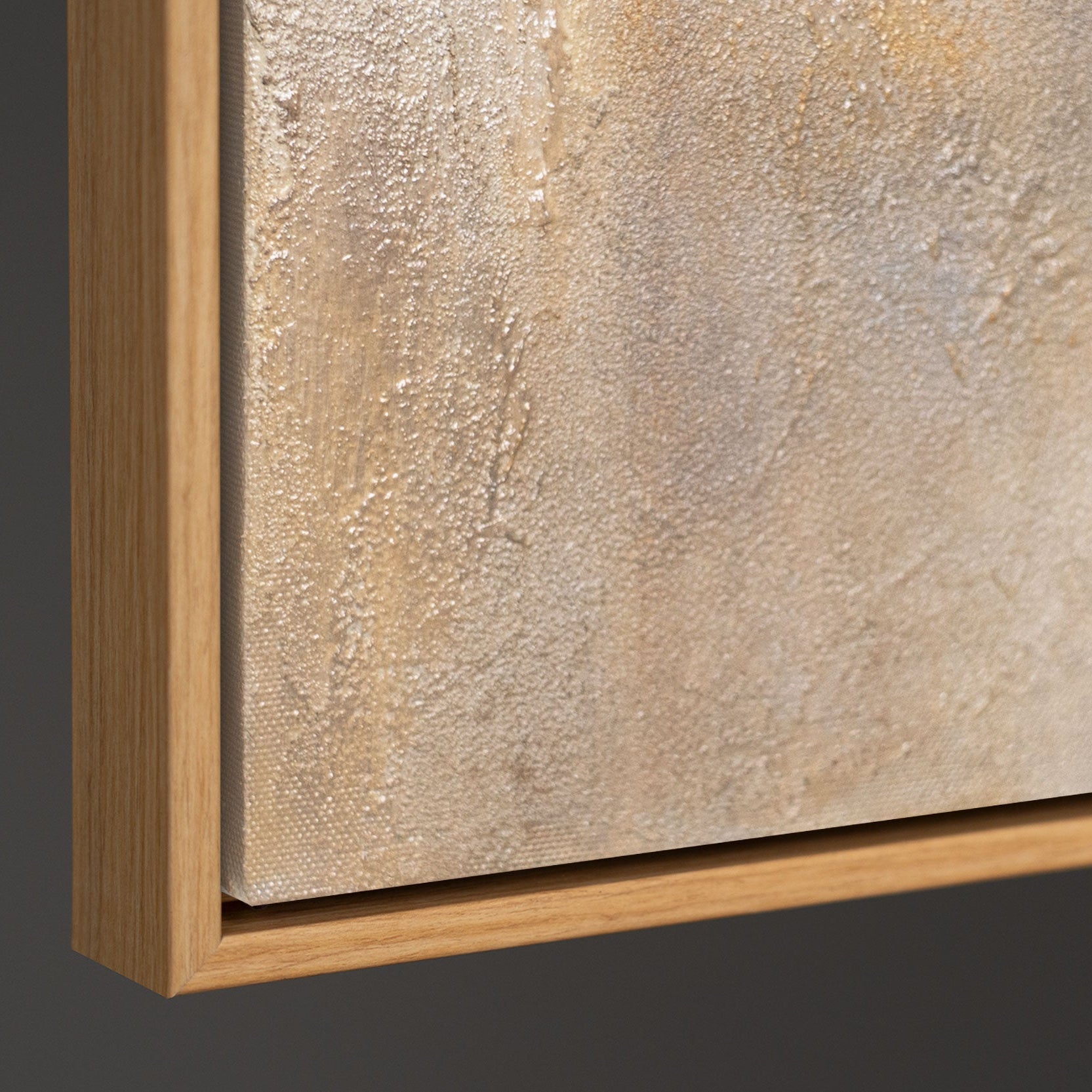 «Resplandor en las nubes» combina la elegancia floral con una profundidad abstracta. Flores doradas emergen de una composición nubosa en tonos grises, beige y crema. La delicada textura de la superficie capta la luz de forma única, otorgando a la pintura un brillo lujoso.