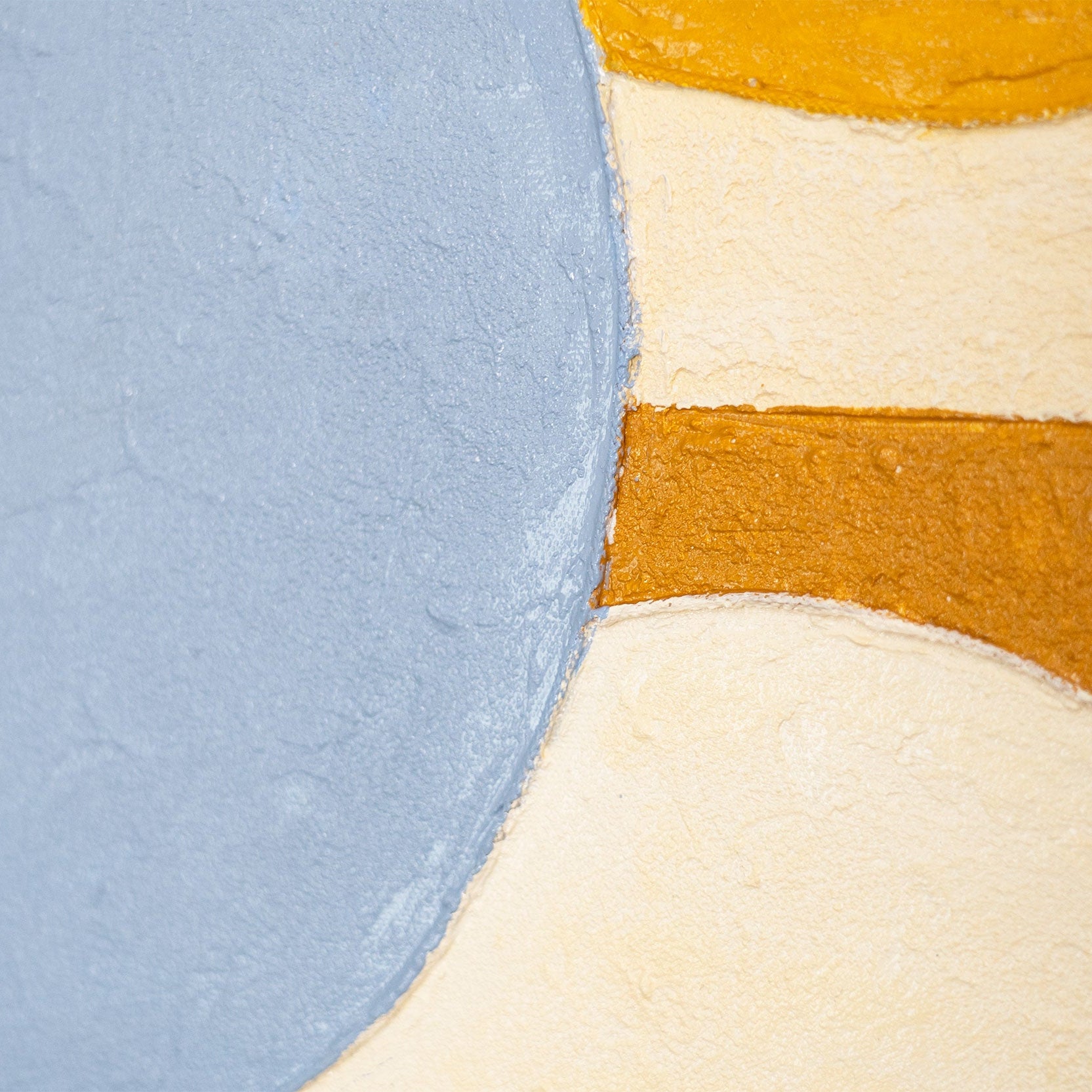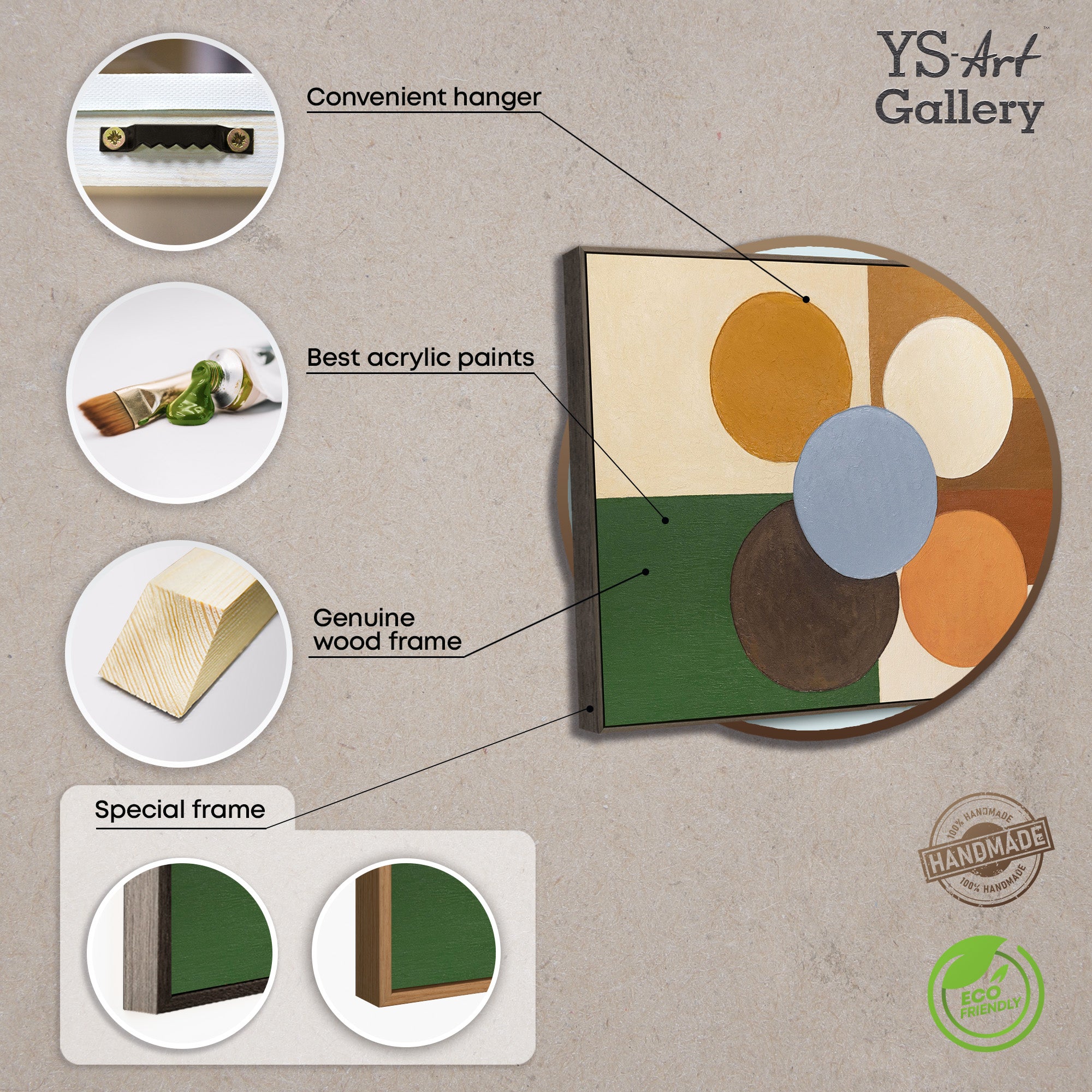 «Esfera del equilibrio» es una pintura acrílica abstracta moderna con formas circulares claras y una estructura geométrica tranquila. La composición equilibrada de beige, ocre, verde, azul y colores naturales cálidos crea un efecto armonioso y transmite estabilidad y tranquilidad visual.
