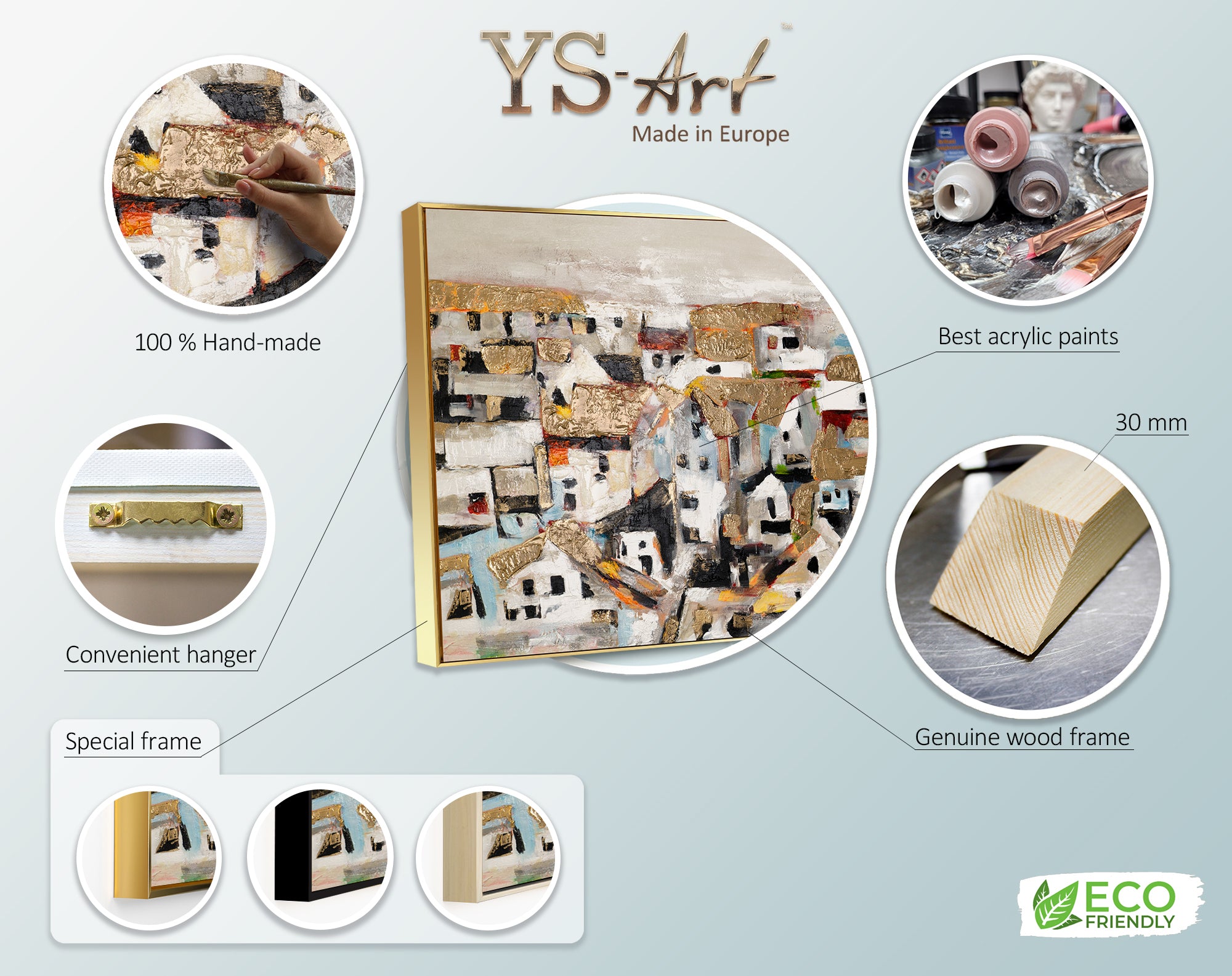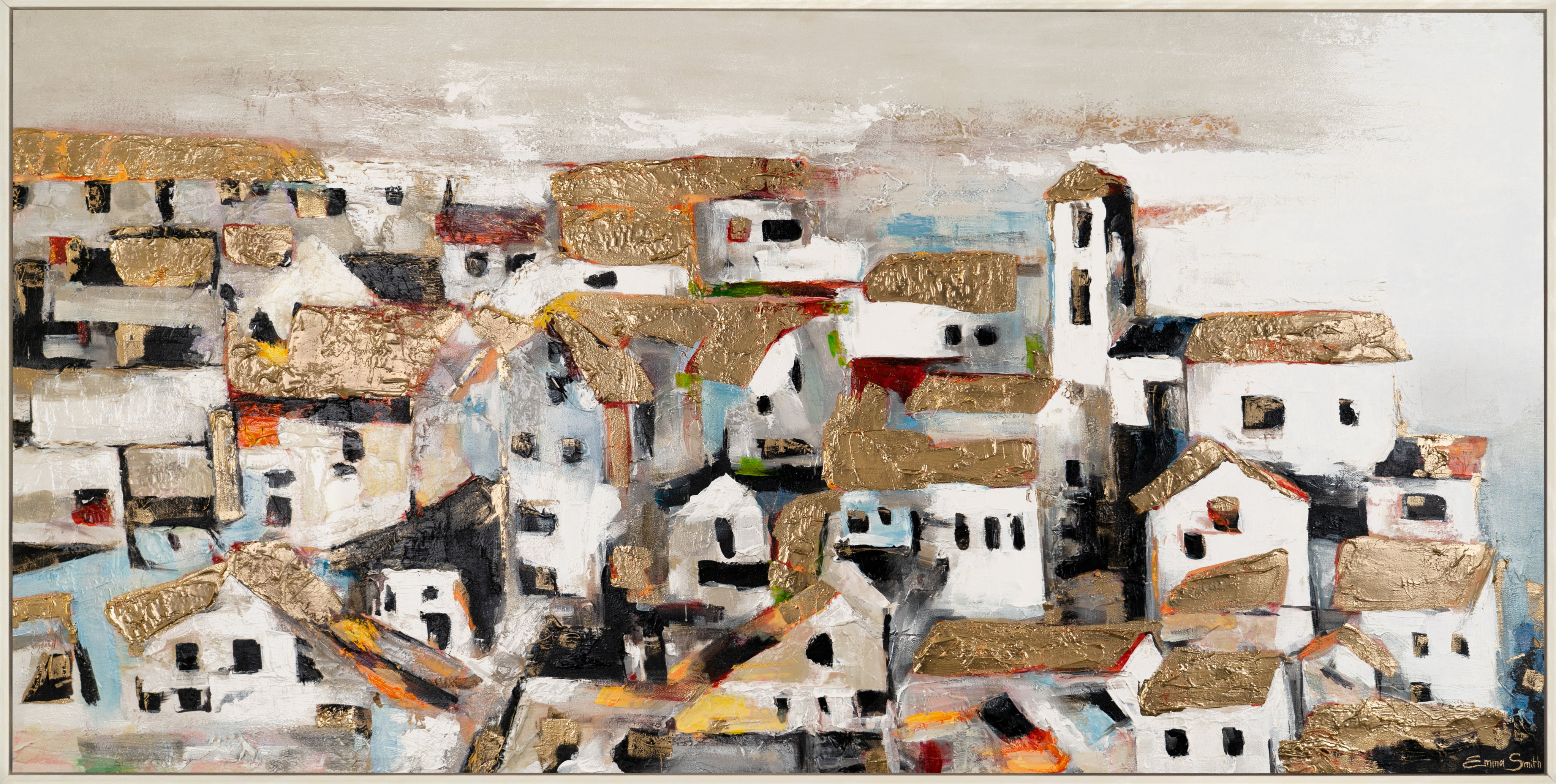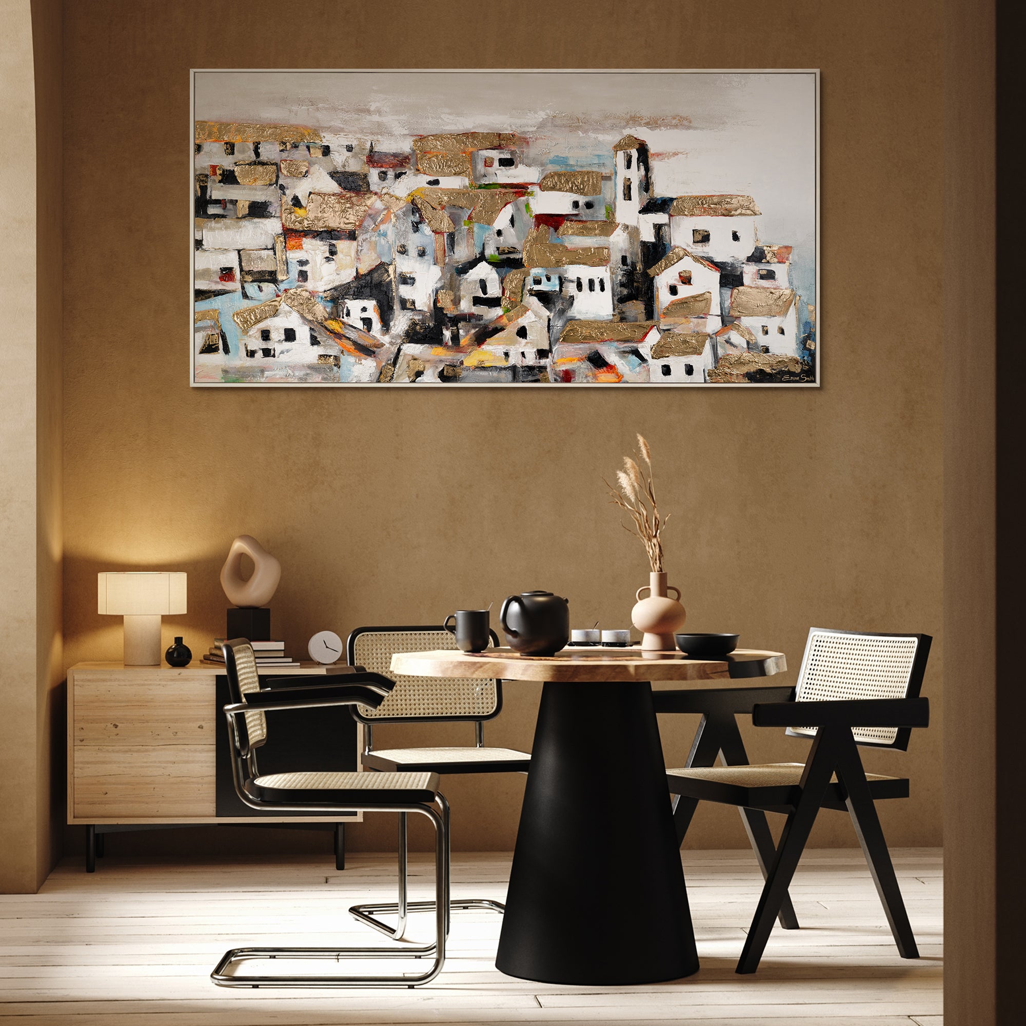 Enriquezca su hogar u oficina con esta pintura abstracta colorida, que representa un paisaje urbano pintoresco en tonos vivos. El cuadro destaca por sus colores intensos y pinceladas expresivas. Está 100% pintado a mano y realzado con un elegante marco dorado moderno.