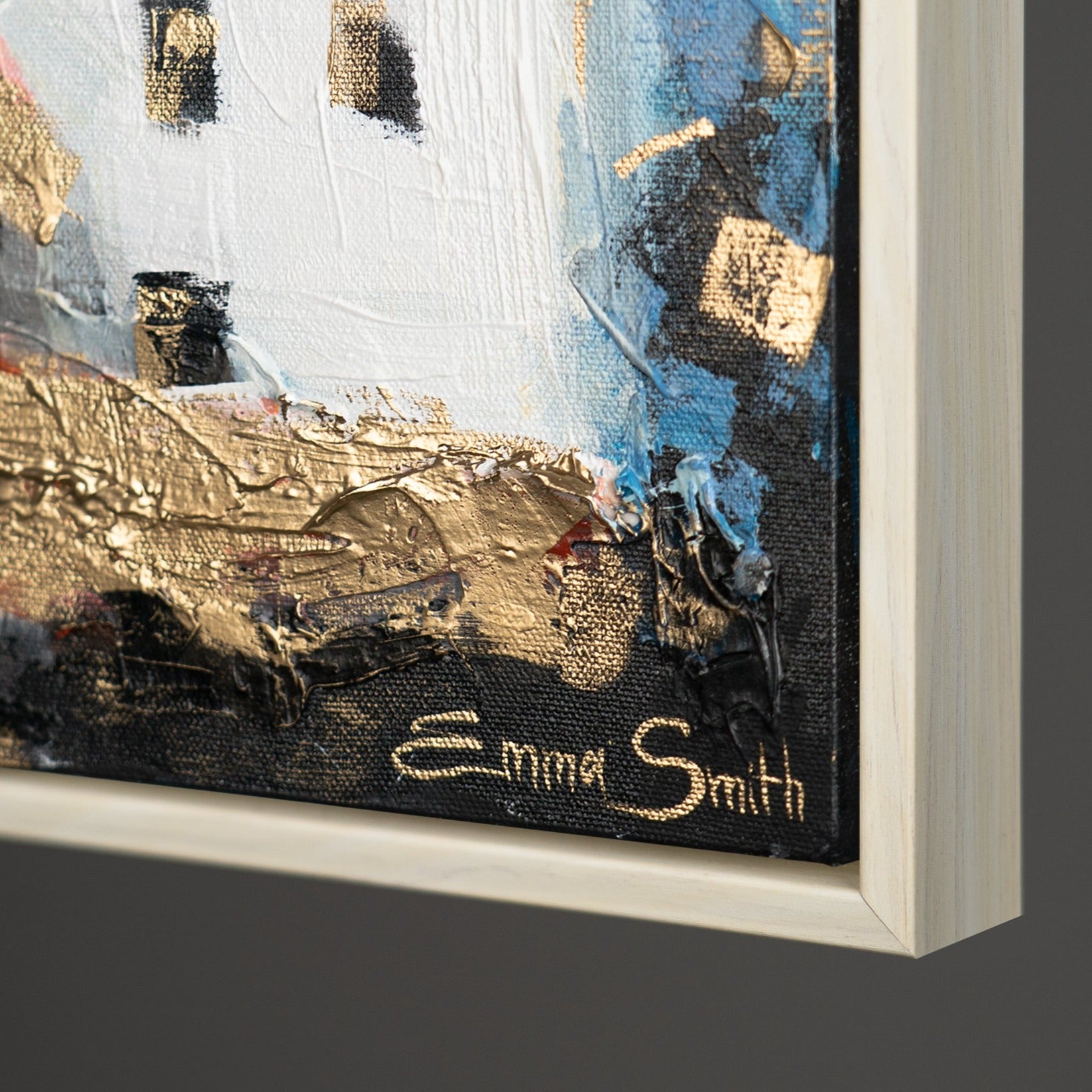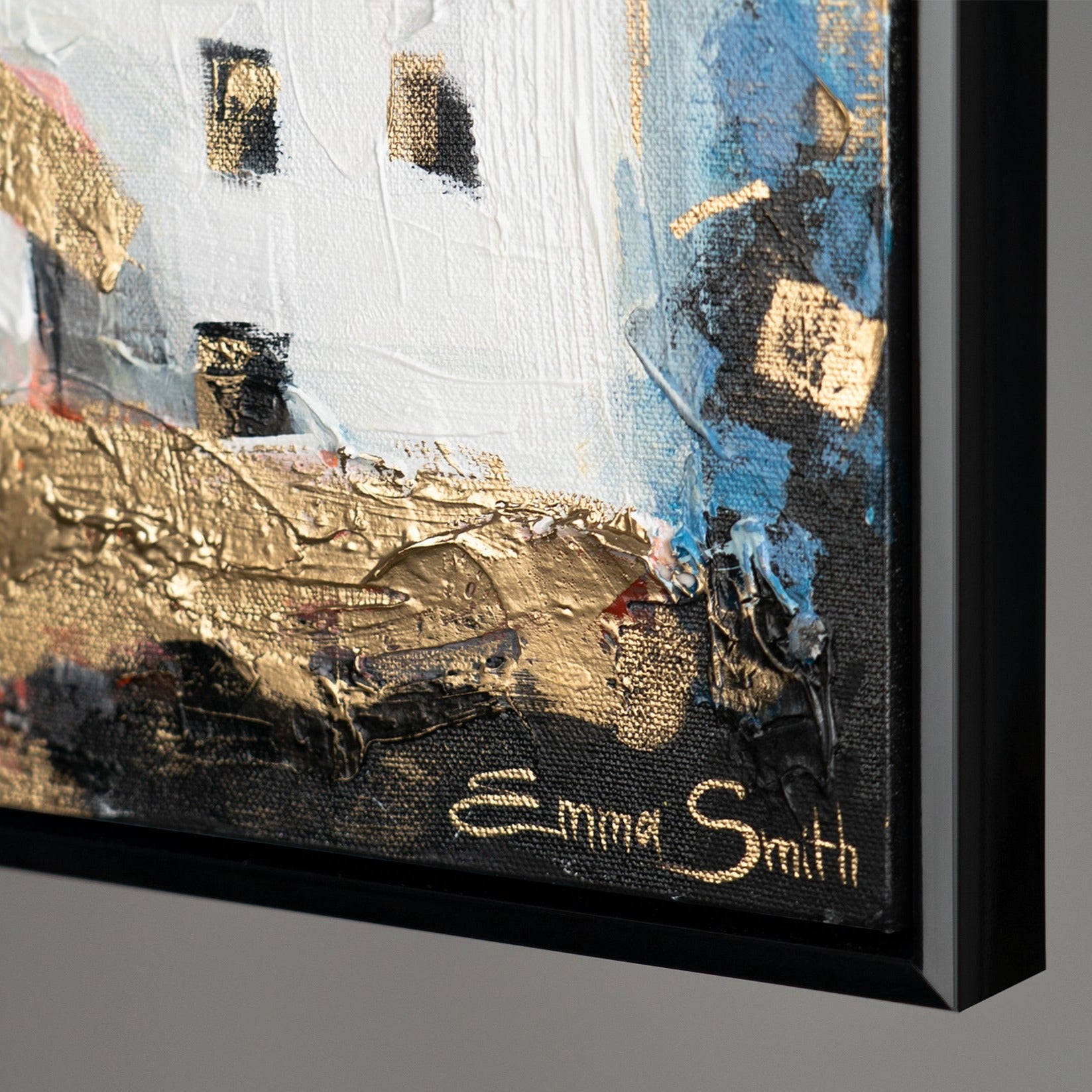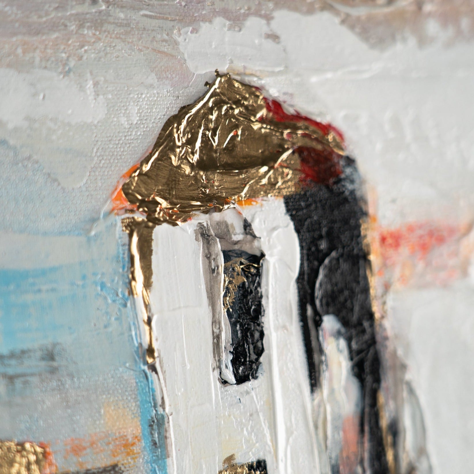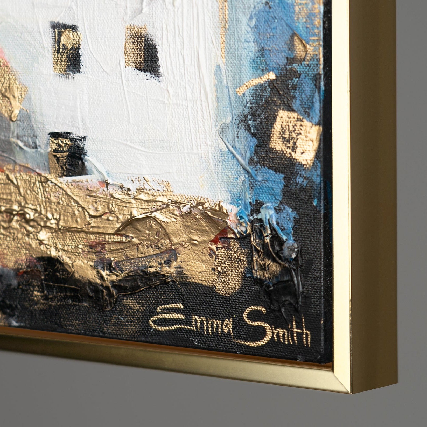 Enriquezca su hogar u oficina con esta pintura abstracta colorida, que representa un paisaje urbano pintoresco en tonos vivos. El cuadro destaca por sus colores intensos y pinceladas expresivas. Está 100% pintado a mano y realzado con un elegante marco dorado moderno.