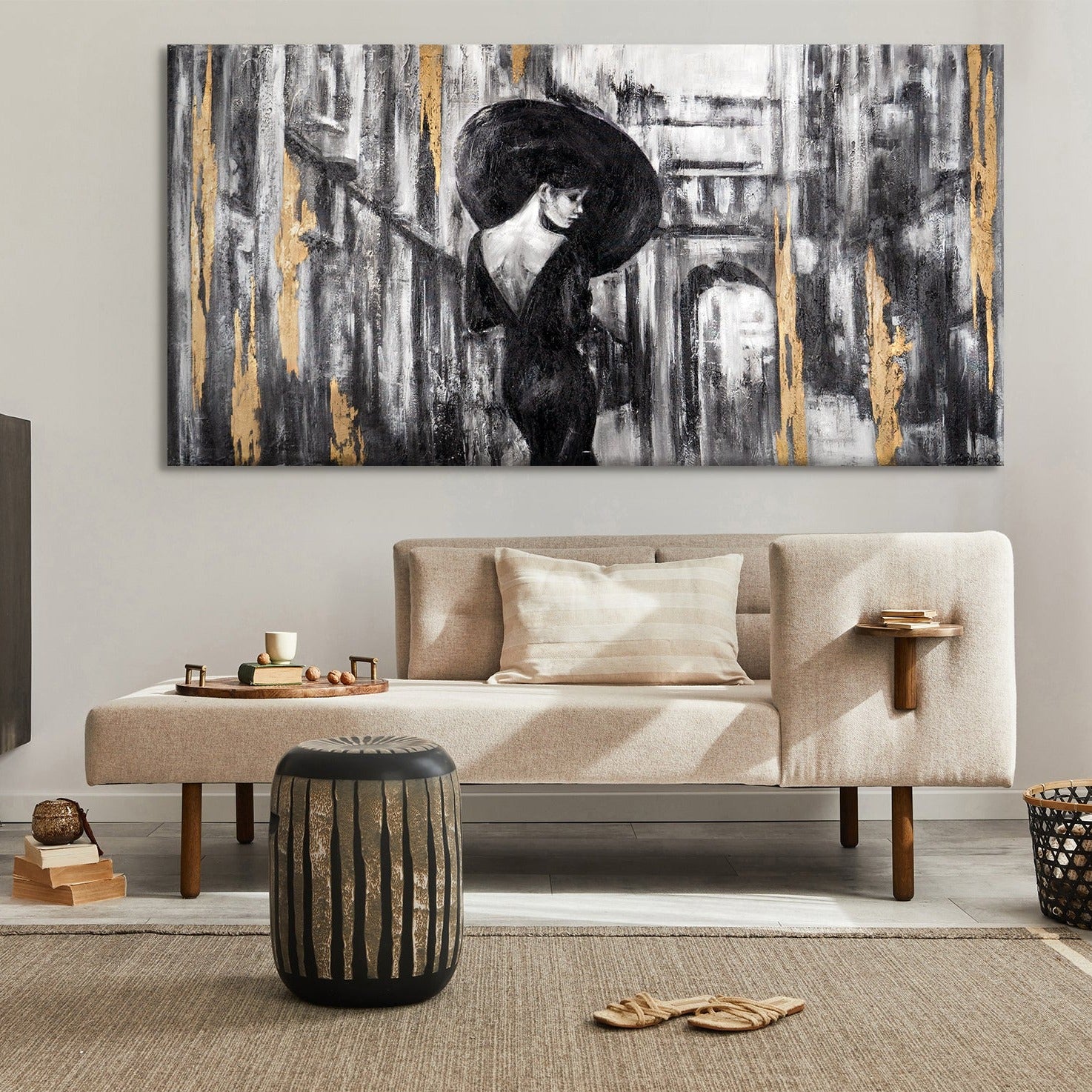 Aporta un toque de elegancia a tu salón con esta obra de arte moderna. La figura de una mujer elegante, vestida de negro y con sombrero, sobre un fondo en tonos blanco, negro y dorado, crea una atmósfera cautivadora que realza cualquier espacio.