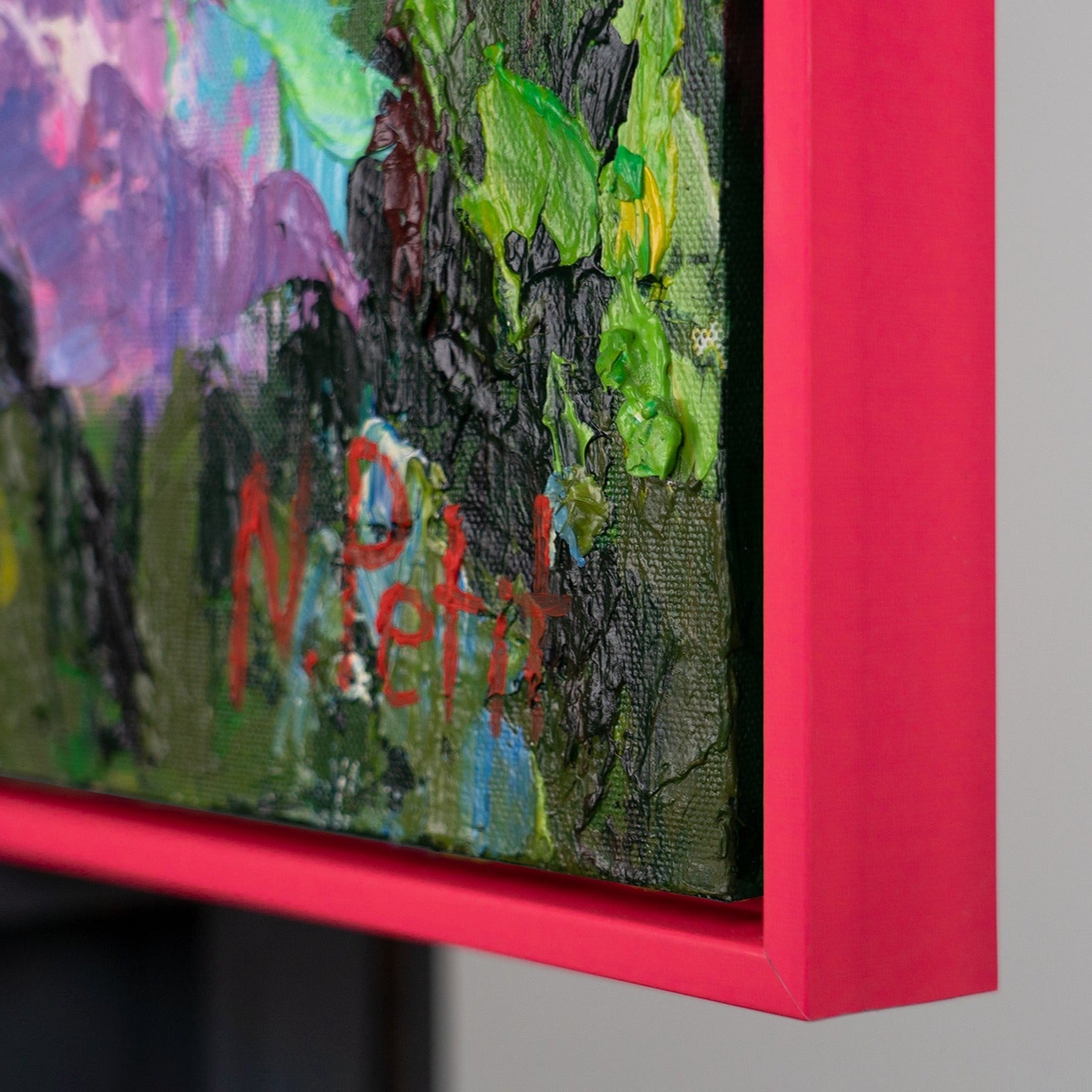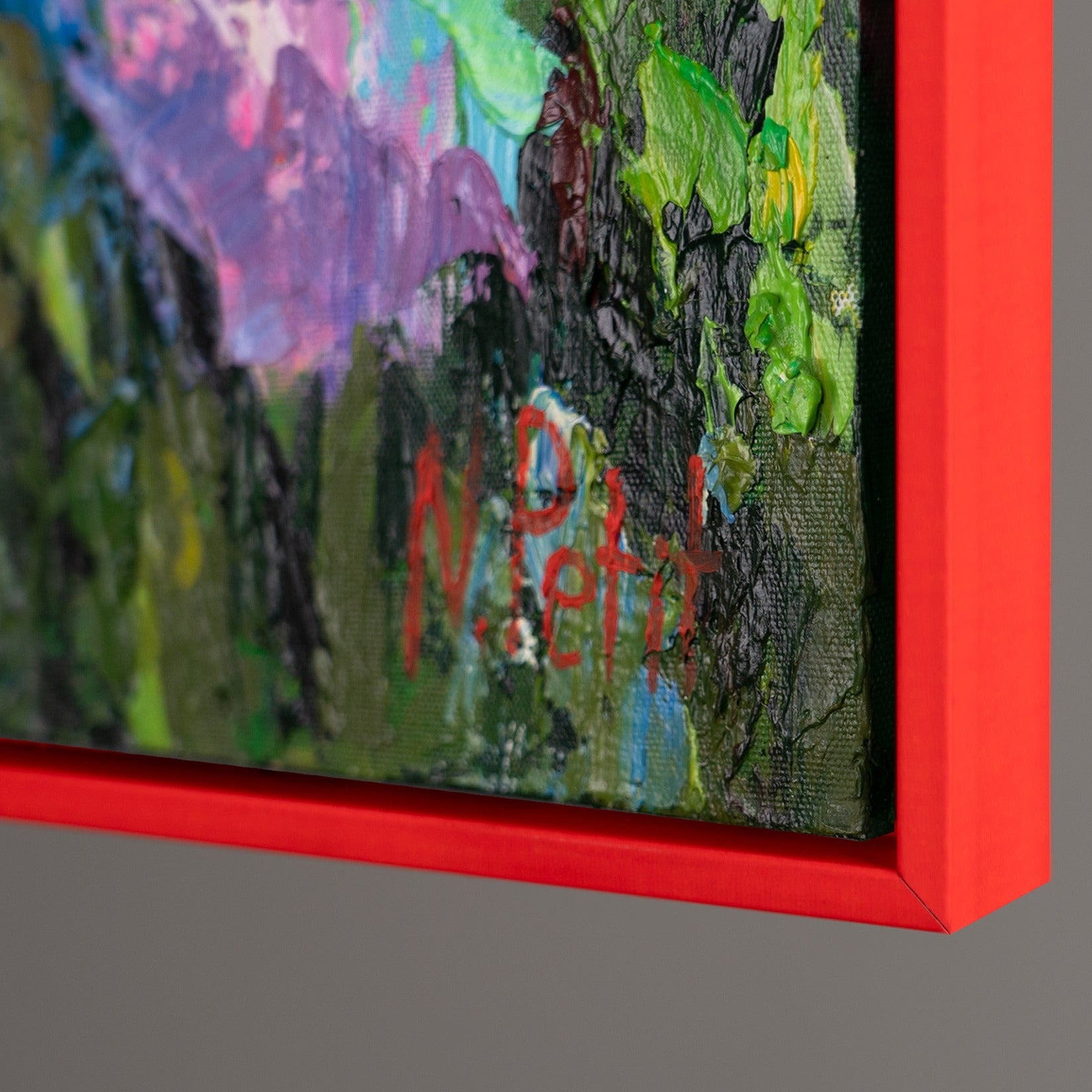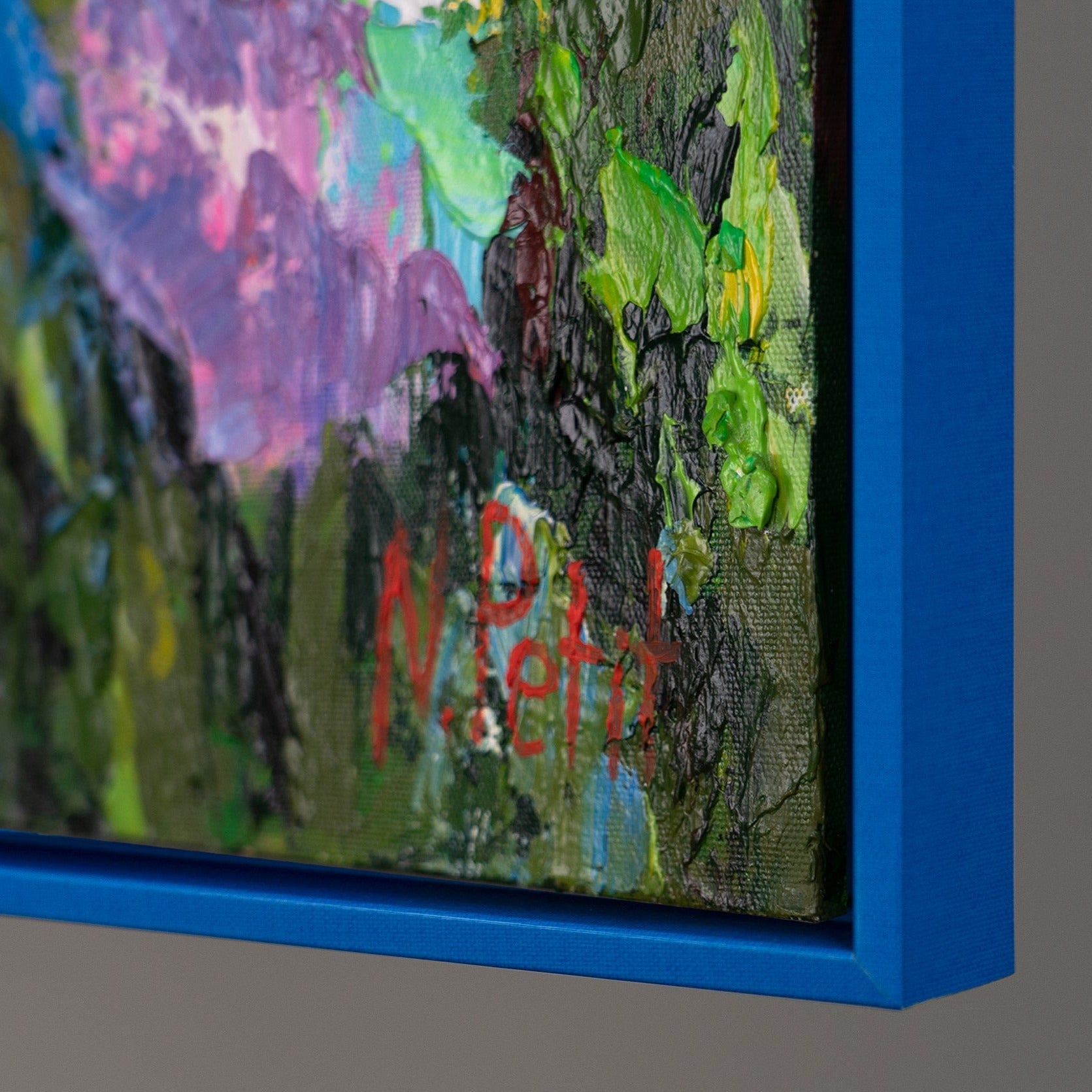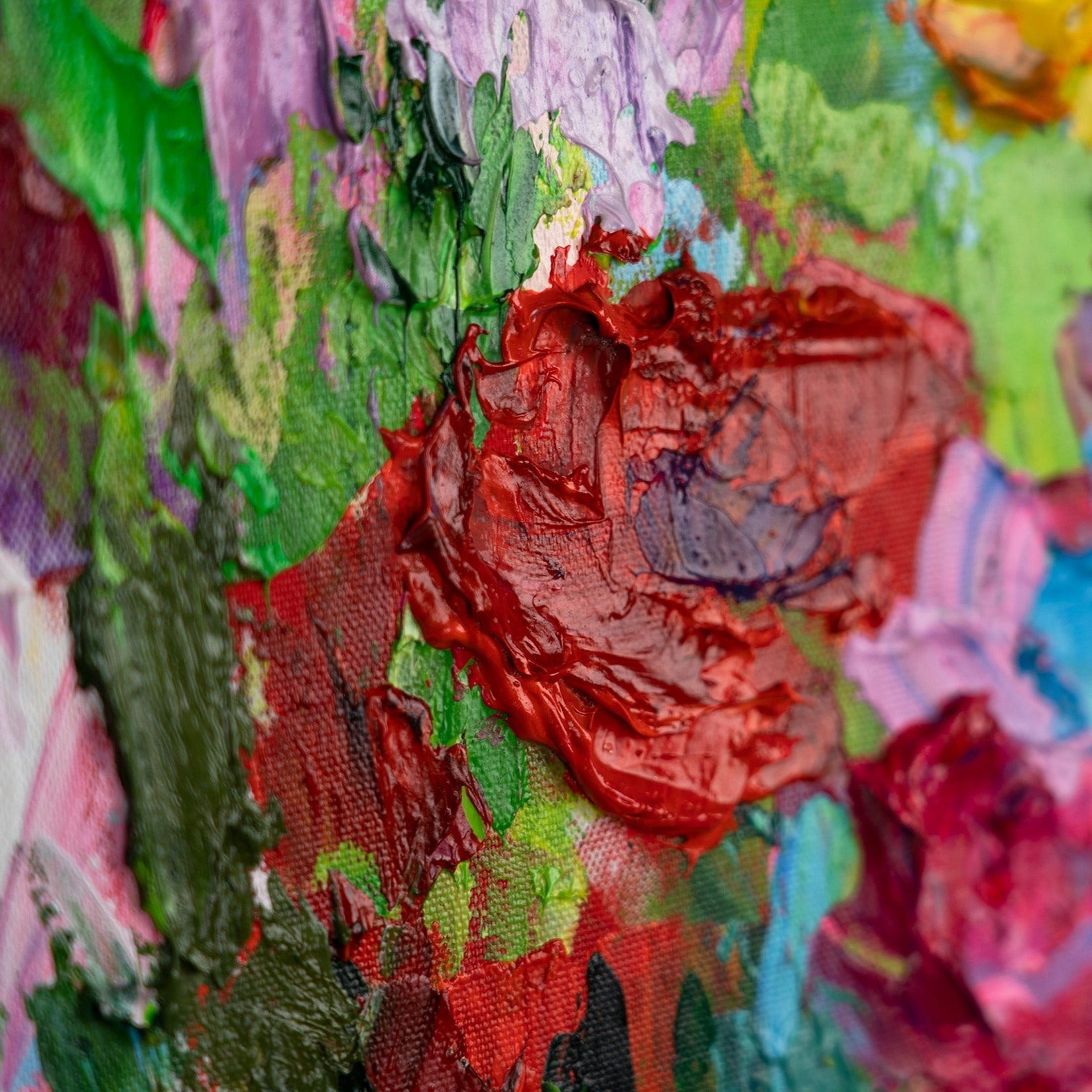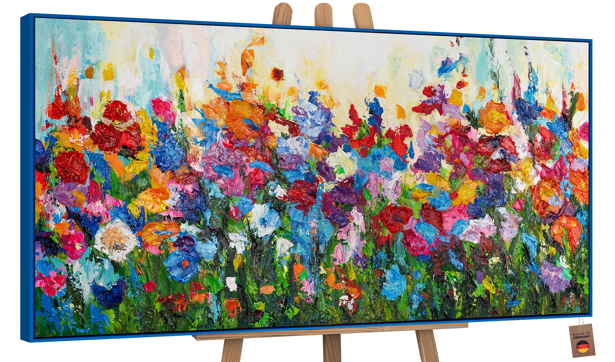 Enriquece tu hogar u oficina con esta colorida obra de arte abstracta que representa un campo de flores vibrante. La pintura destaca por sus intensos contrastes y sus expresivas pinceladas. Está 100% pintada a mano y realzada con un elegante marco azul que resalta su carácter moderno.