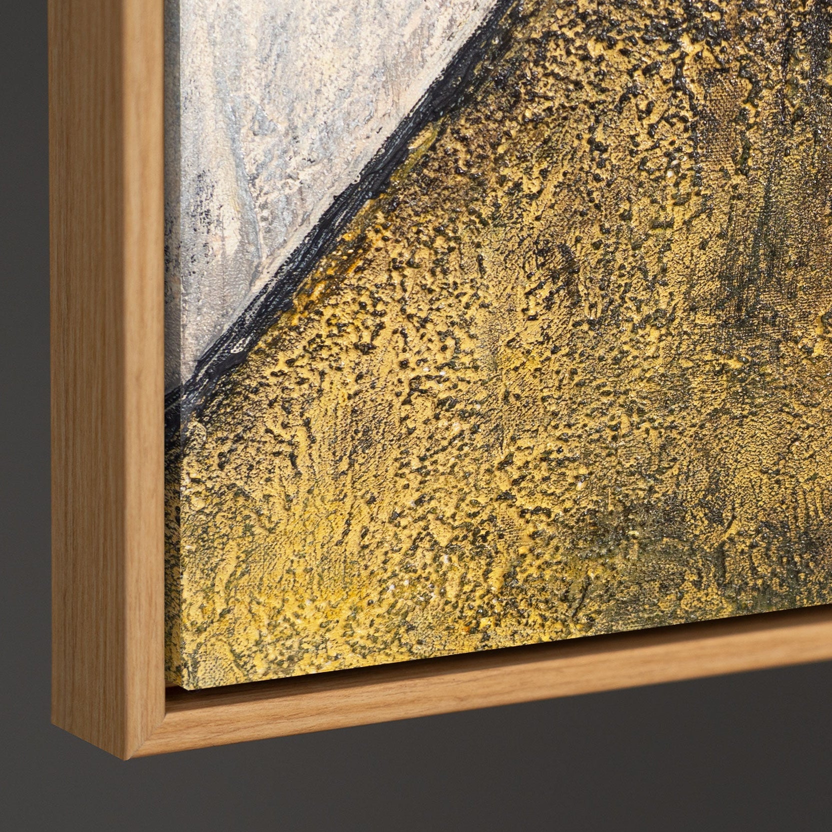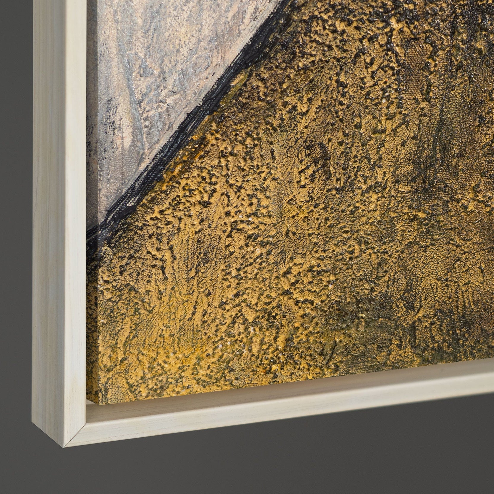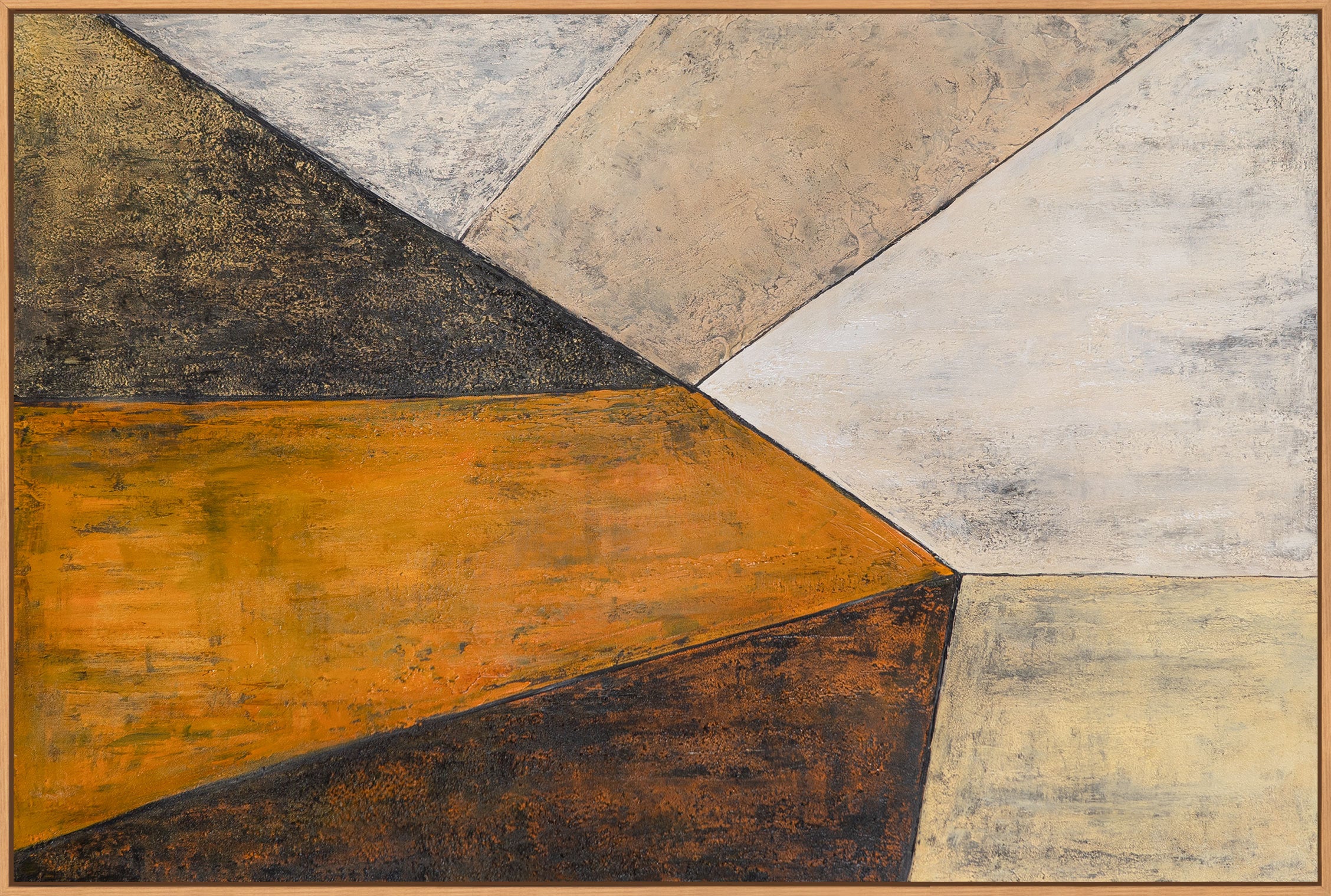 "Encuentro de Planos" es una pintura acrílica abstracta pintada a mano con áreas claramente definidas y una composición geométrica dinámica. Los cálidos tonos ocre y beige se combinan con acentos oscuros y texturas claras, creando un efecto visual equilibrado.