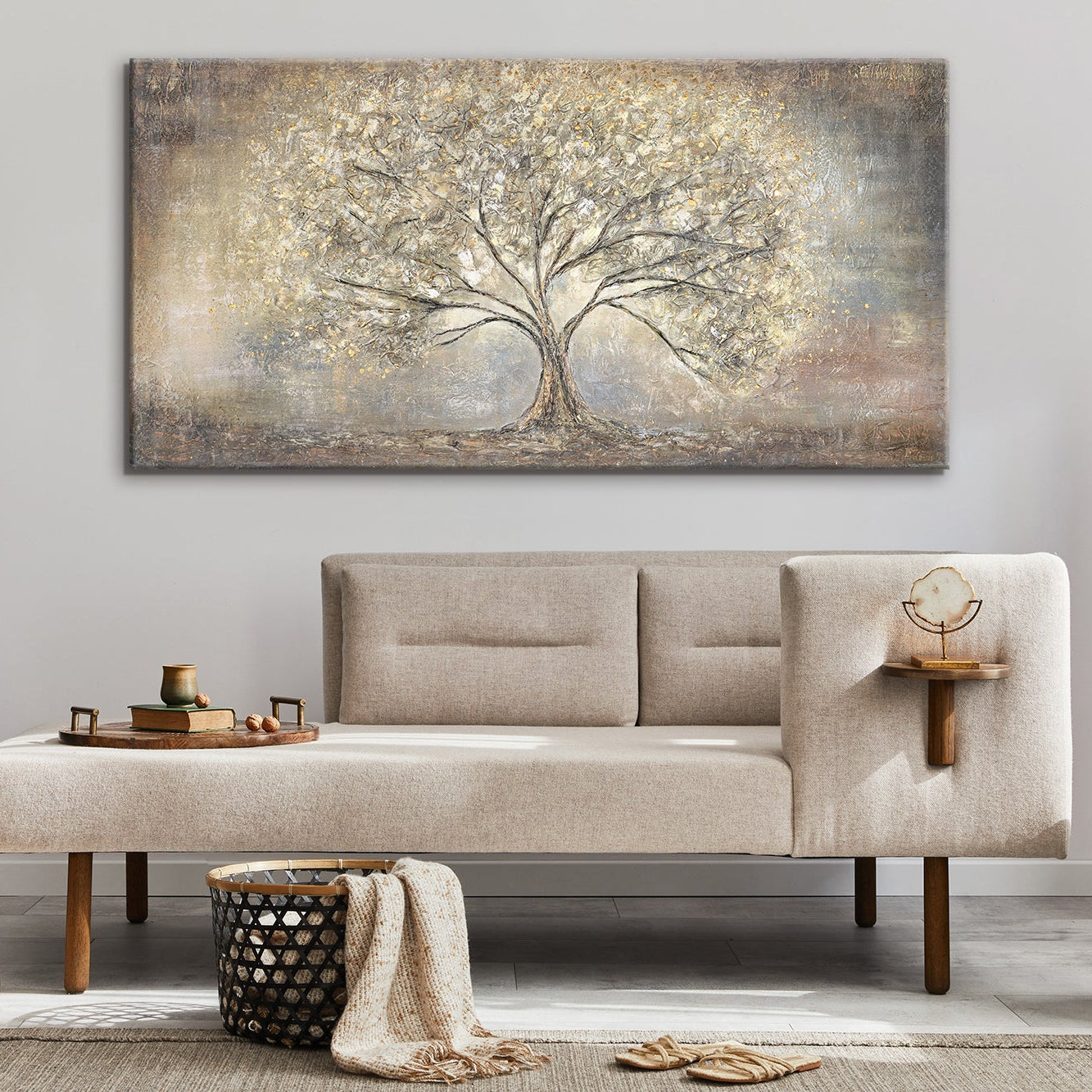 Enriquece tu hogar u oficina con esta elegante obra de arte abstracta que representa un árbol majestuoso en tonos dorados y grises suaves. La pintura destaca por sus contrastes marcados y sus pinceladas expresivas, que crean una textura fascinante y una atmósfera sofisticada. Está 100% pintada a mano y realzada con un marco negro moderno que resalta su estilo contemporáneo.