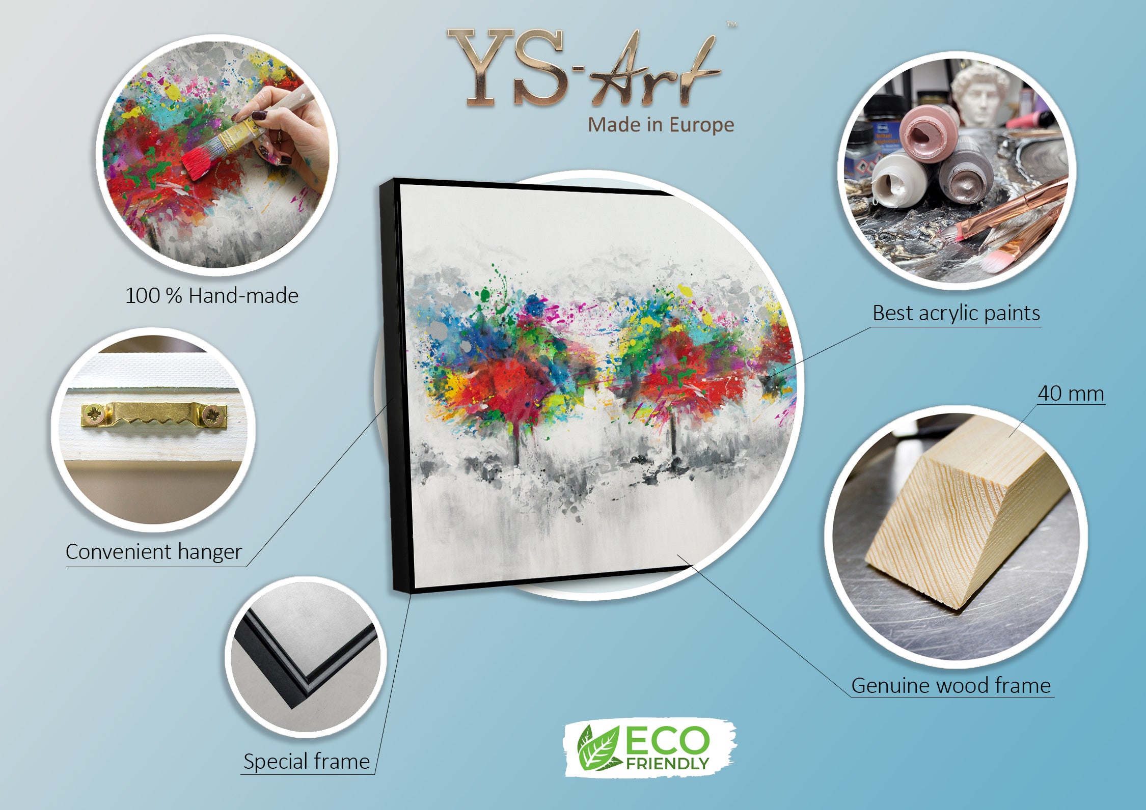Para nuestros cuadros acrílicos, solo utilizamos materiales de alta calidad que son ecológicos y seguros para la salud. El lienzo se tensa sobre un bastidor de madera natural y tratamos la superficie con un barniz acrílico a base de agua para garantizar que los colores se mantengan saturados durante muchos años.
