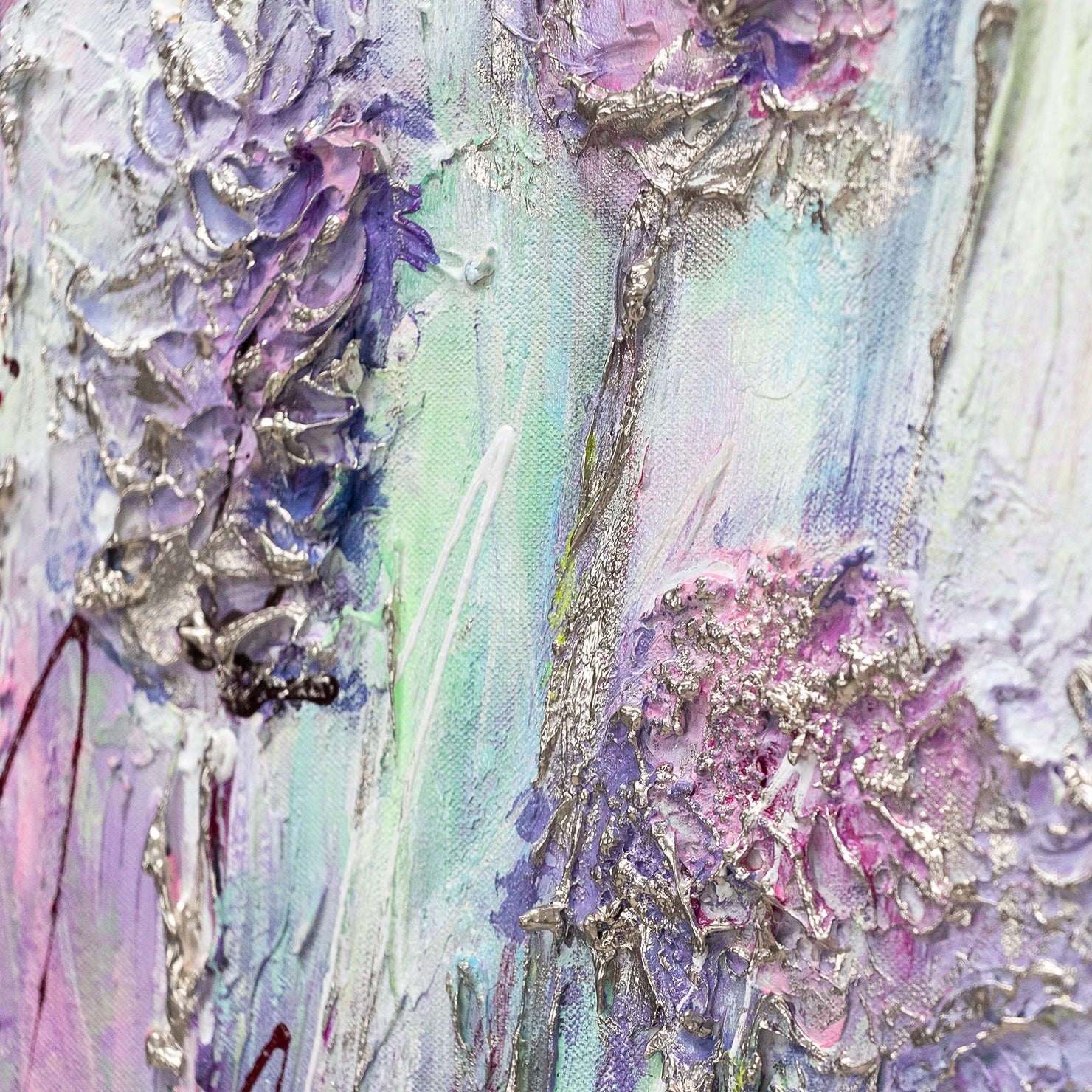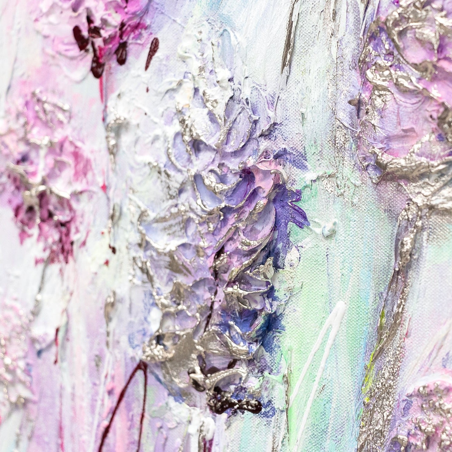 Se utilizaron acrílicos, pasta texturizada y un toque de hoja de oro para resaltar la elegancia de estas flores primaverales.