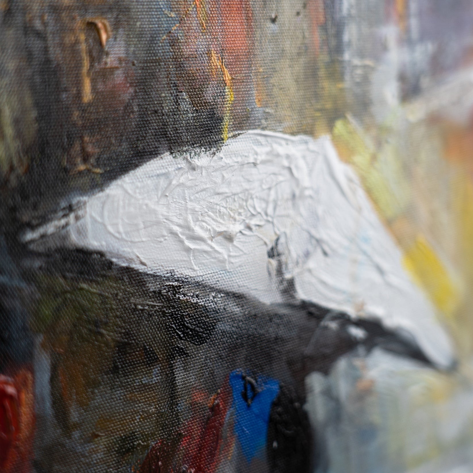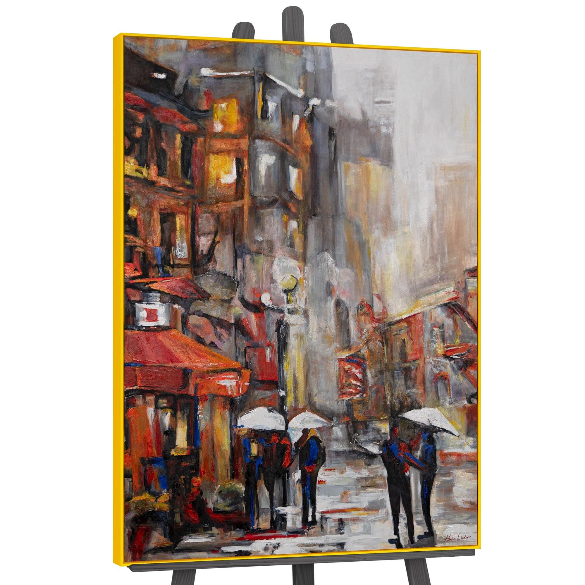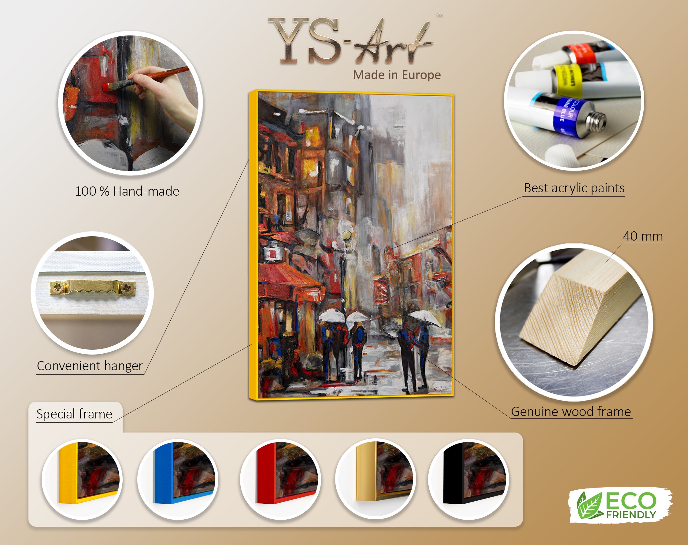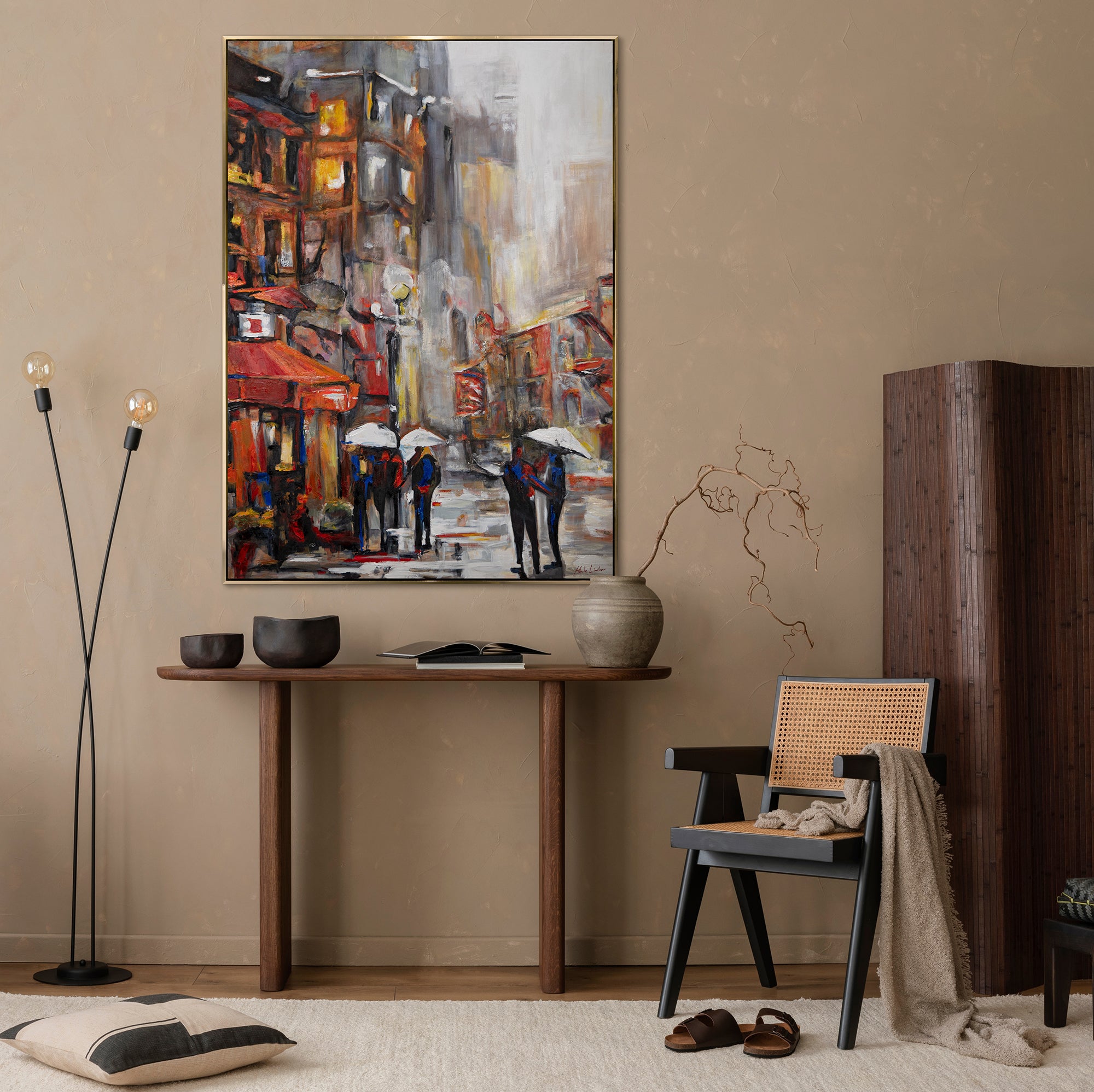 Esta pintura acrílica abstracta pintada a mano sobre lienzo muestra un paisaje urbano vibrante con impresionantes pinceladas y matices de color. Cada tono captura la dinámica y la atmósfera de la ciudad, mientras que figuras con paraguas dan vida a la escena. La pintura está completamente hecha a mano y le ofrece la posibilidad de elegir el color del marco según sus preferencias personales. Ya sea que prefiera un estilo moderno o clásico, este marco se adaptará perfectamente a su ambiente.