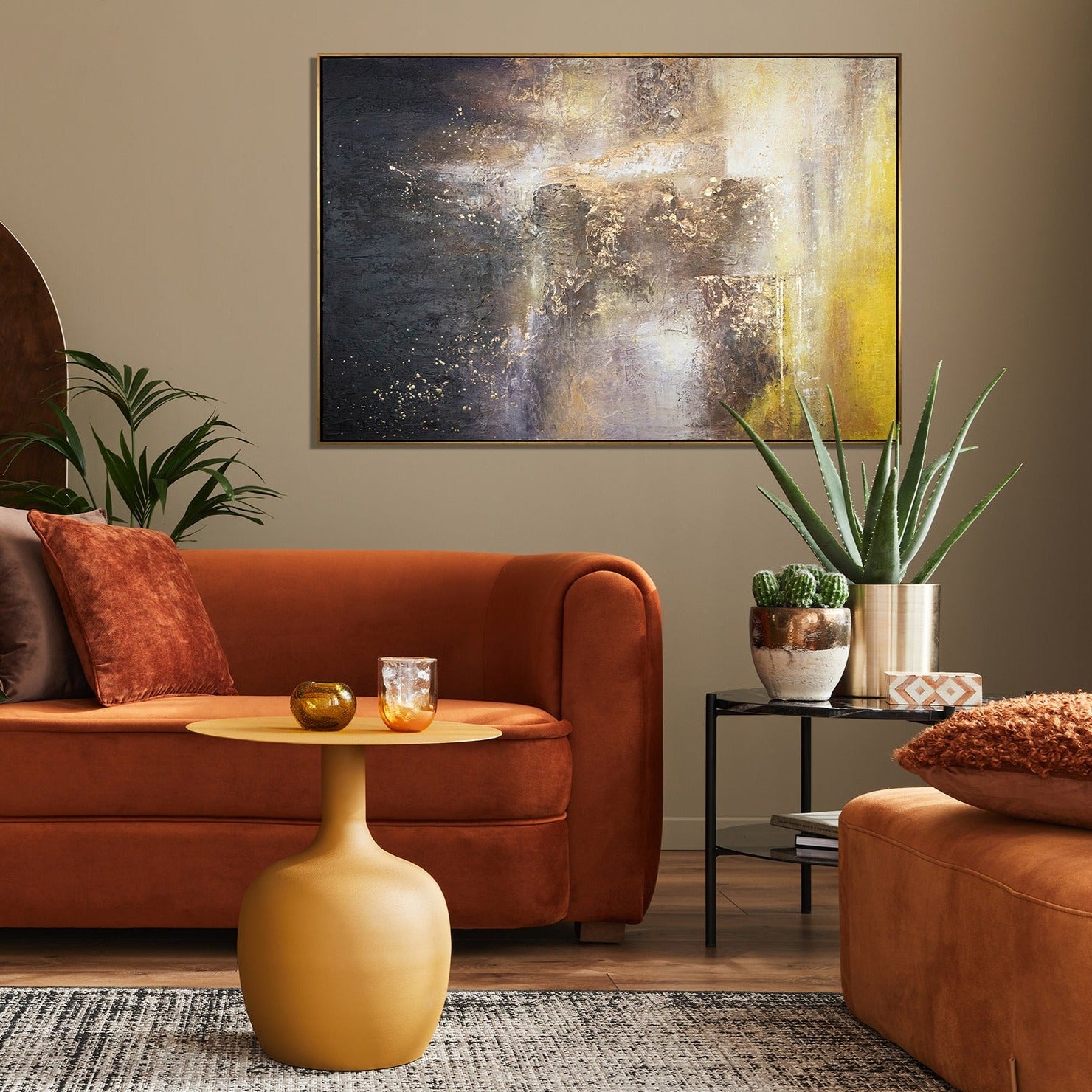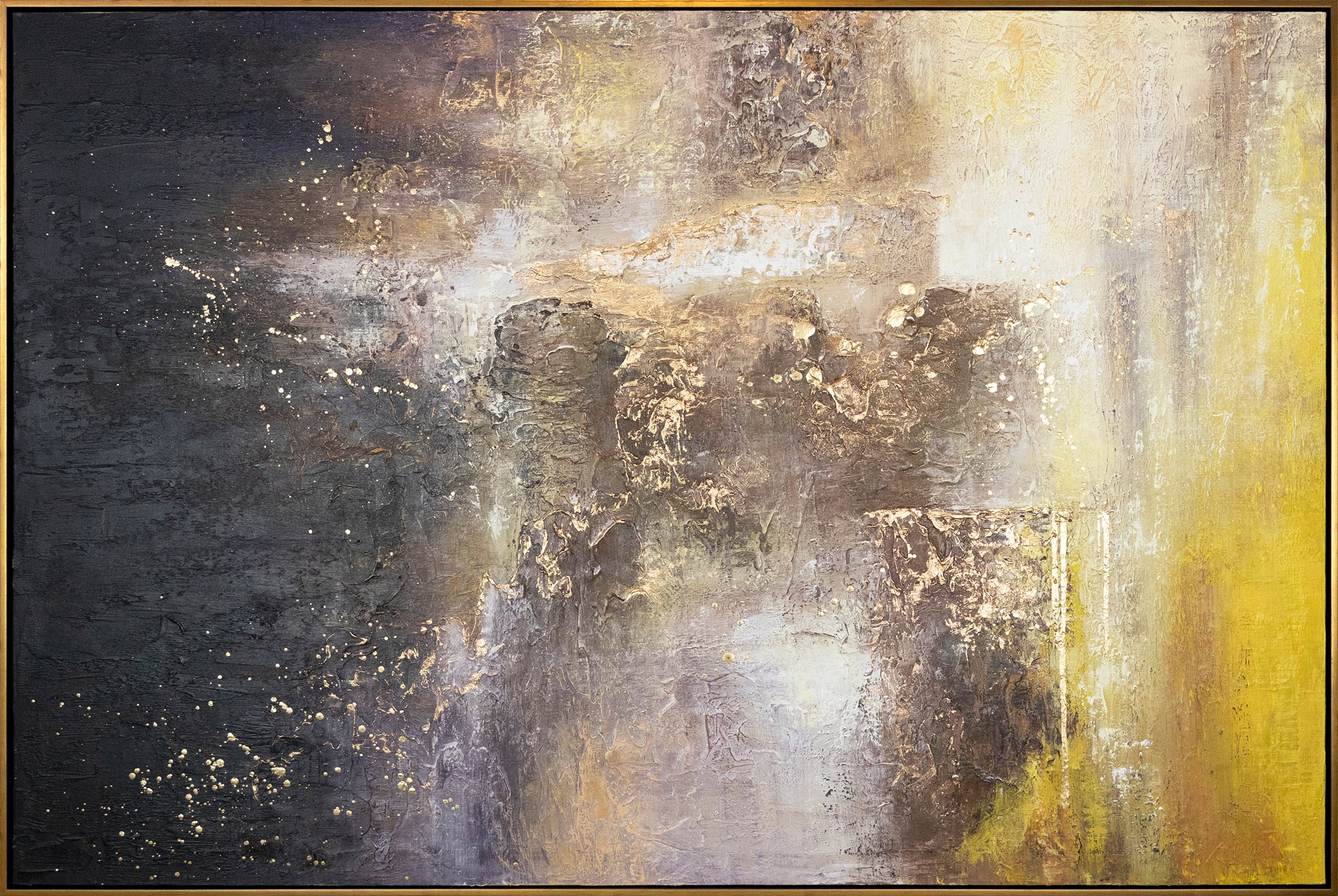 La pintura abstracta en negro y dorado es perfecta para las paredes de tu hogar. Este cuadro será el punto focal de la habitación, destacándose por su presencia. El cuadro viene enmarcado en un elegante marco dorado.