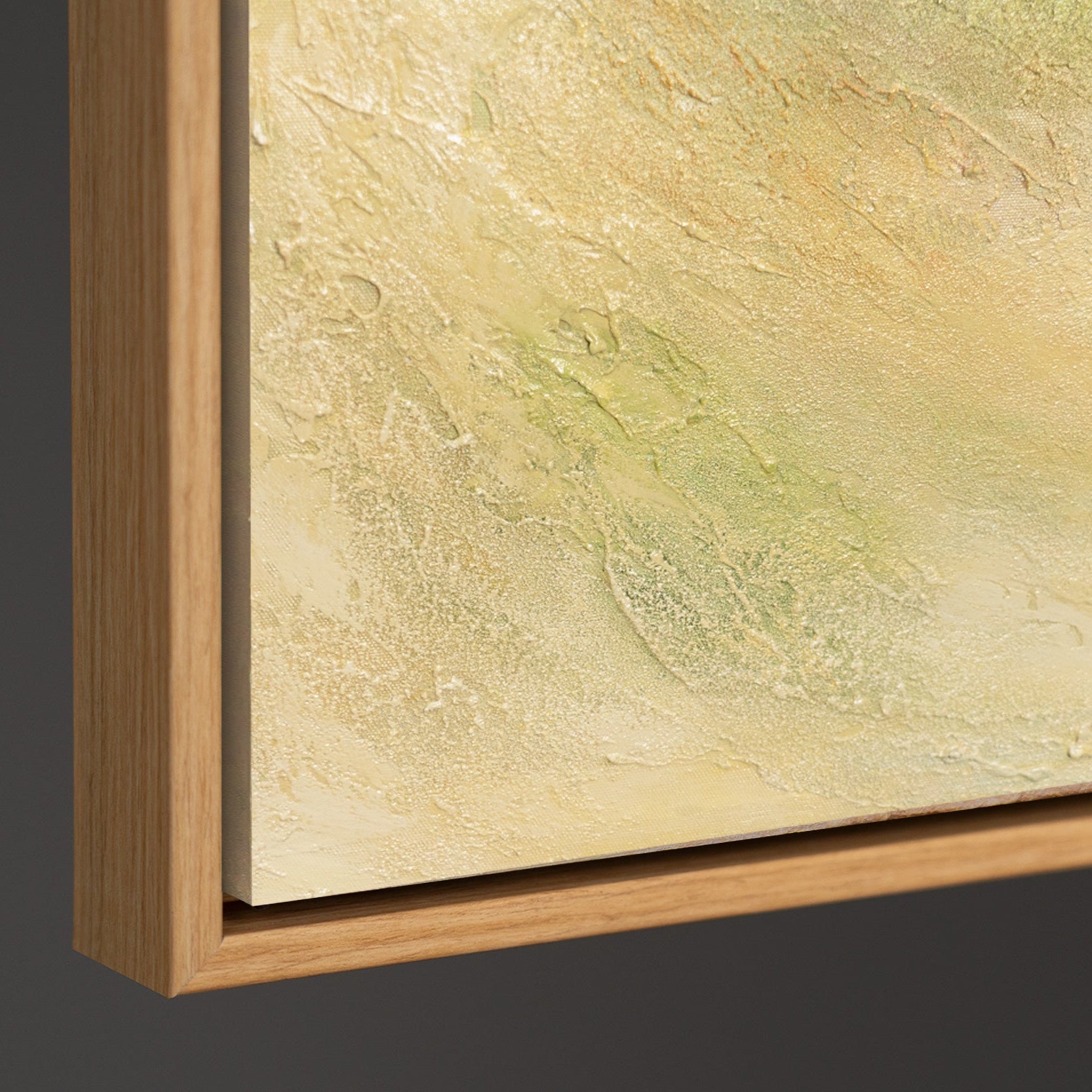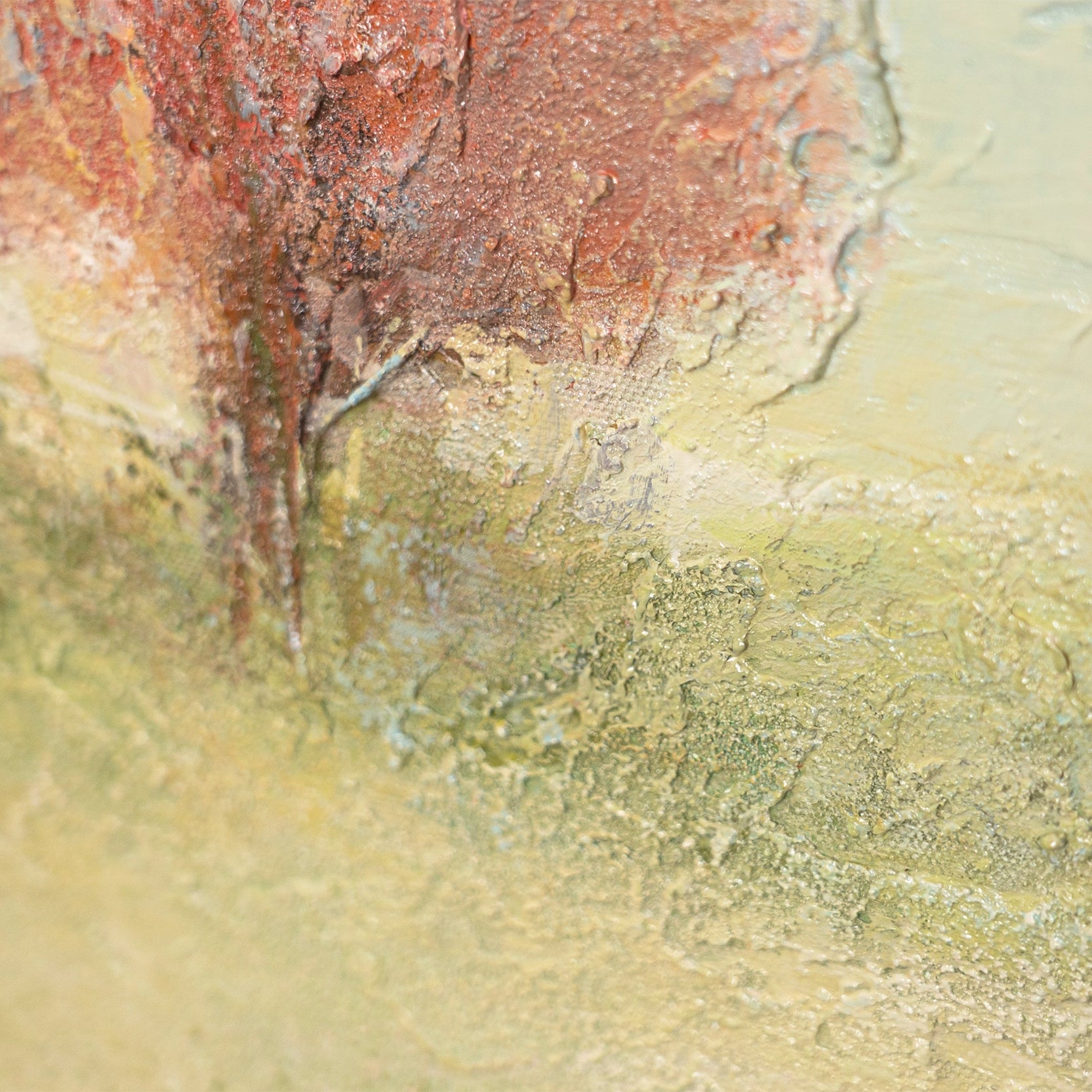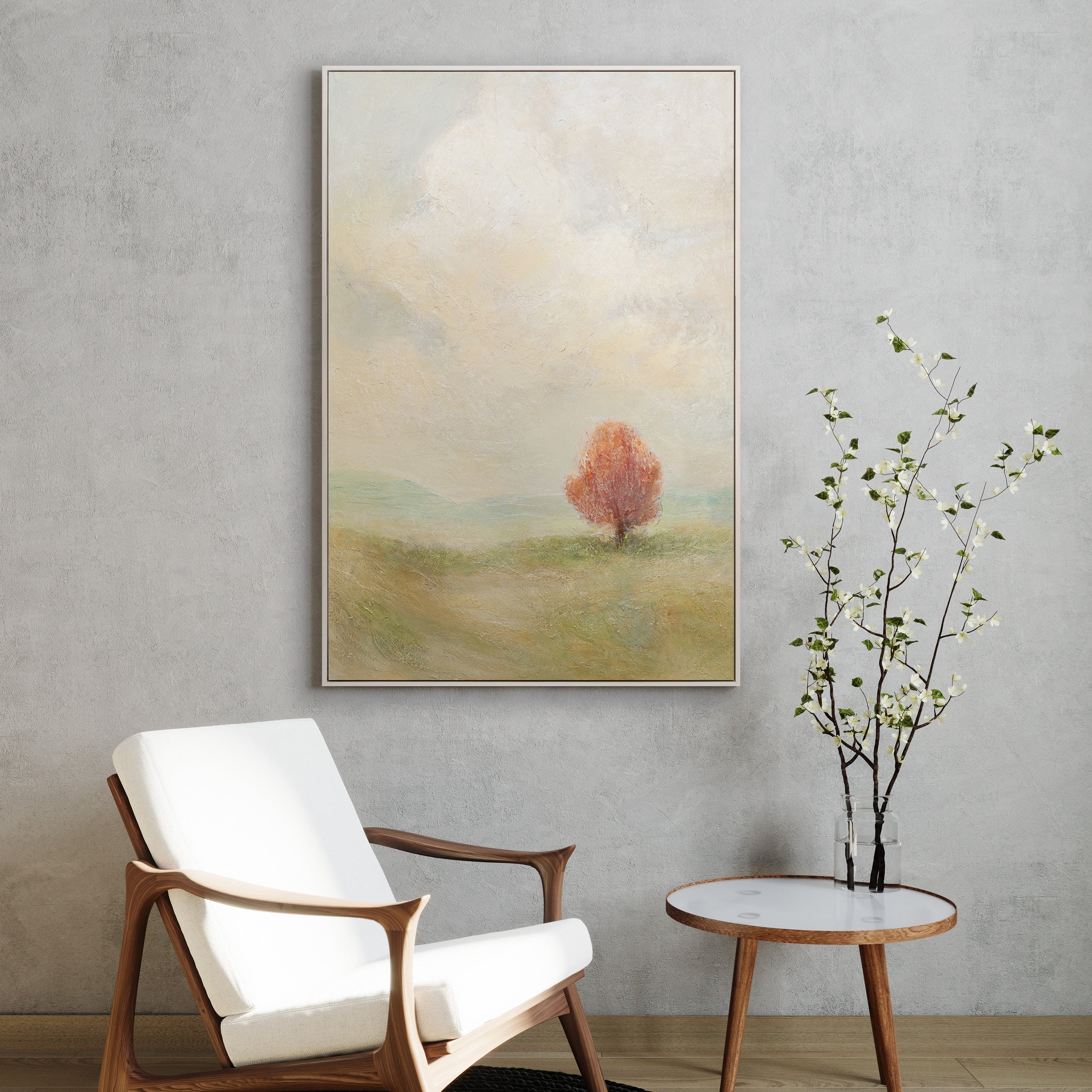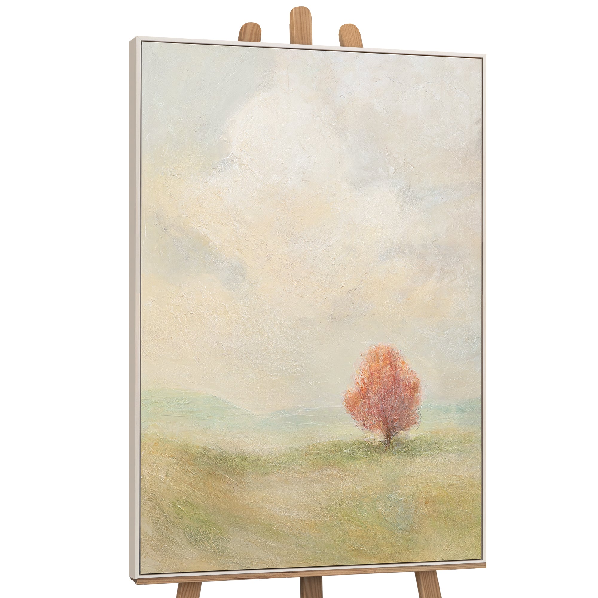 «Cálidos Espacios» te transporta a un paisaje tranquilo y luminoso donde un árbol solitario en suaves tonos albaricoque se convierte en el protagonista. Las delicadas transiciones de beige, verde y crema crean una sensación de paz y seguridad, mientras que la fina textura de la superficie da vida a la pintura.
