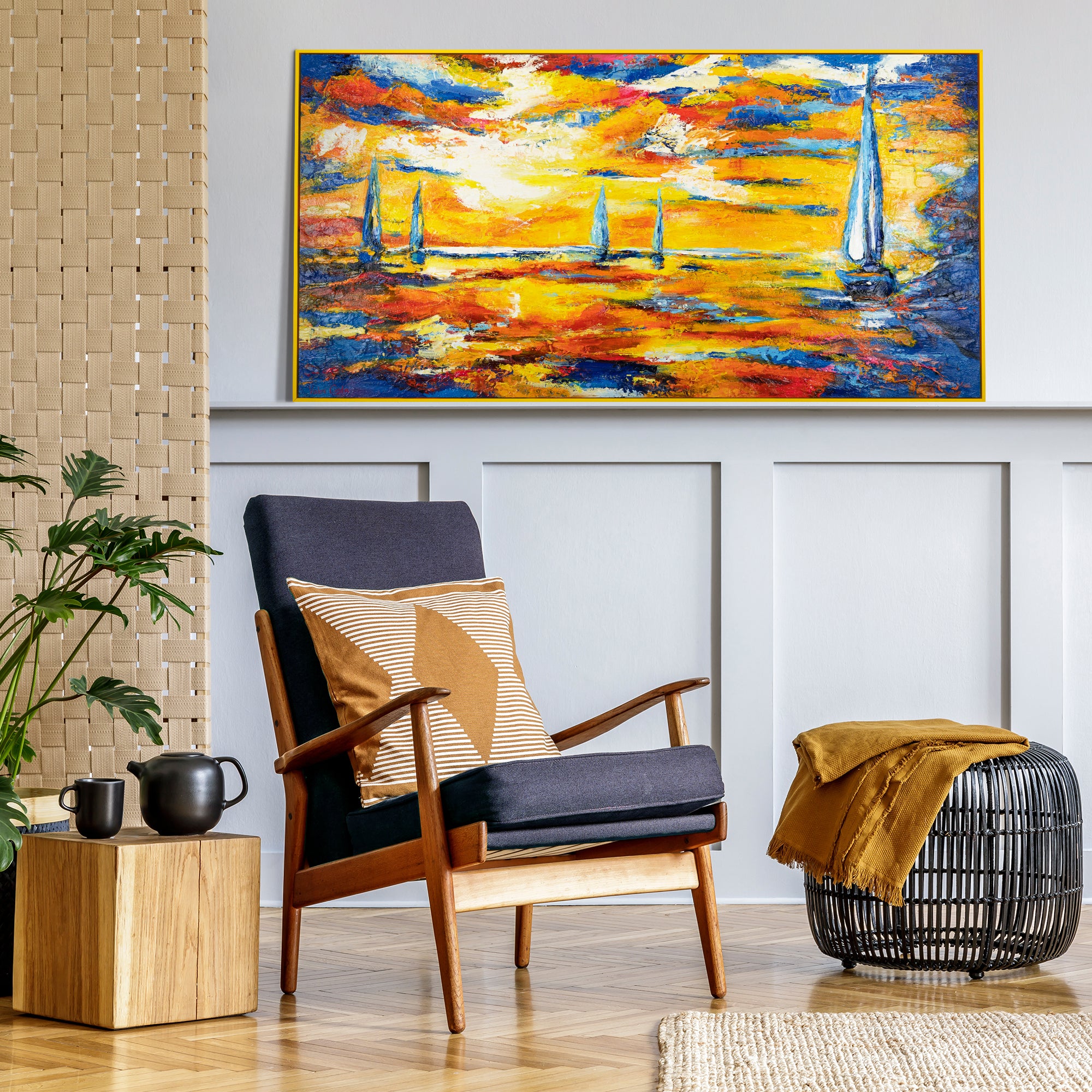 Pintado a mano sobre lienzo y en formato horizontal, este cuadro se convierte en un punto focal perfecto para interiores modernos, aportando frescura y elegancia a cualquier estancia.